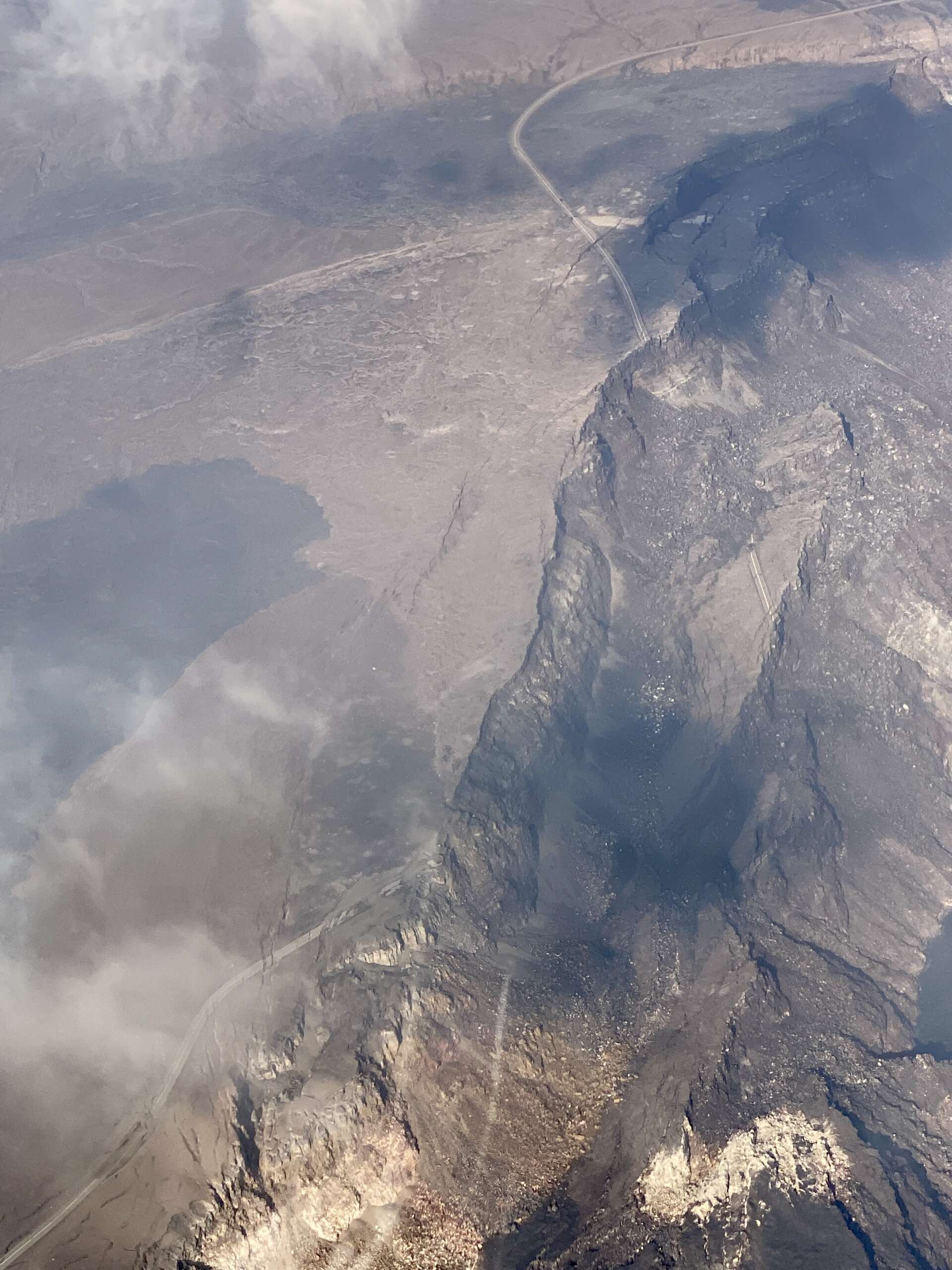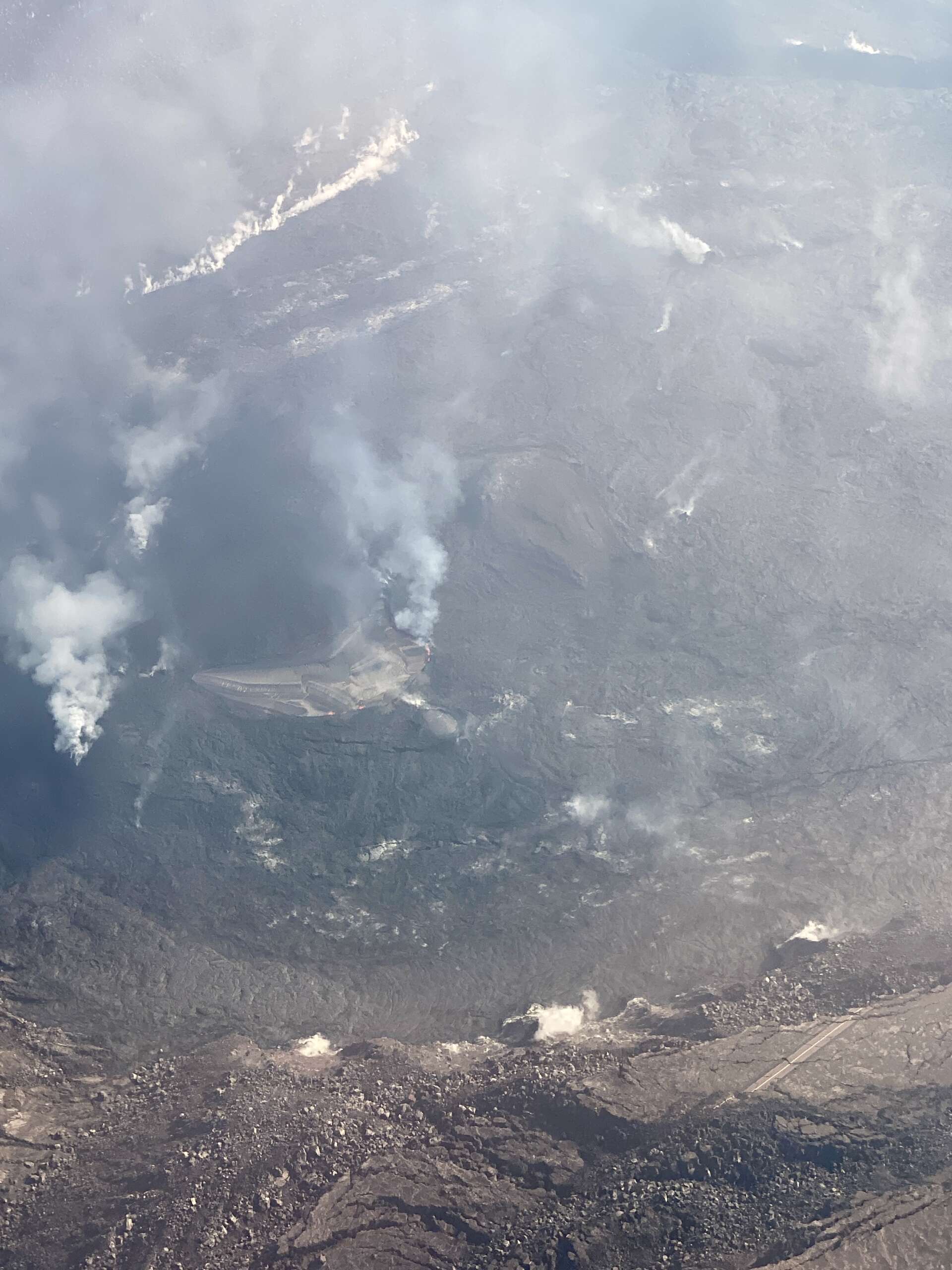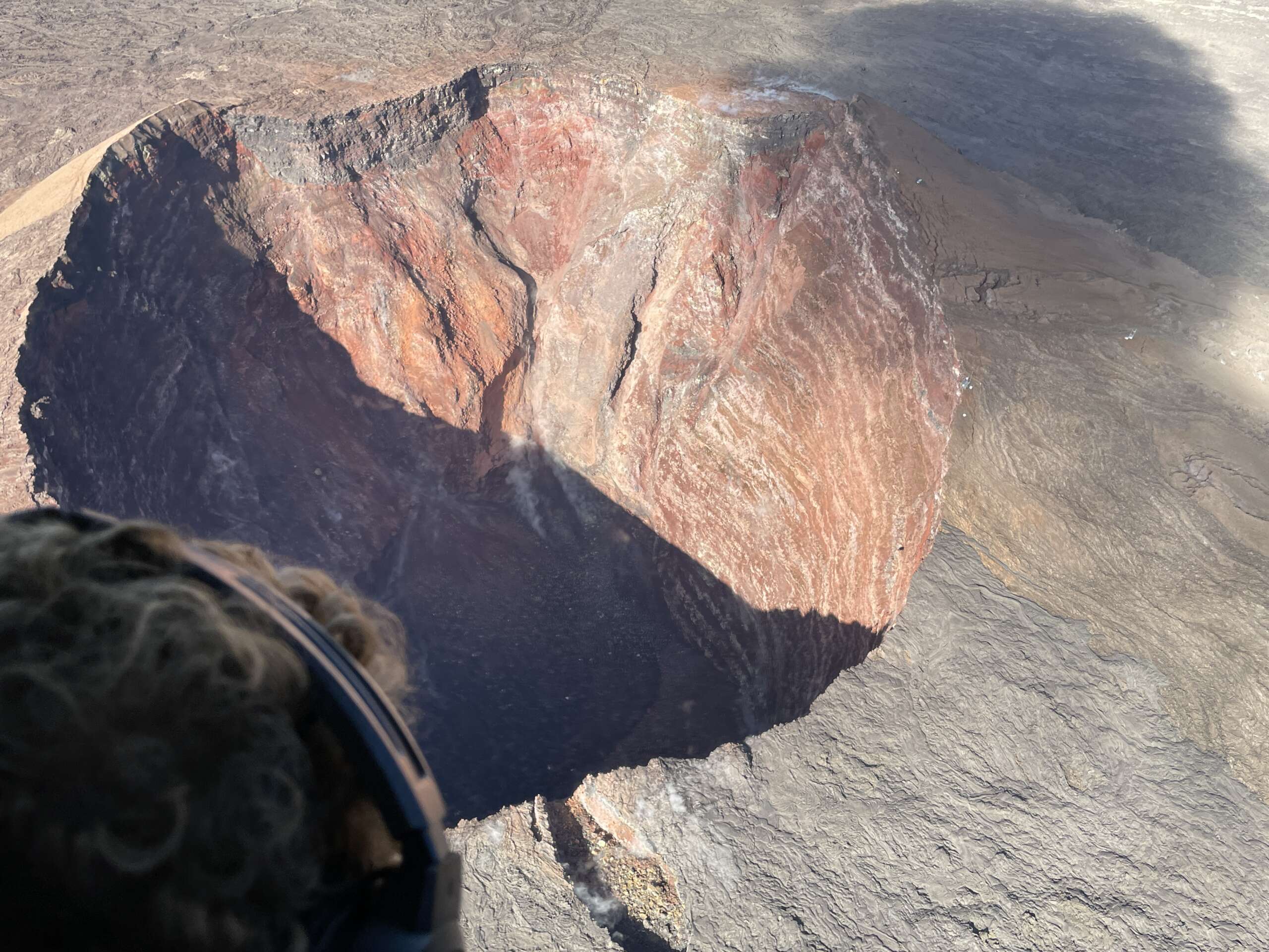 D’en haut, on perçoit mieux les dimensions et les impacts de la dernière éruption. Le cratère initial, et son agrandissement, qui représente désormais 3 à 4 fois à vue de nez le cratère originel.