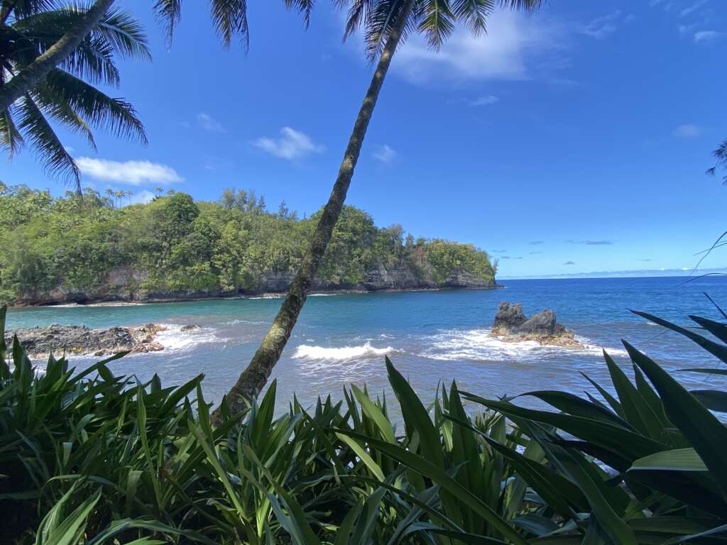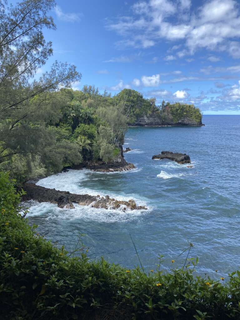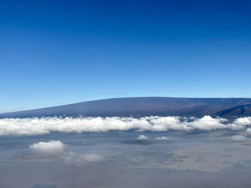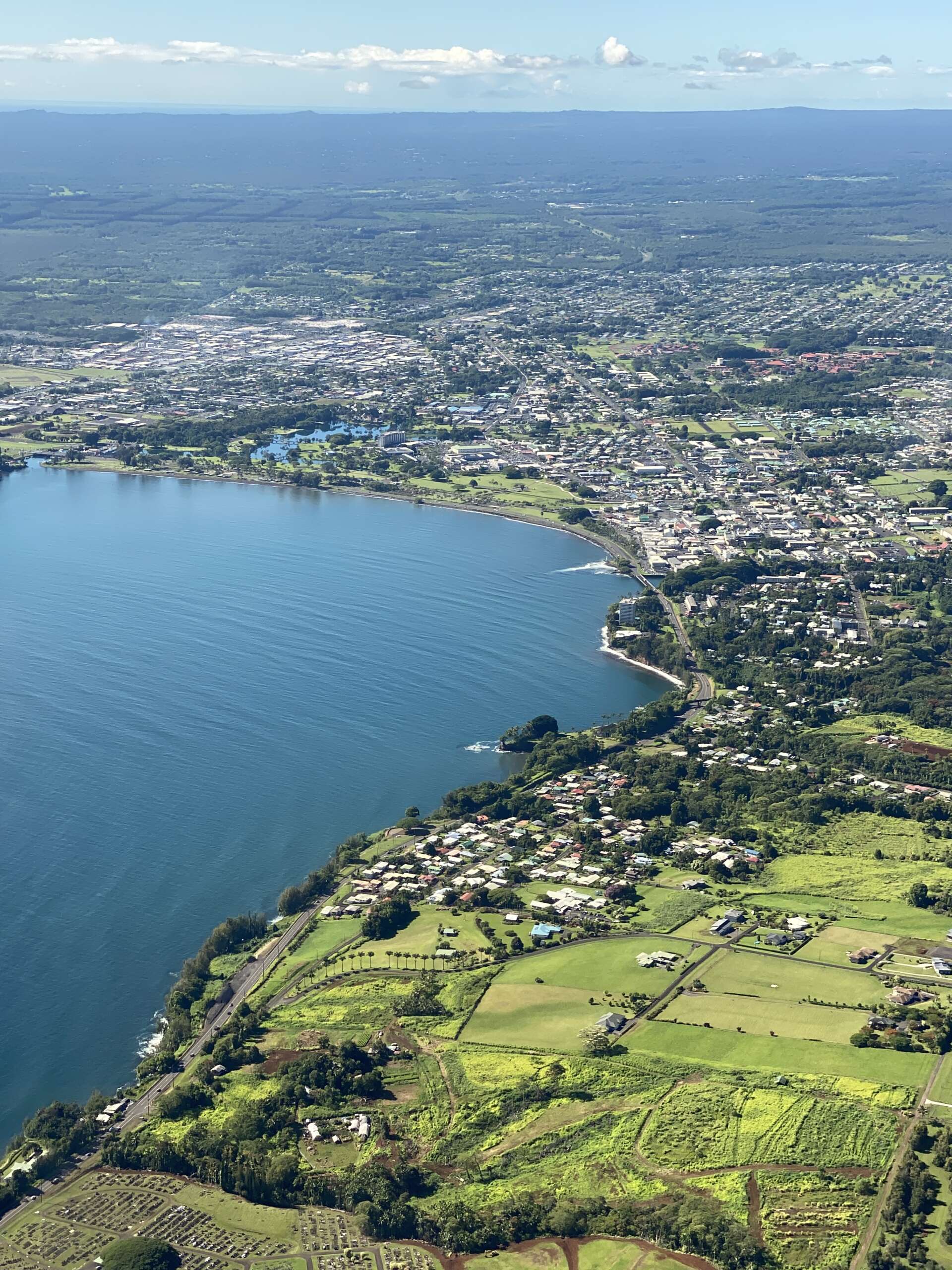 Sur le chemin du retour on s’éloigne un peu des cratères pour survoler des cascades en pleine jungle, puis on survole la baie d’Hilo. Par endroits on voit des coulées de lave en plein milieu de quartiers. Pas étonnant qu’en 2018 près de 700 maisons aient été détruites.