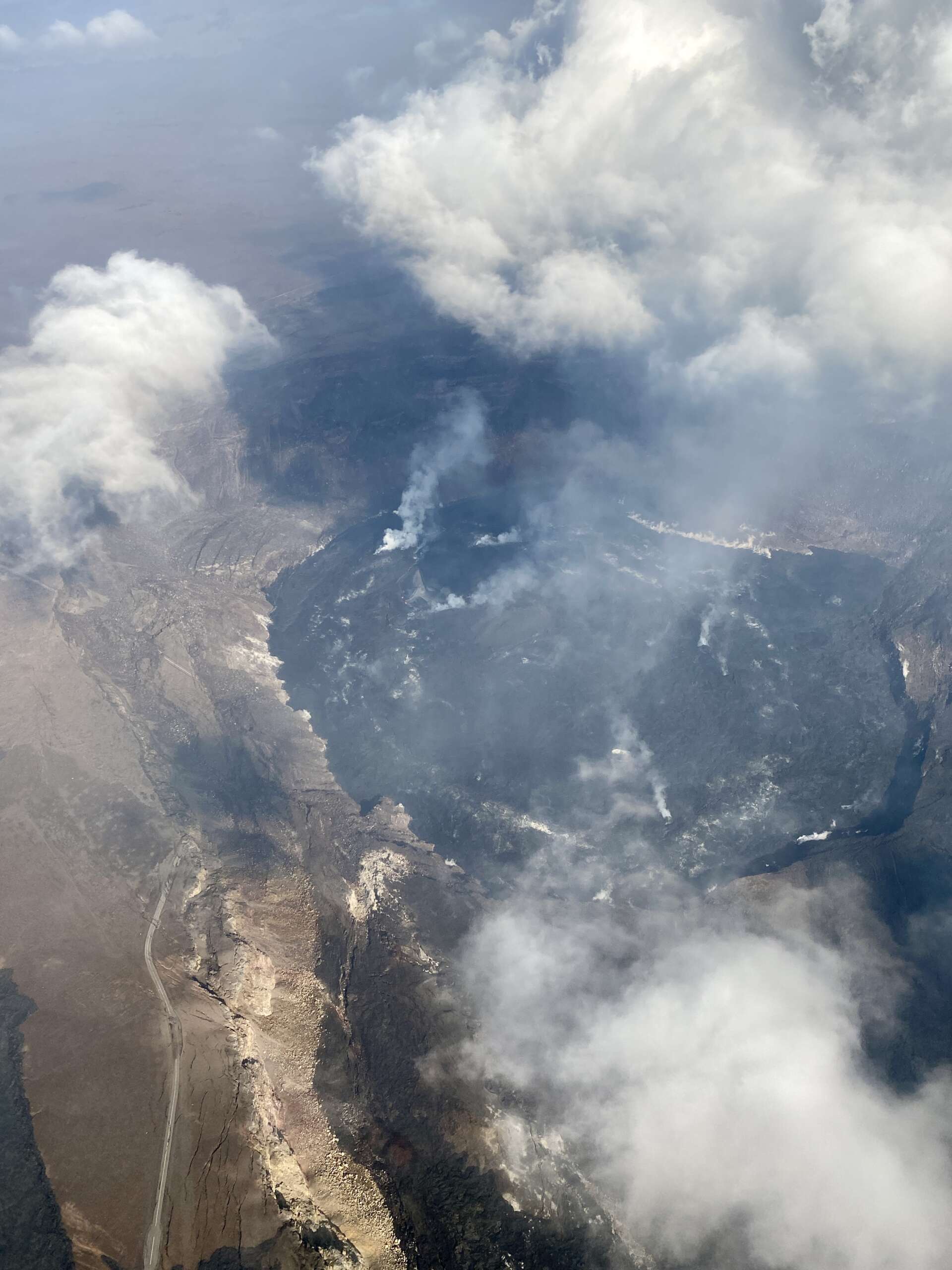 A la verticale du cratère la météo change radicalement. L’hélicoptère commence à être un peu balloté par les courants ascendants créés par la lave en contrebas. Alors qu’on volait sous un ciel bleu azur, il faut ici que le pilote contourne les zones de fumées pour nous permettre d’apercevoir le fonds du cratère.