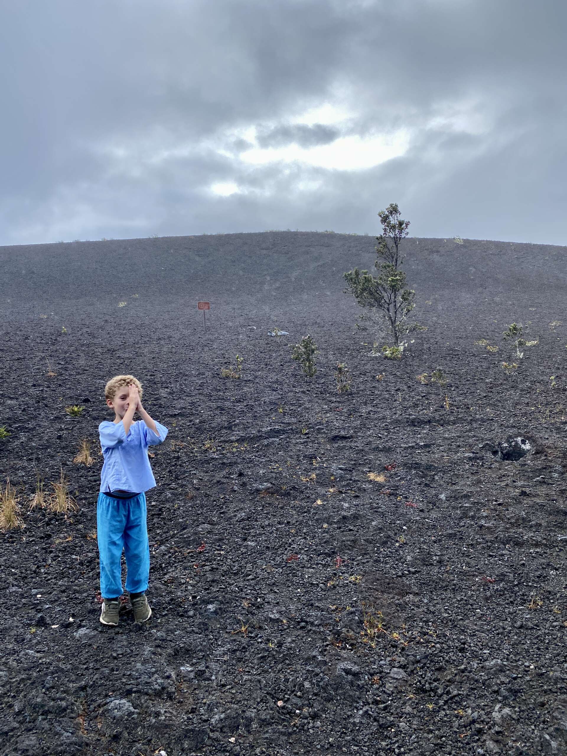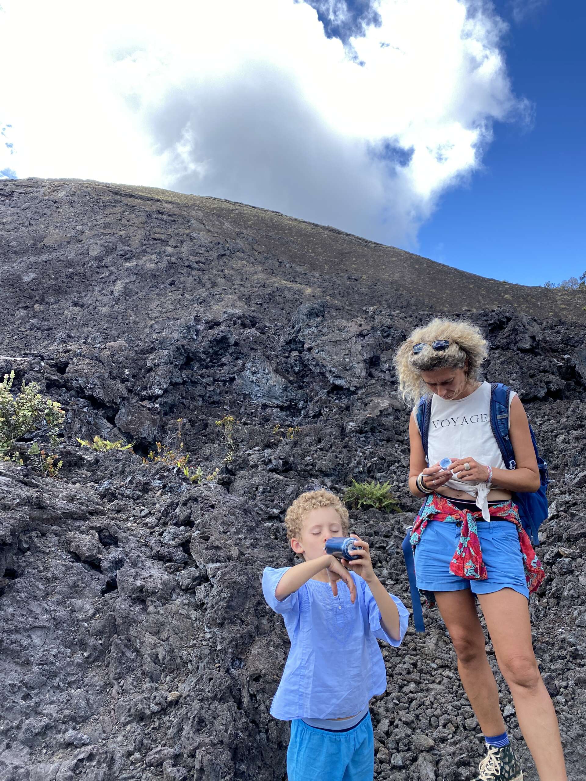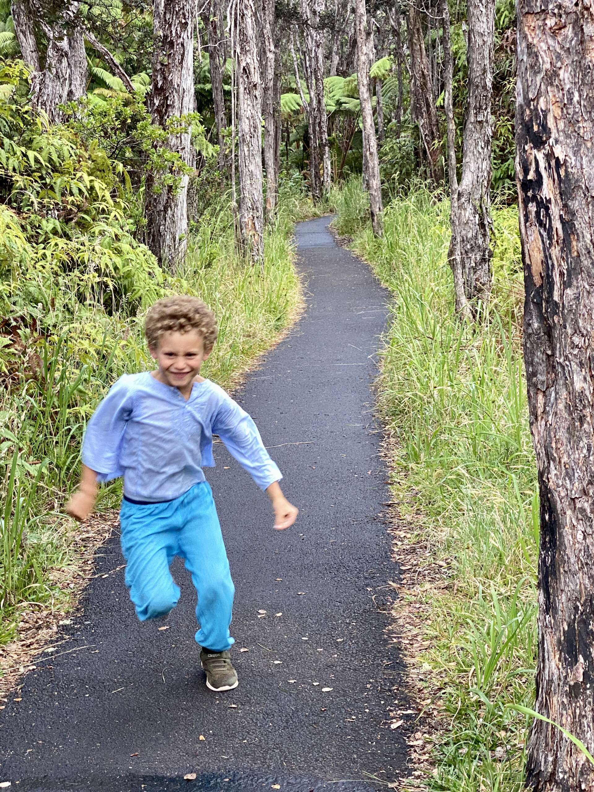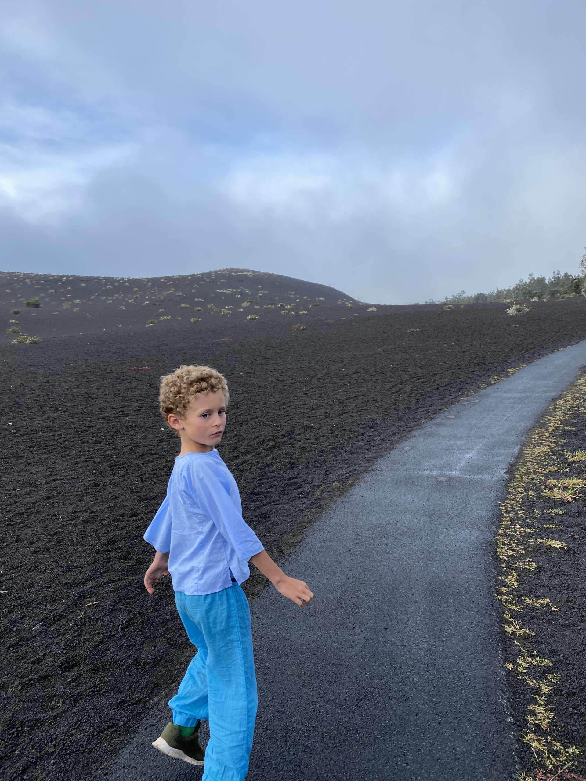 Petite balade, plus qu’une rando au final car elle fait 2km aller. On débute du parking qui mène à la zone de lave active qu’on avait emprunté il y a 2 jours, sauf qu’on part du côté opposé dans la forêt. Très vite, on quitte la forêt pour traverser la zone ou le cône de cendre s’est formé lors de l’éruption de 1957 avant de déboucher sur un autre versant du Iki crater. Noah, à la manière d’un coureur du tour de France qui doit pédaler encore 2h dans sa chambre d’hôtel après une étape tellement il est chargé de produits dopant se trouve lui aussi en manque de Dopamine et se met sur le retour à nous faire des sprint..