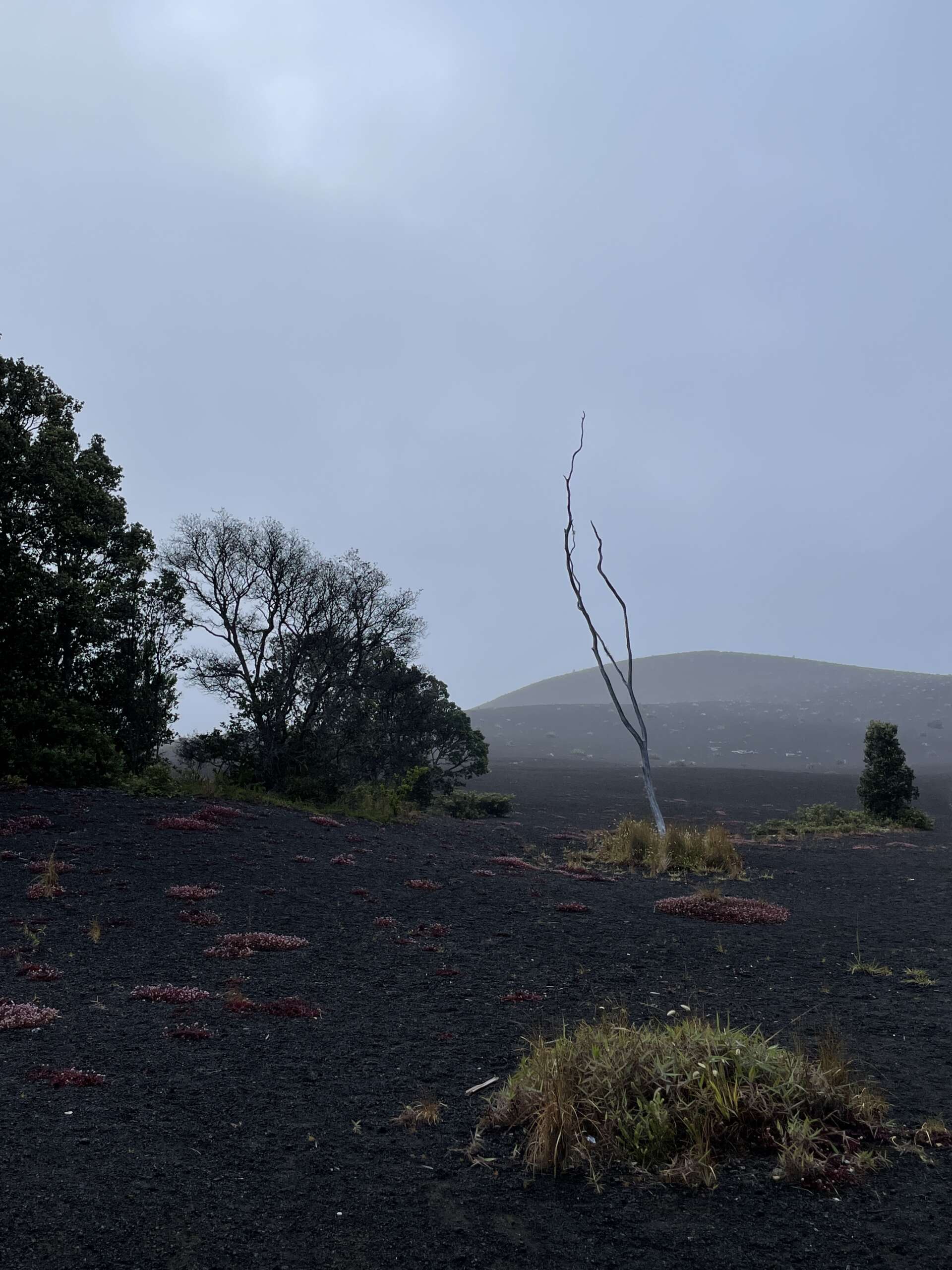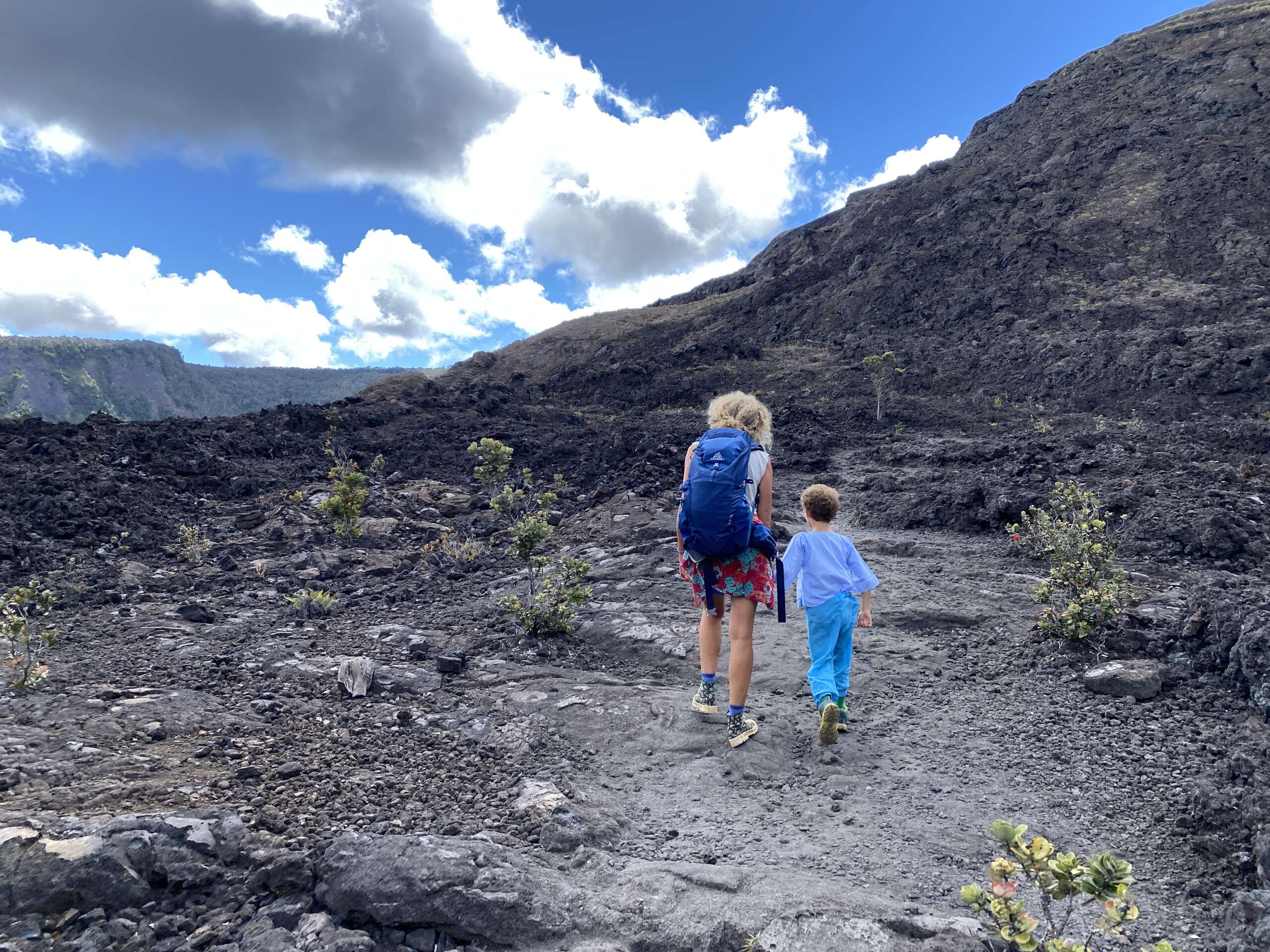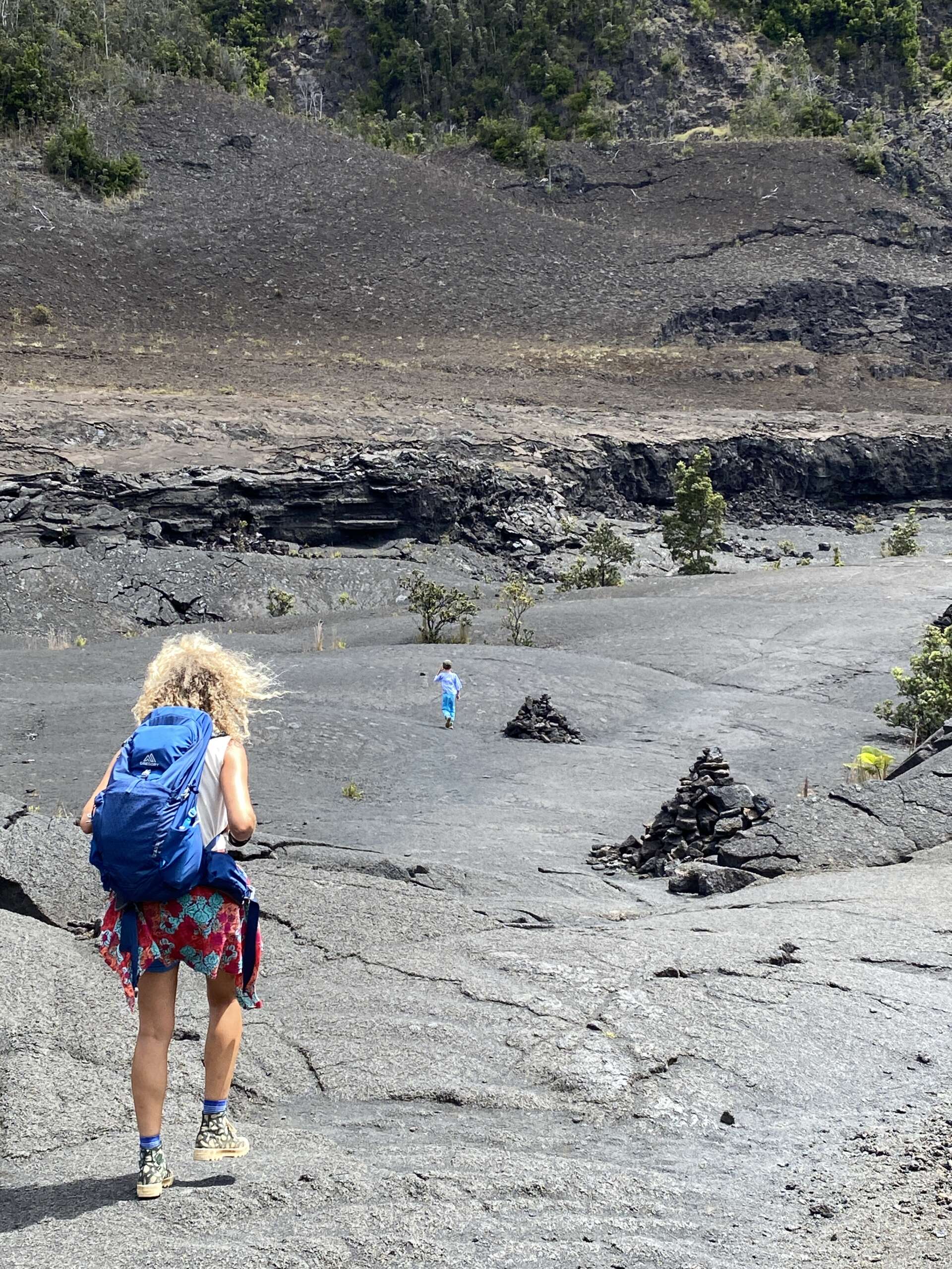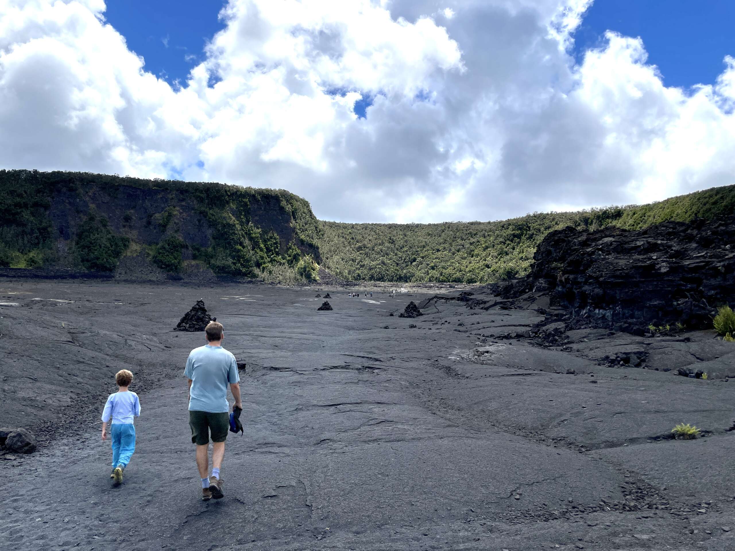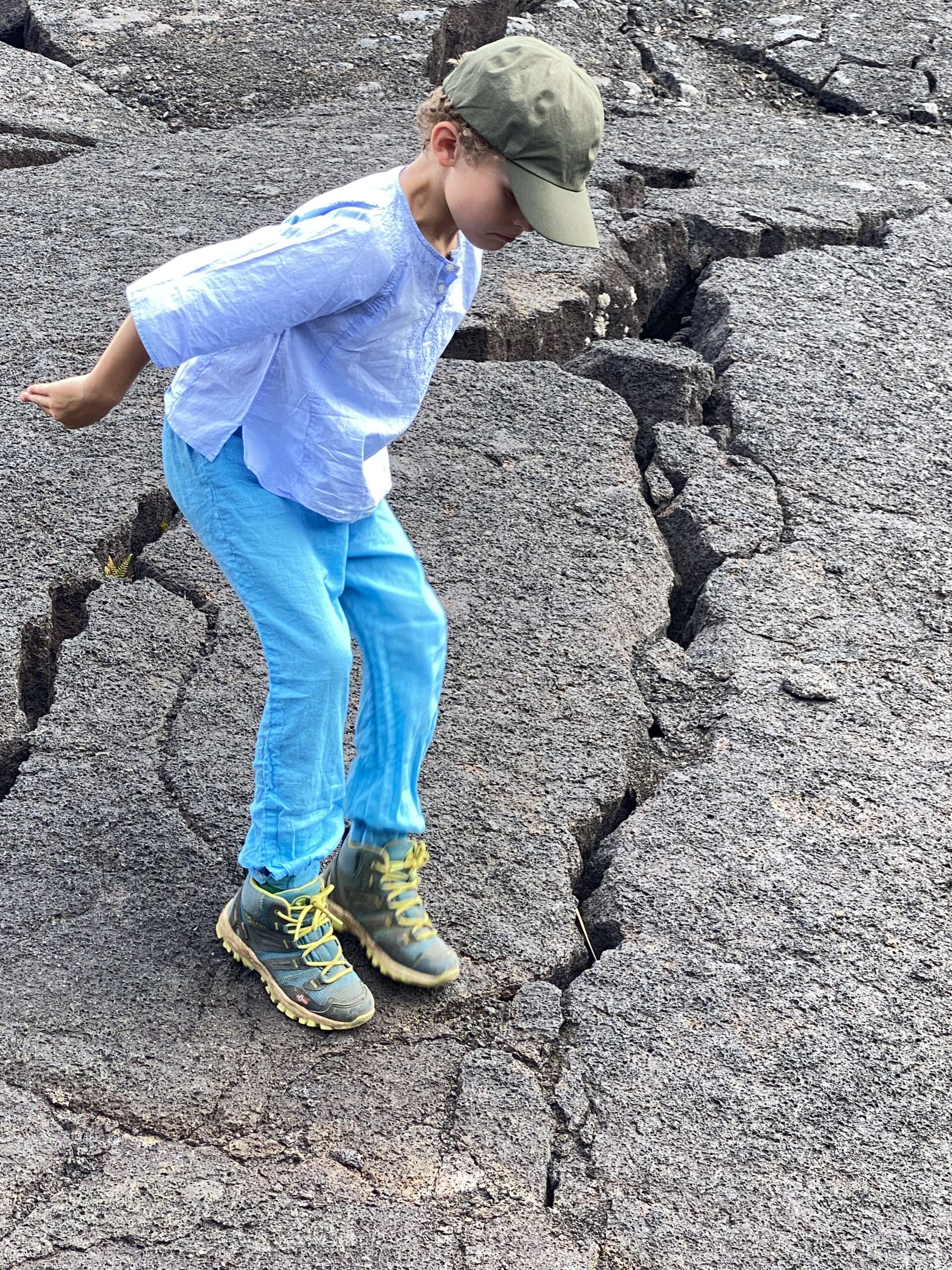Petite balade, plus qu’une rando au final car elle fait 2km aller. On débute du parking qui mène à la zone de lave active qu’on avait emprunté il y a 2 jours, sauf qu’on part du côté opposé dans la forêt. Très vite, on quitte la forêt pour traverser la zone ou le cône de cendre s’est formé lors de l’éruption de 1957 avant de déboucher sur un autre versant du Iki crater. Noah, à la manière d’un coureur du tour de France qui doit pédaler encore 2h dans sa chambre d’hôtel après une étape tellement il est chargé de produits dopant se trouve lui aussi en manque de Dopamine et se met sur le retour à nous faire des sprint..