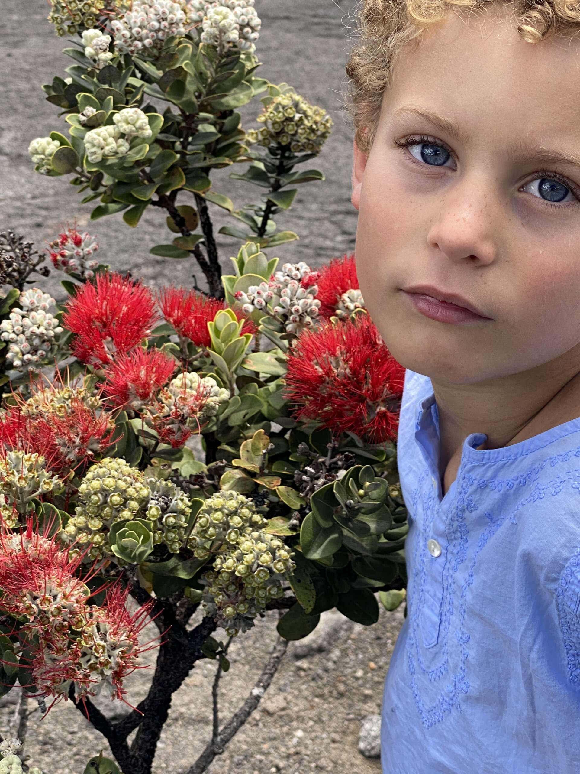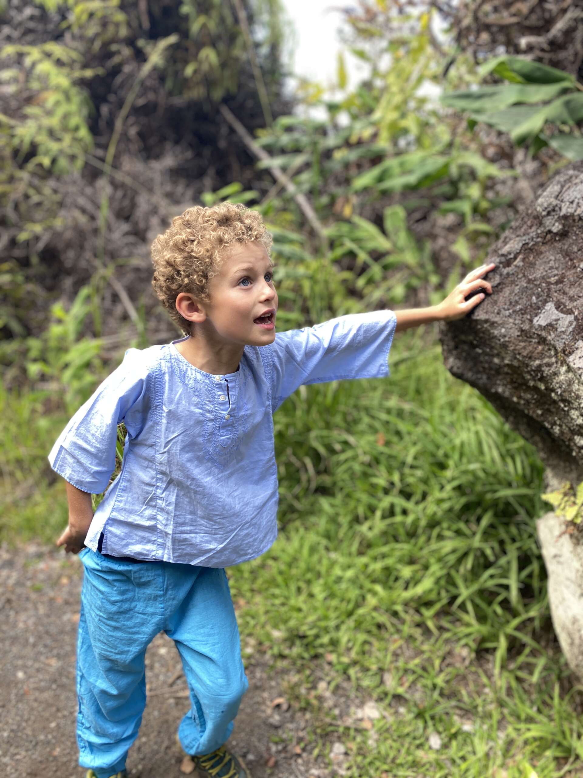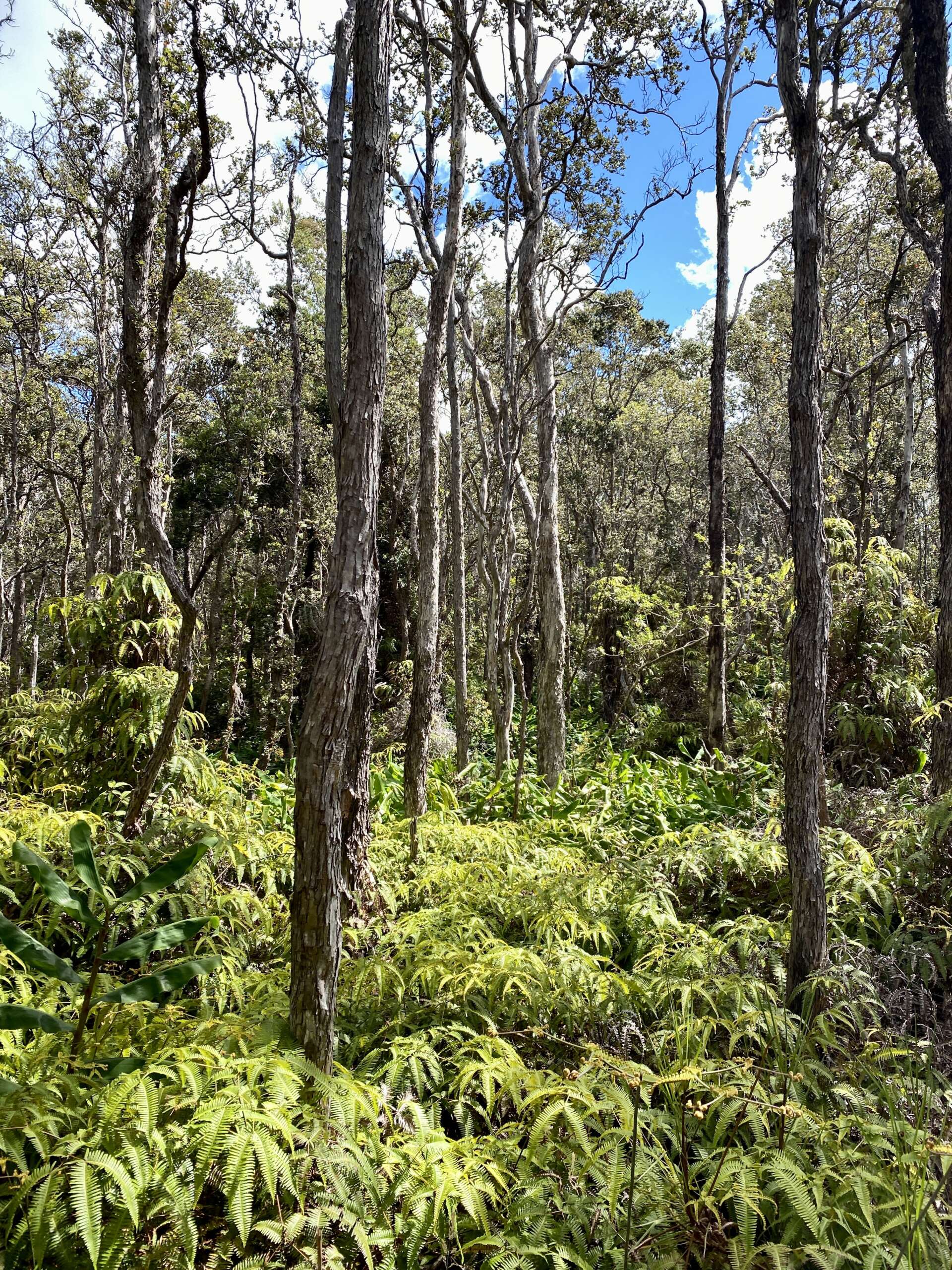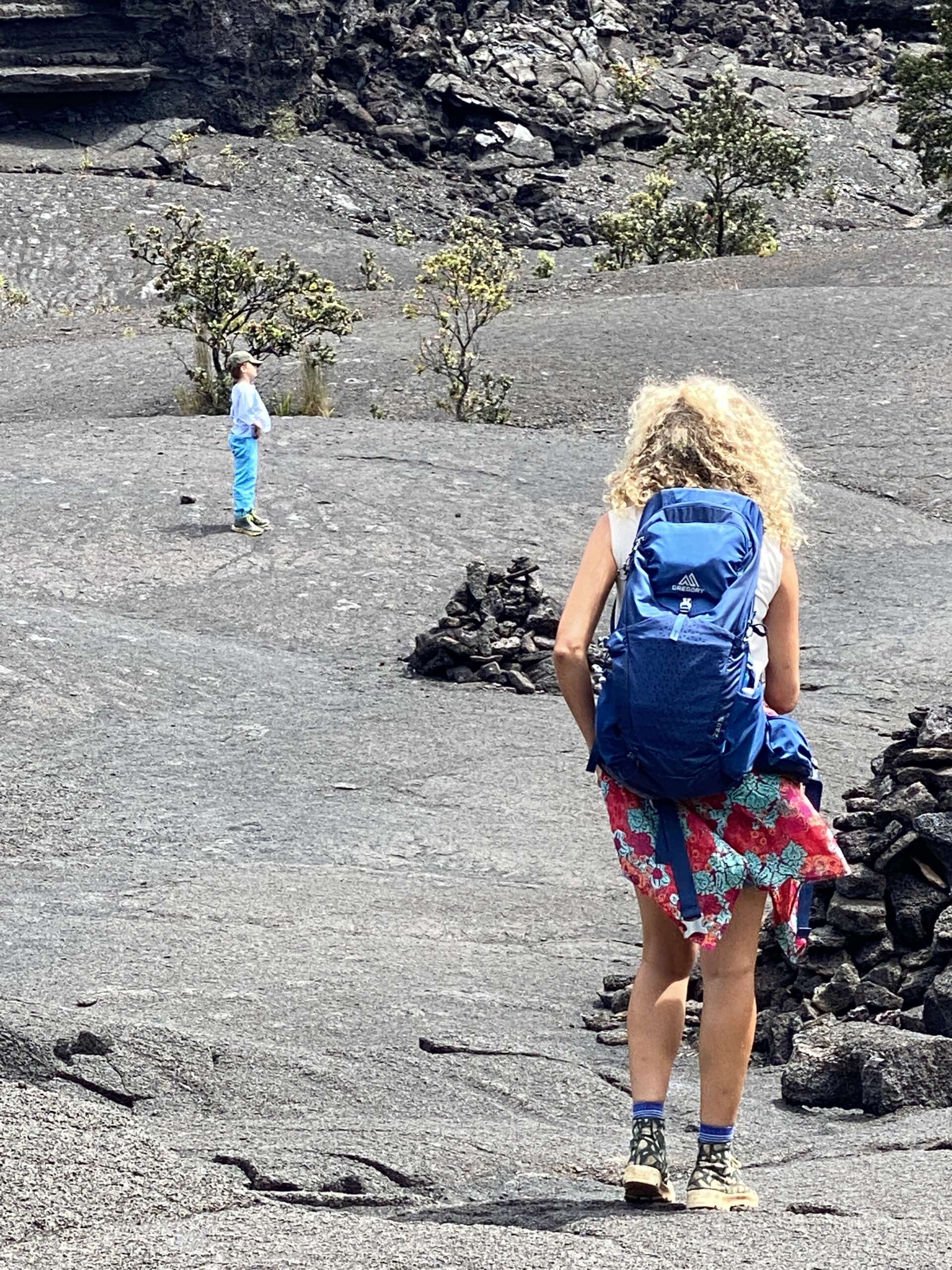 Petite balade, plus qu’une rando au final car elle fait 2km aller. On débute du parking qui mène à la zone de lave active qu’on avait emprunté il y a 2 jours, sauf qu’on part du côté opposé dans la forêt. Très vite, on quitte la forêt pour traverser la zone ou le cône de cendre s’est formé lors de l’éruption de 1957 avant de déboucher sur un autre versant du Iki crater. Noah, à la manière d’un coureur du tour de France qui doit pédaler encore 2h dans sa chambre d’hôtel après une étape tellement il est chargé de produits dopant se trouve lui aussi en manque de Dopamine et se met sur le retour à nous faire des sprint..