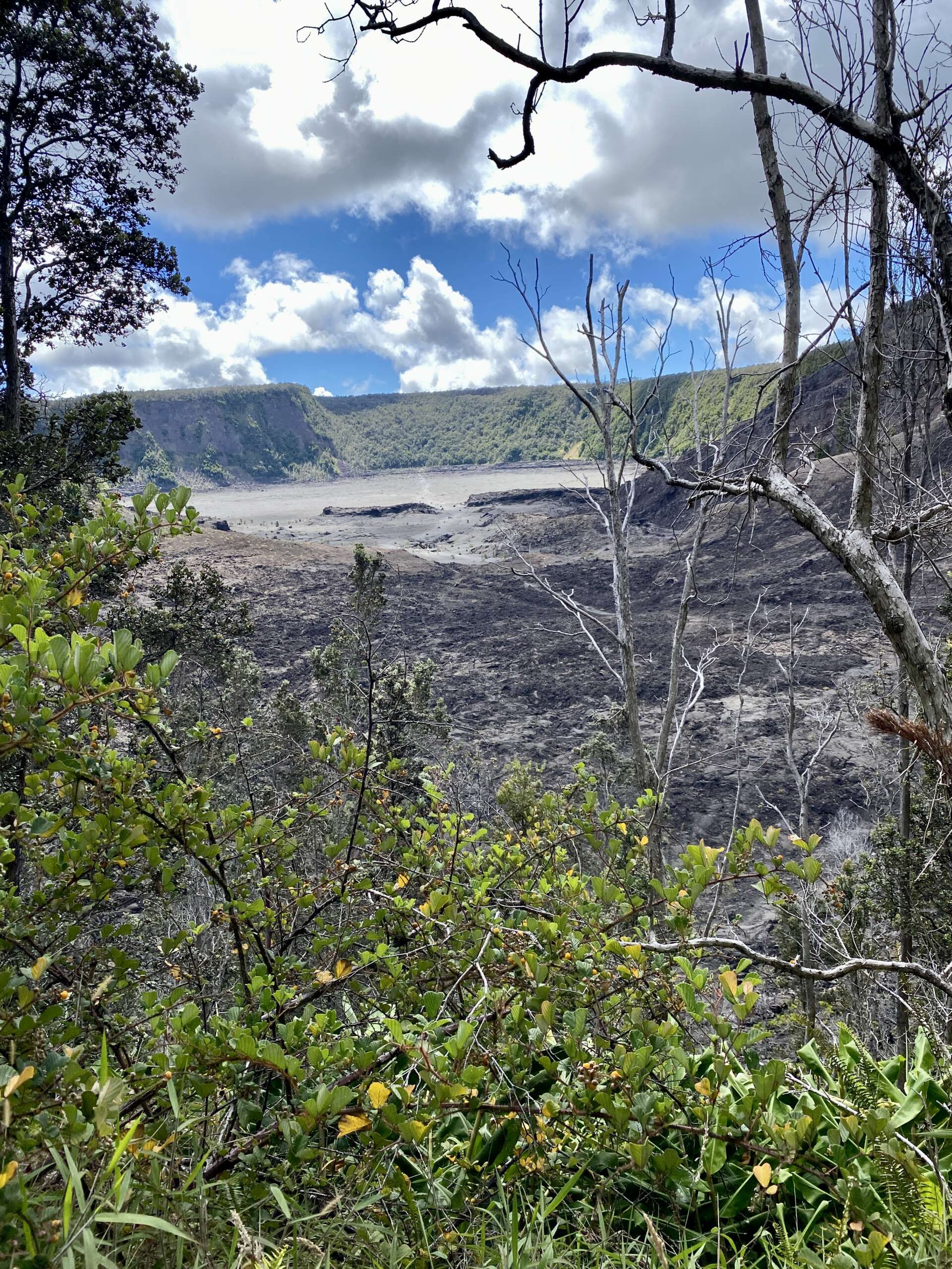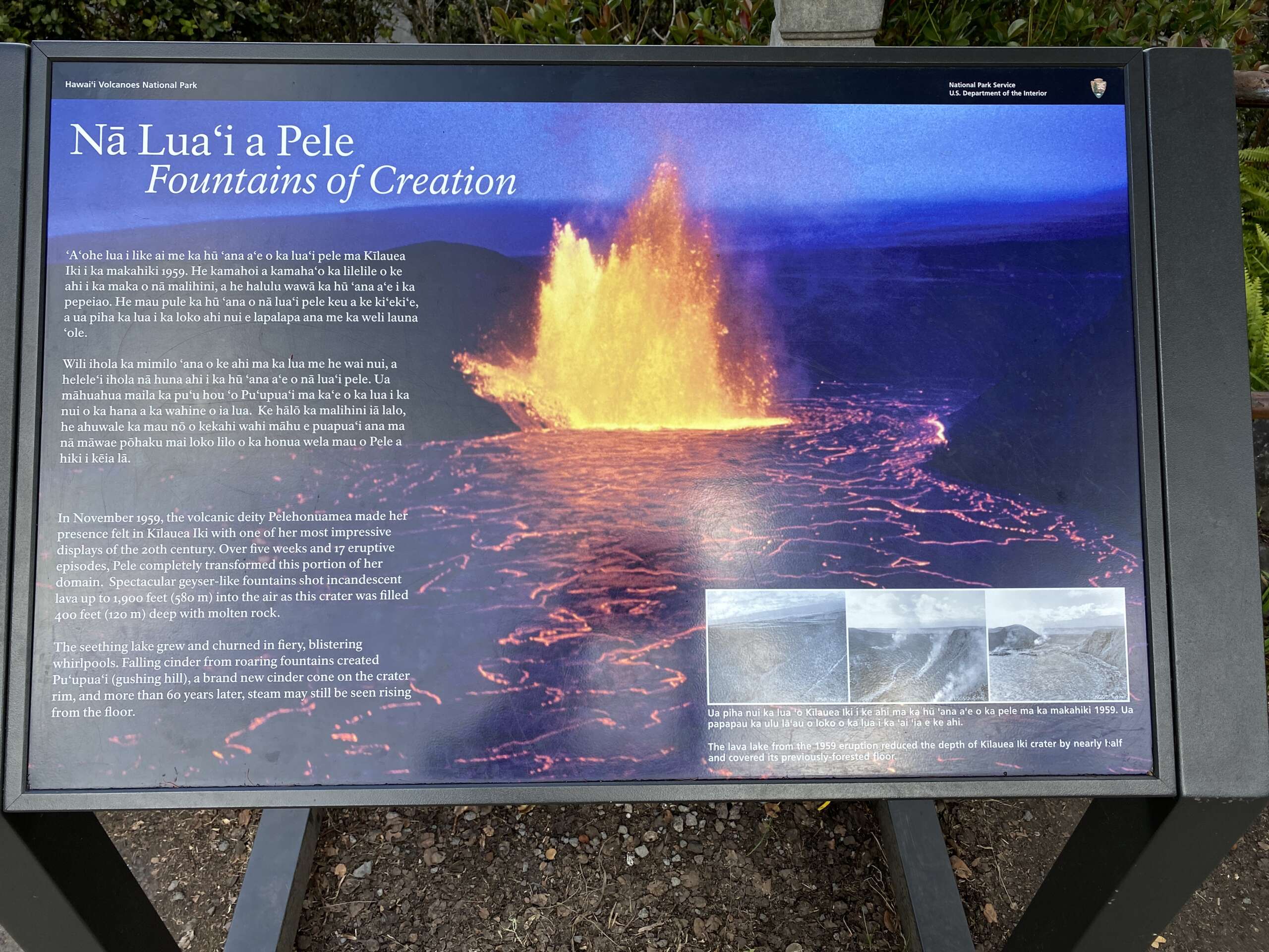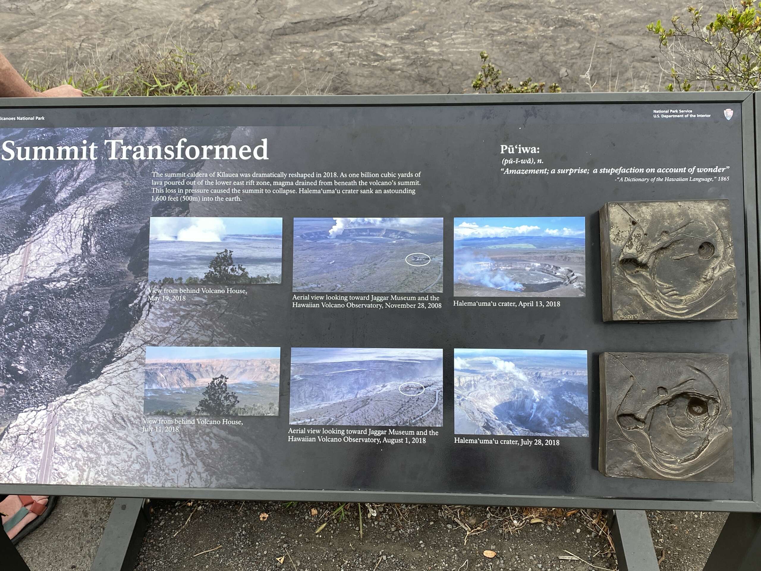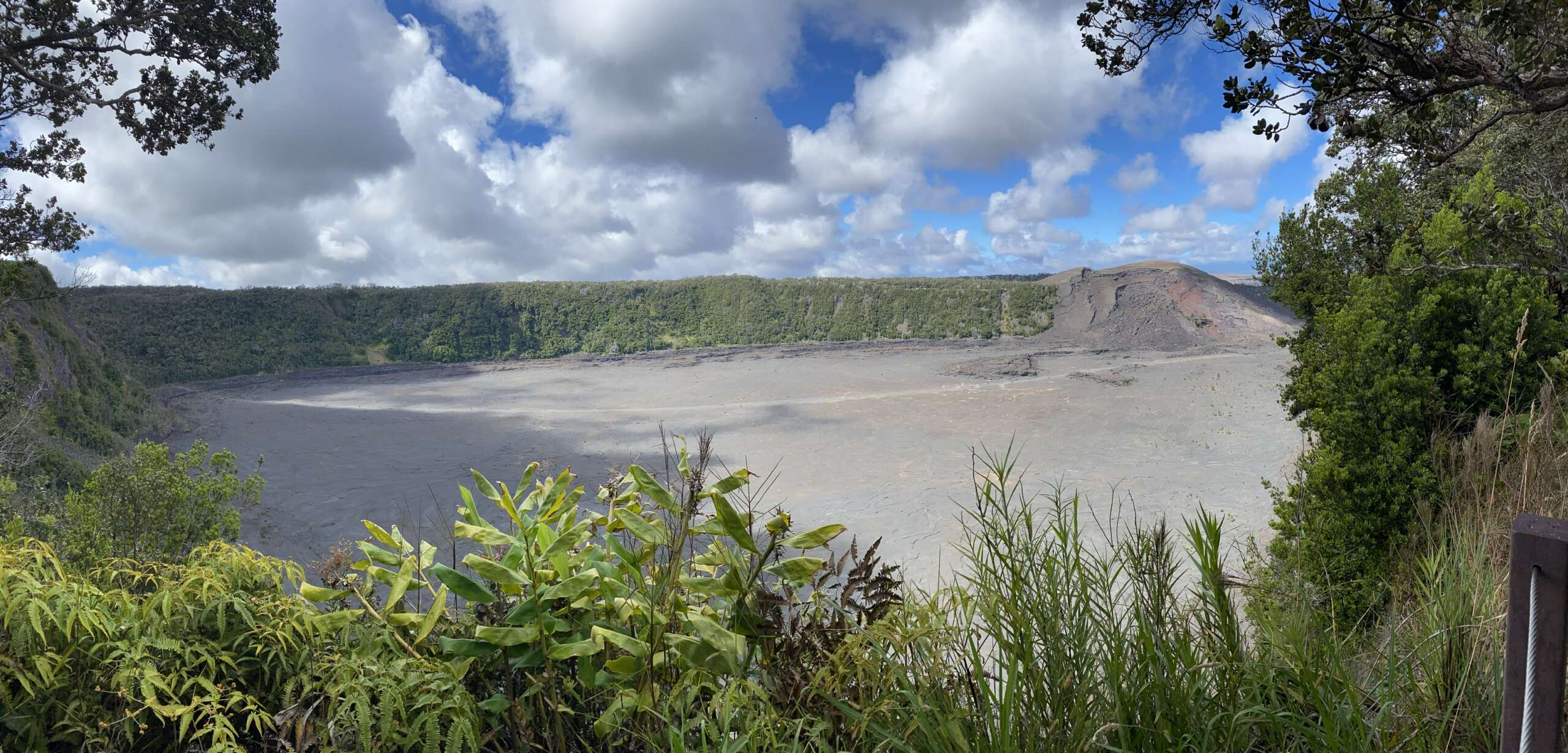Bien repus, nous repartons dans le parc national, pour faire le tour du Kilauea Crater, faire la petite marche de sulfur trail et les 2 points de vue sur le cratère. Rien d’exceptionnel par rapport à ce qu’on a pu observer de l’autre côté du cratère d’autant que la bruine est de la partie. Finalement, le plus impressionnant, ce sont les photos à l’un des lookout qui montrent l’évolution du cratère à 3 mois d’intervalle. Oups..
