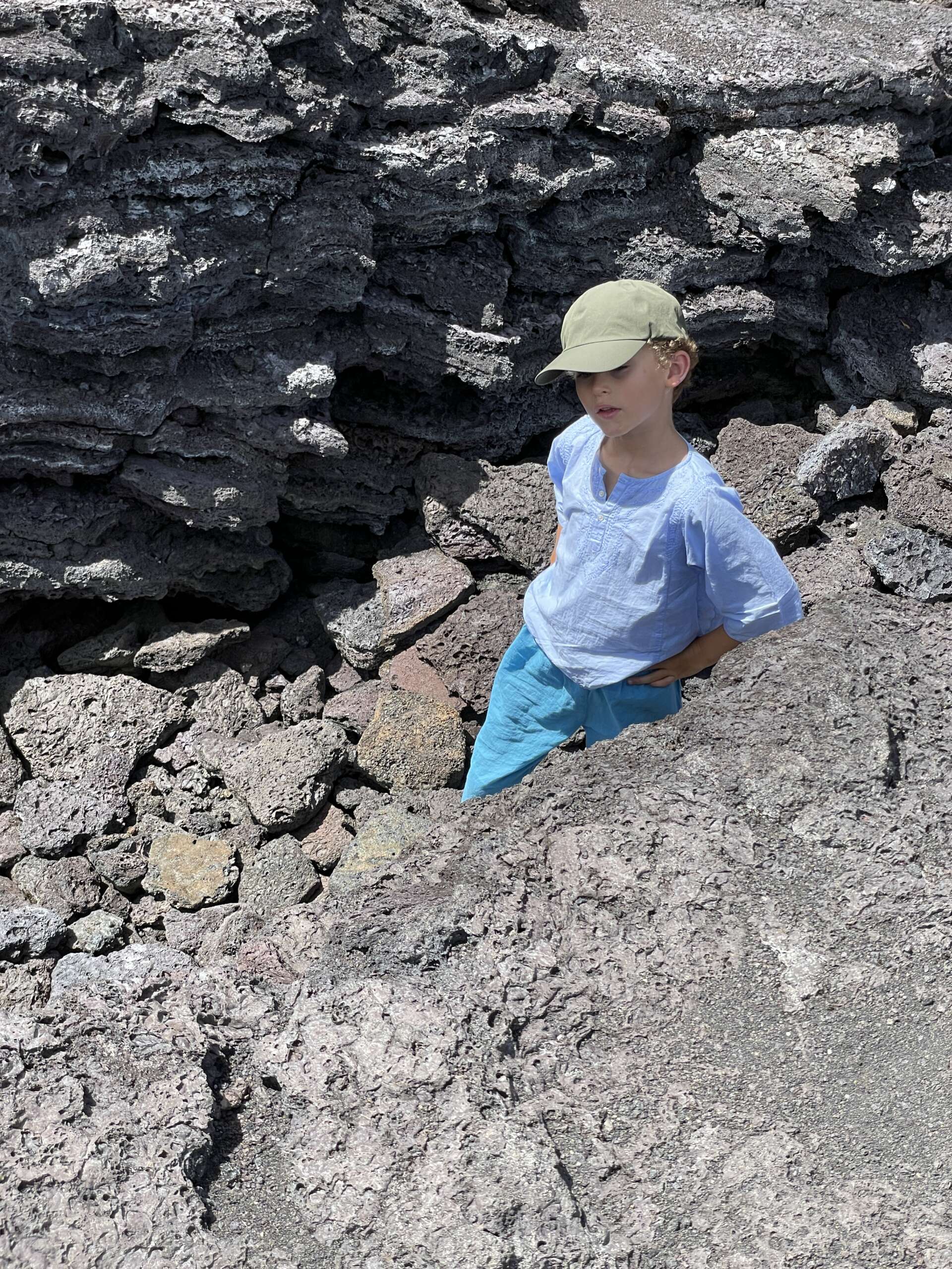 L’histoire du Iki cratère se lit en partie sur la lave qu’on foule de nos pieds. Il y a moins de 70 ans ici, une fontaine de 450 mètres de haut remplissait le cratère d’un lac de lave de 100 m de profondeur. La lave a ensuite refroidi doucement ce qui rend le fond du cratère relativement lisse, et on retrouve en s’approchant de ses bords des vagues de lave figées.