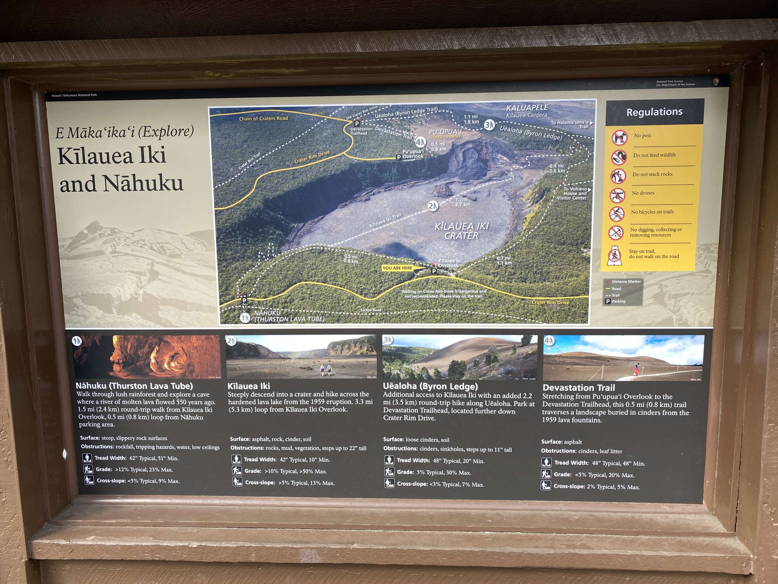 Malheureusement, la fameuse surprise au panneau 15 est tombée à l’eau. J’avais vu qu’on pouvait à cet endroit visiter un énorme tunnel de lave, sauf que celui-ci s’avérera fermé depuis 5 jours jusqu’à nouvel ordre à cause d’une résurgence de signes éruptifs. Apparemment une voute du tunnel s’est déplacée de 2 mètres en 1 journée alors que cette zone n’avait évolué que de 10 millimètres au cours des 3 dernières années. Pour éviter d’être transformés en barbecue géants, les rangers avaient donc gentiment fermé l’accès au tunnel.