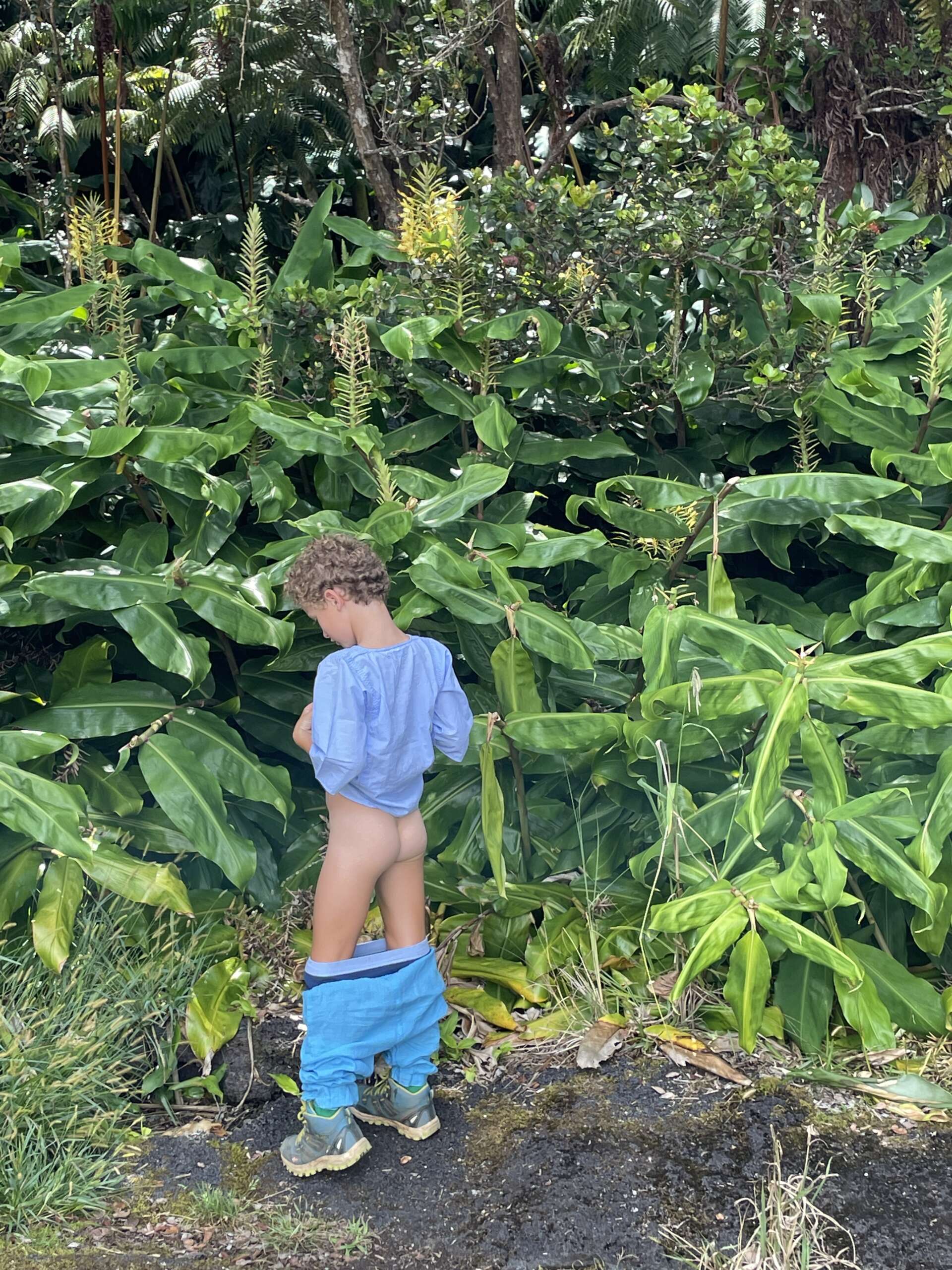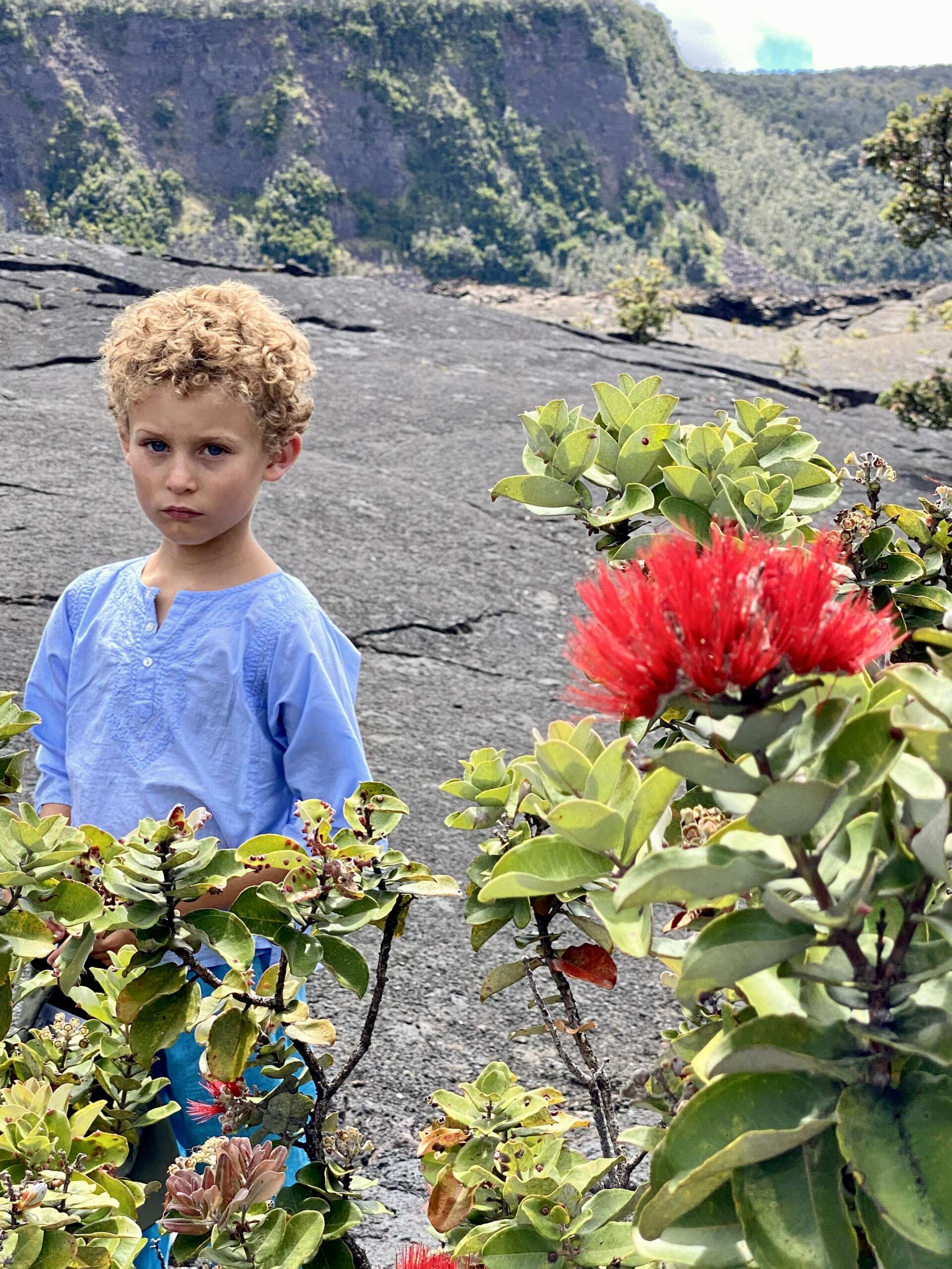 Enfin, c’est la remontée, effectuée comme la descente à travers la forêt au milieu d’une zone fleurie et qui nous permettra un dernier aperçu du cratère que l’on vient de traverser. Noah, nous a bien sûr comme tout endroit superbe qui se respecte gratifié d’un très beau pipi magistral que Virginie n’a pas pu s’empêcher d’immortaliser.