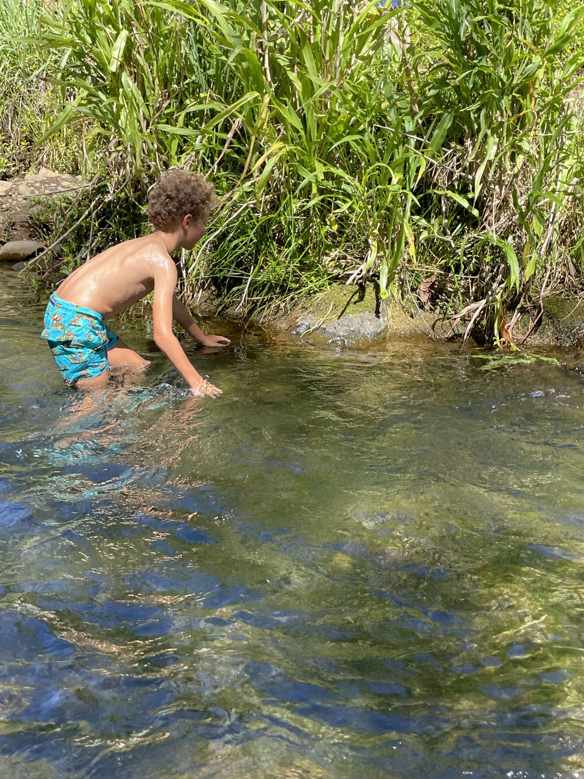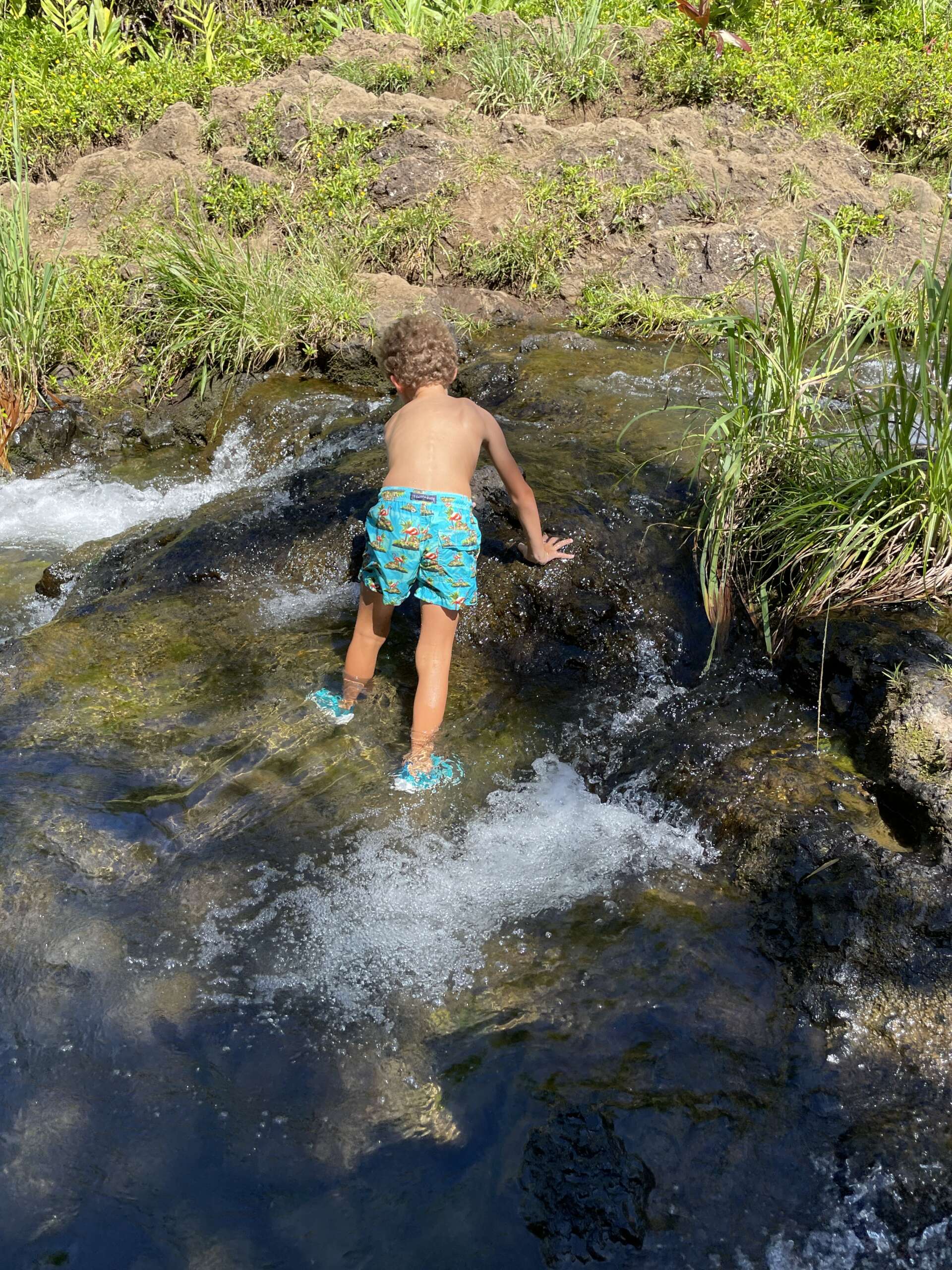 A Pua’a Ka’a, Noah avait repéré qu’on pouvait se baigner sous une des chutes. Il a beaucoup insisté pour que je l’accompagne, mais l’eau était tellement froide qu’au dernier moment il s’est arrêté au niveau du nombril et a préféré aller crapahuter dans les rochers et le petit rapide après les chutes.