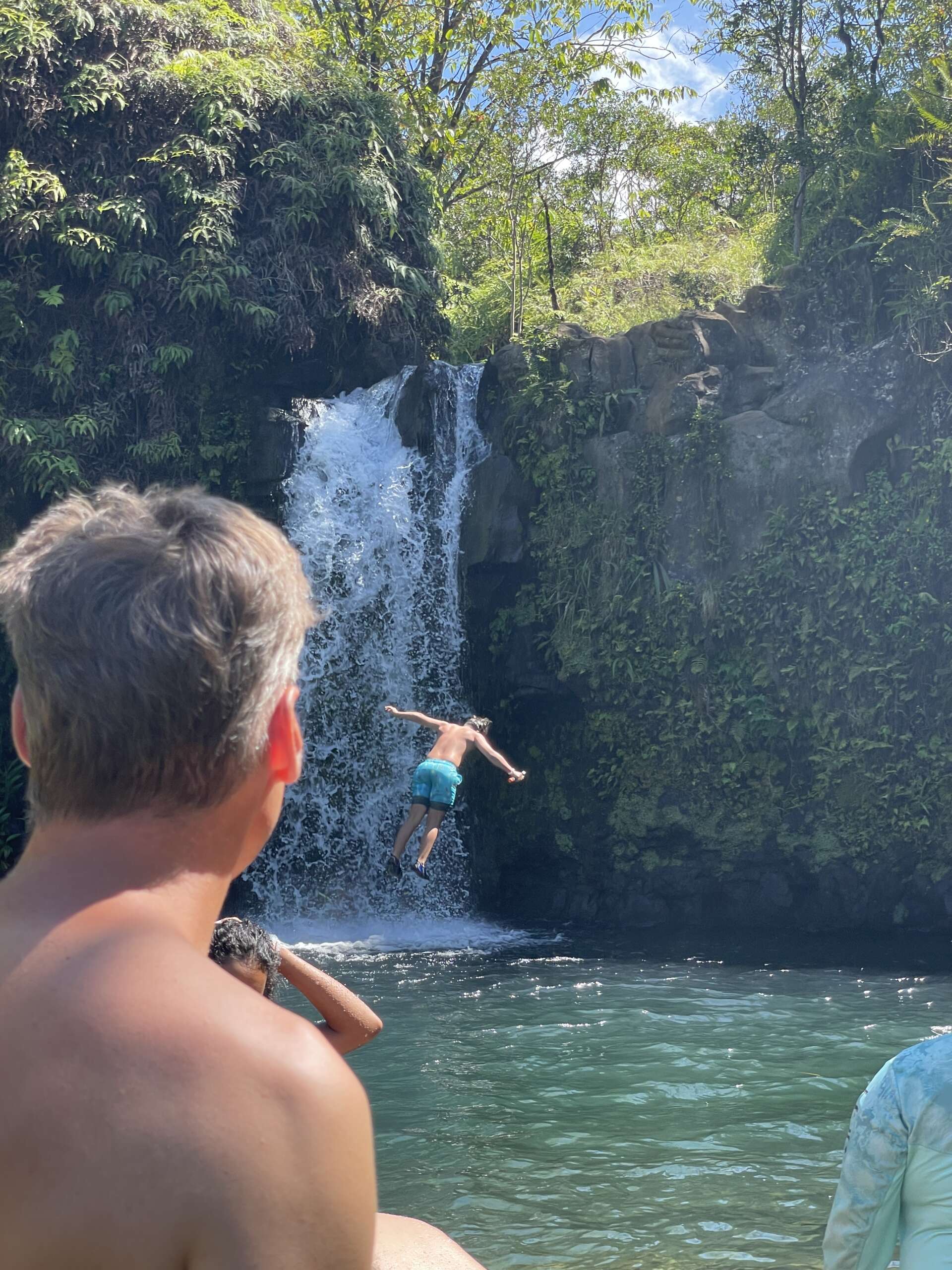 D’abord Pua’a Ka’a, puis les Hanawi falls. A chaque fois, on retrouve le sport national de ces nombreuses îles comme on avait vu d’ailleurs à la Réunion, j’ai nommé les sauts du haut des falaises.