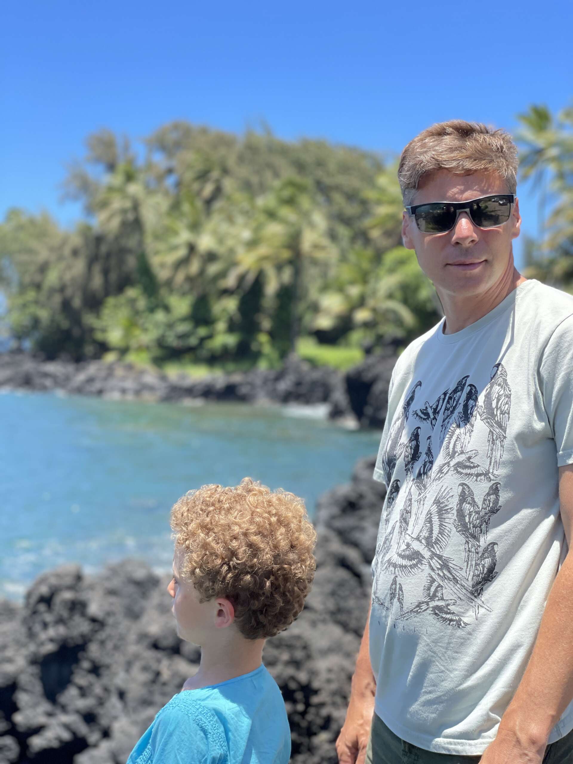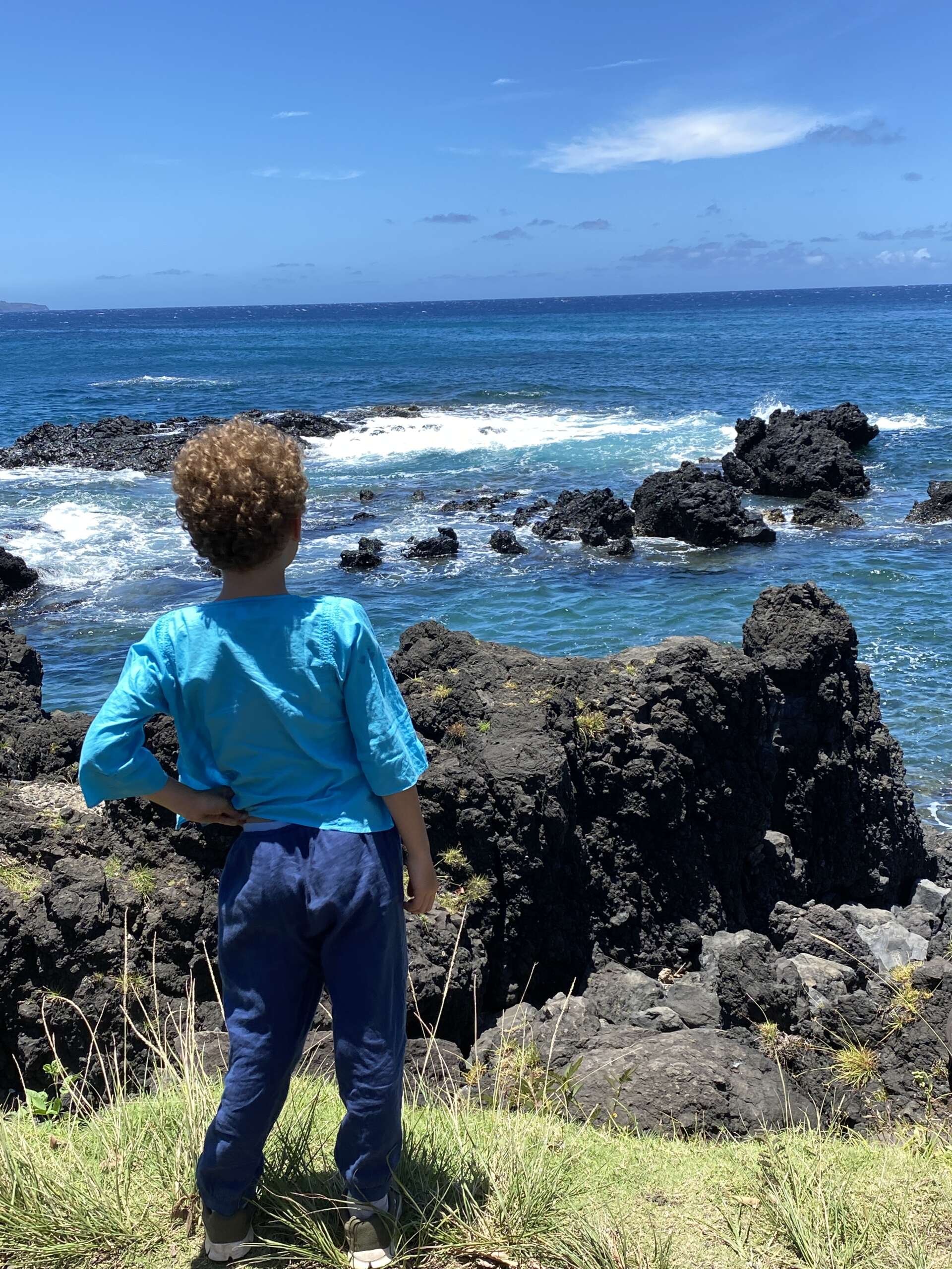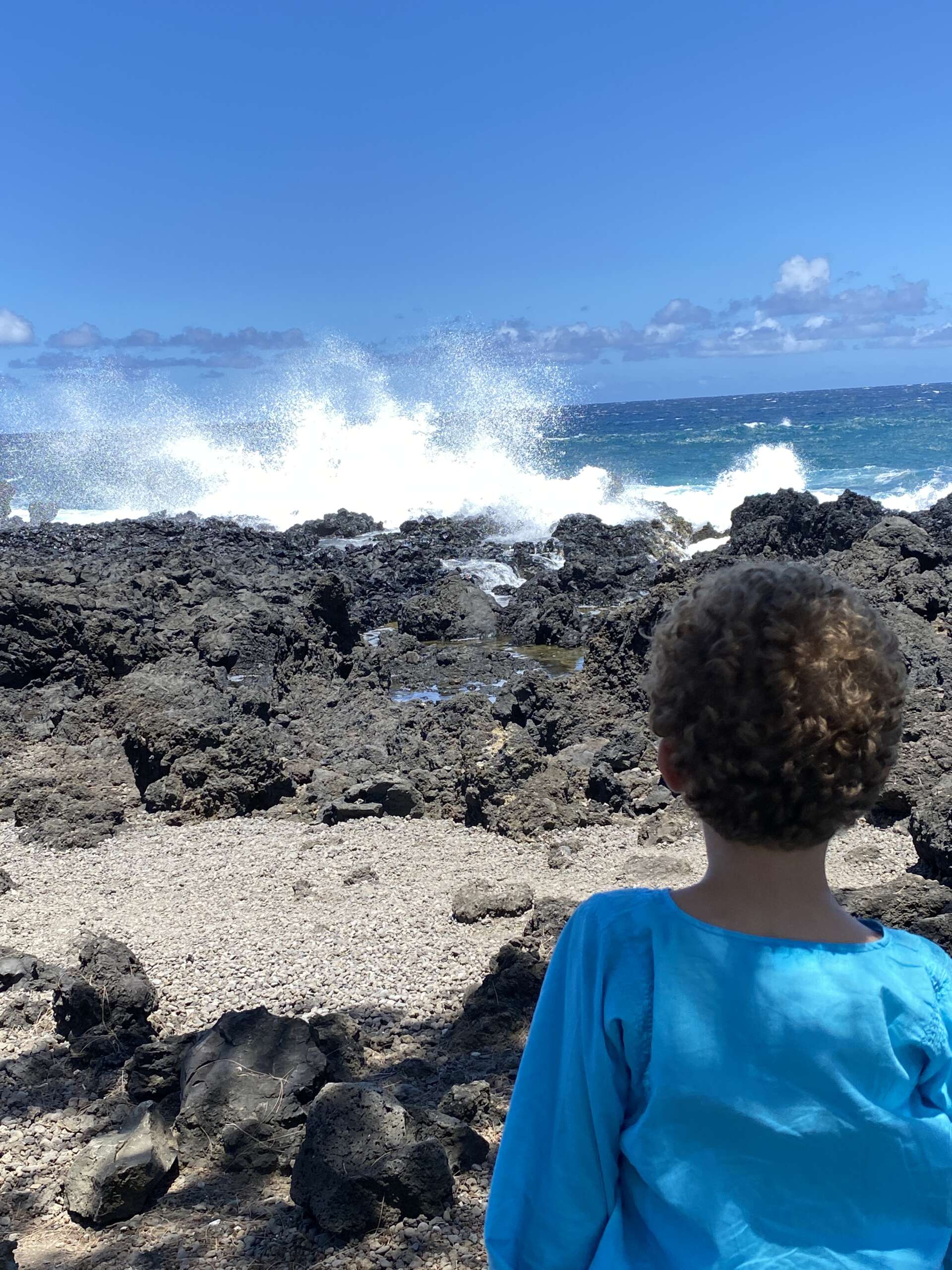 Après quelques kilomètres de route, on bifurque sur le seul embranchement de la route de Hana qui mène à la baie de Keanae. 2 stops au bord de l’eau très sympa où Noah se régale à voir les énormes rouleaux frapper les rochers. Le deuxième stop s’avère encore plus impressionnant d’ailleurs que le premier car à la faveur d’une coulée de lave qui a fortement avancé dans l’océan, nous pouvons escalader les rochers et se retrouver entouré de vagues énormes dont l’écume vient régulièrement s’abattre sur nous au gré d’un vent tournoyant.