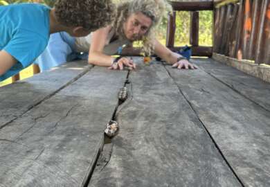 Pendant ce temps Virginie s’essaye au land art. J’adore. Avec trois fois rien grapillés en bordure de végétation elle fait un truc top. J’en profite pour remontrer à Noah le land art qu’il faisait à 4 ans lorsqu’on était confinés dans le Colorado dans notre ranch dans l’espoir qu’il veuille en faire un aussi mais l’attrait de grimper dans le bateau pour sauter du pont dans l’eau est beaucoup trop fort.