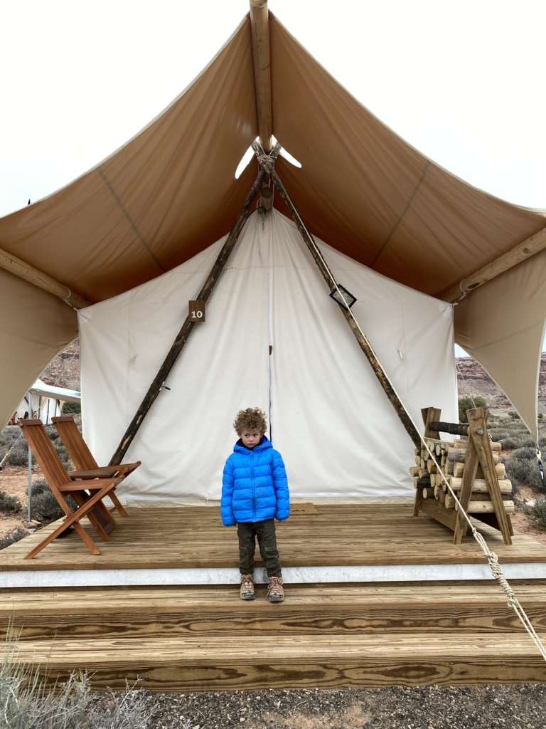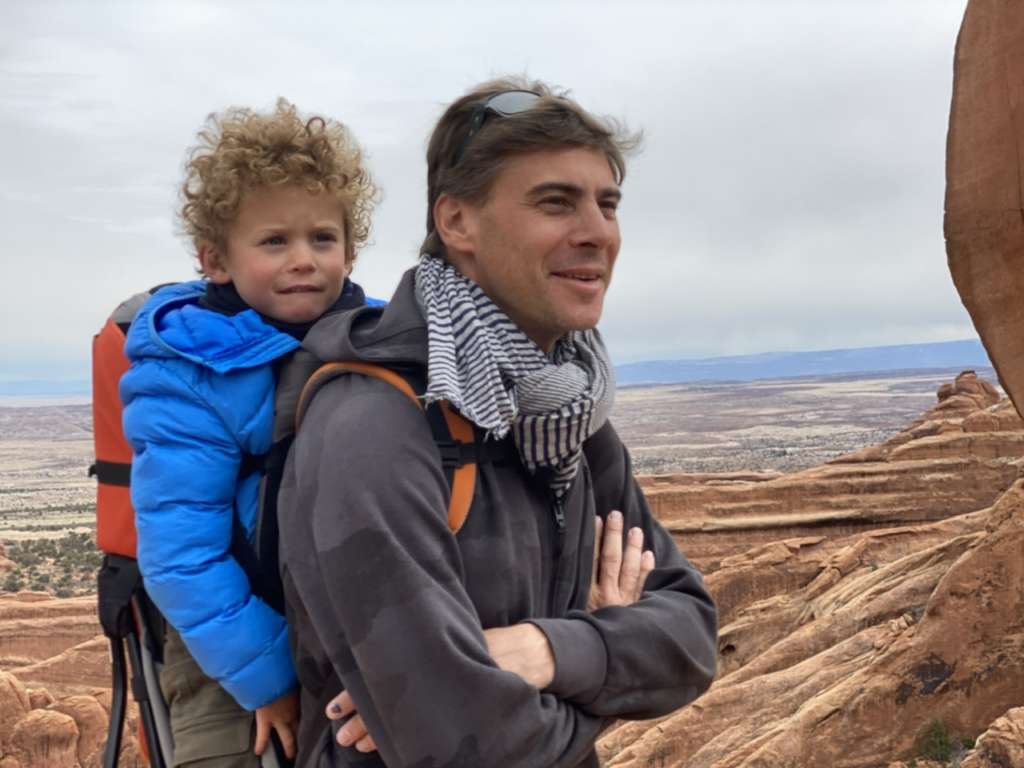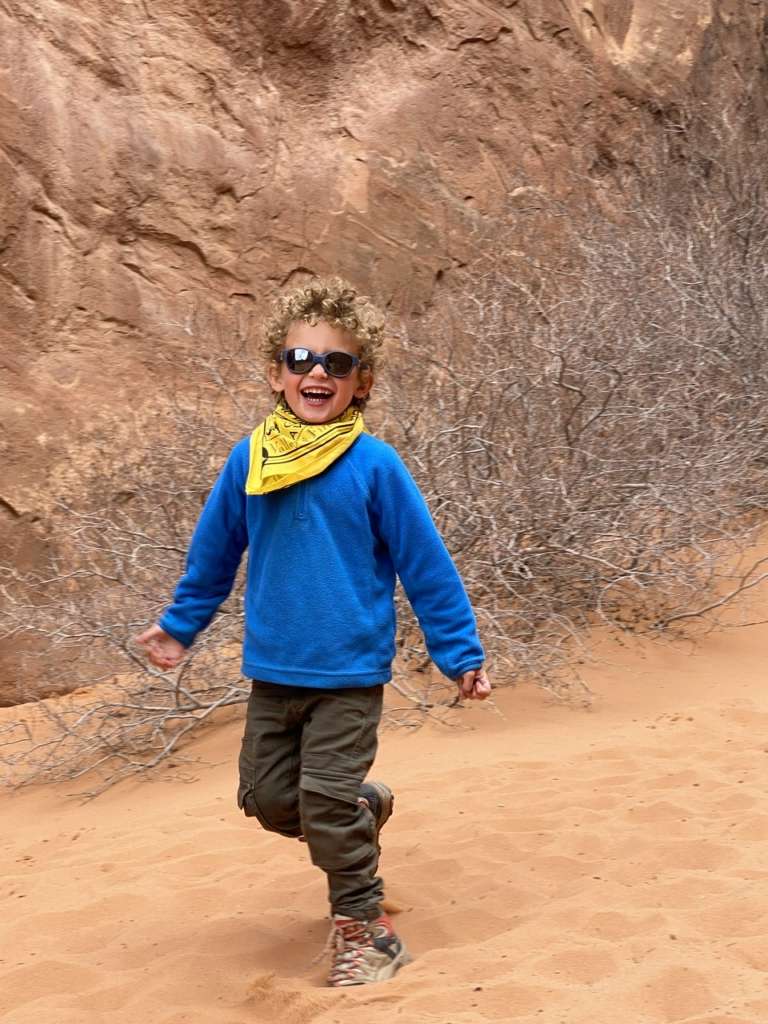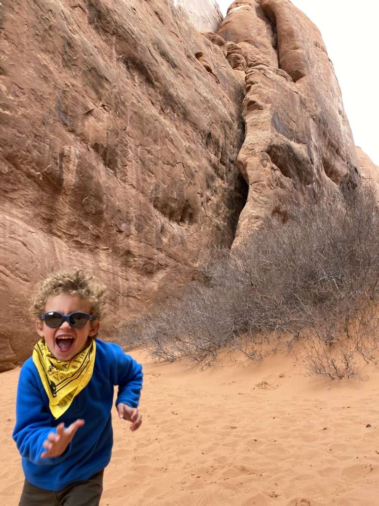 Bref, le timing se goupille au final assez bien, car on a à peine le temps d’arriver au parking de Sand Dune Arch, que notre petit prince se réveille. Il en a écrasé de la patate avec ses petites joues rouges.