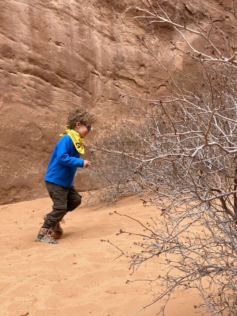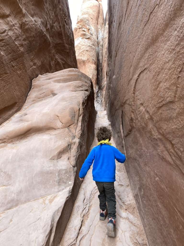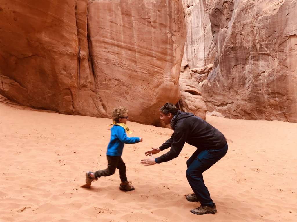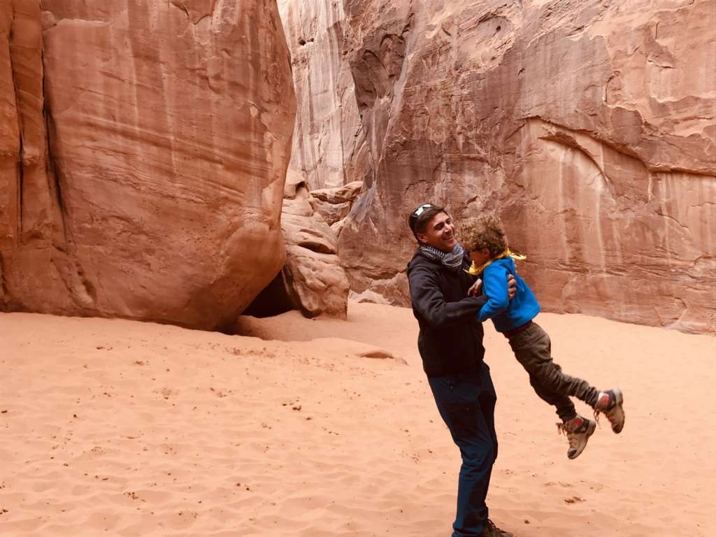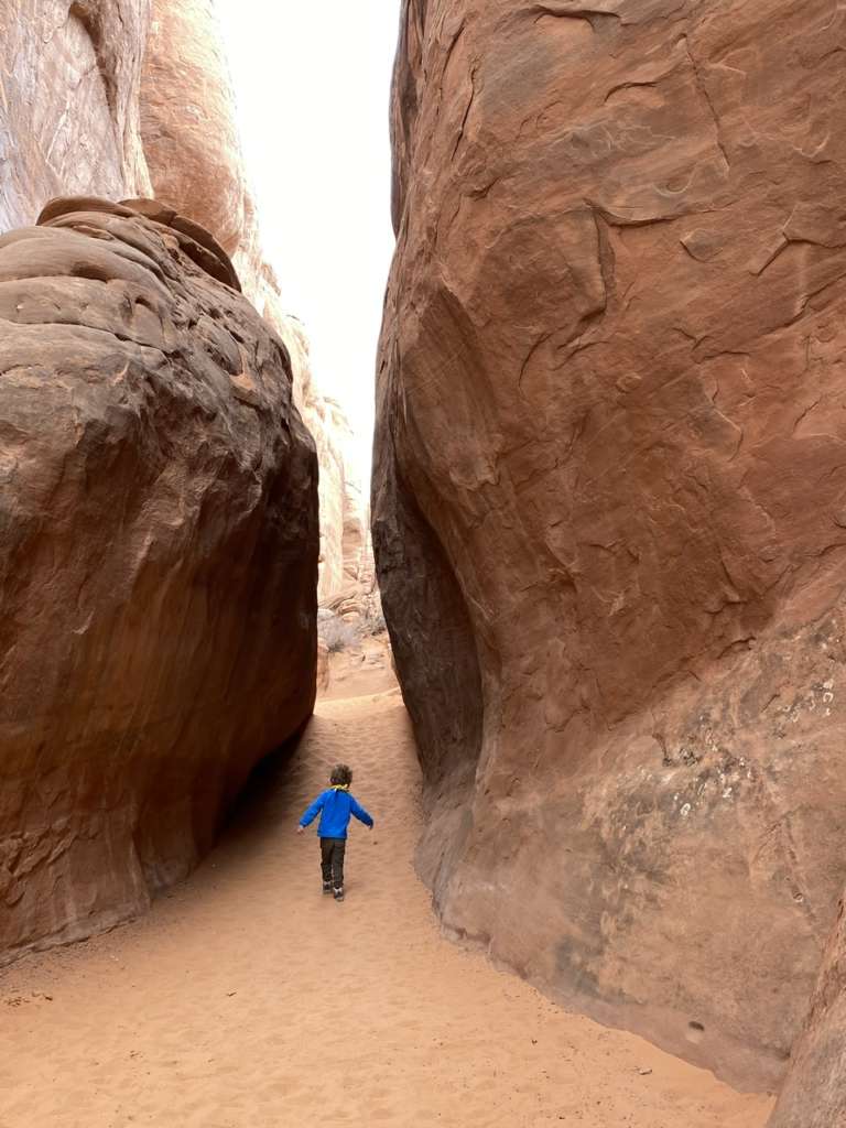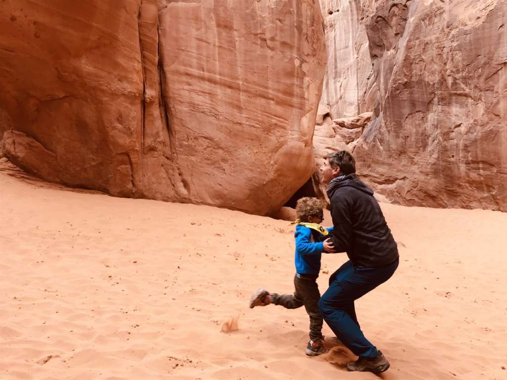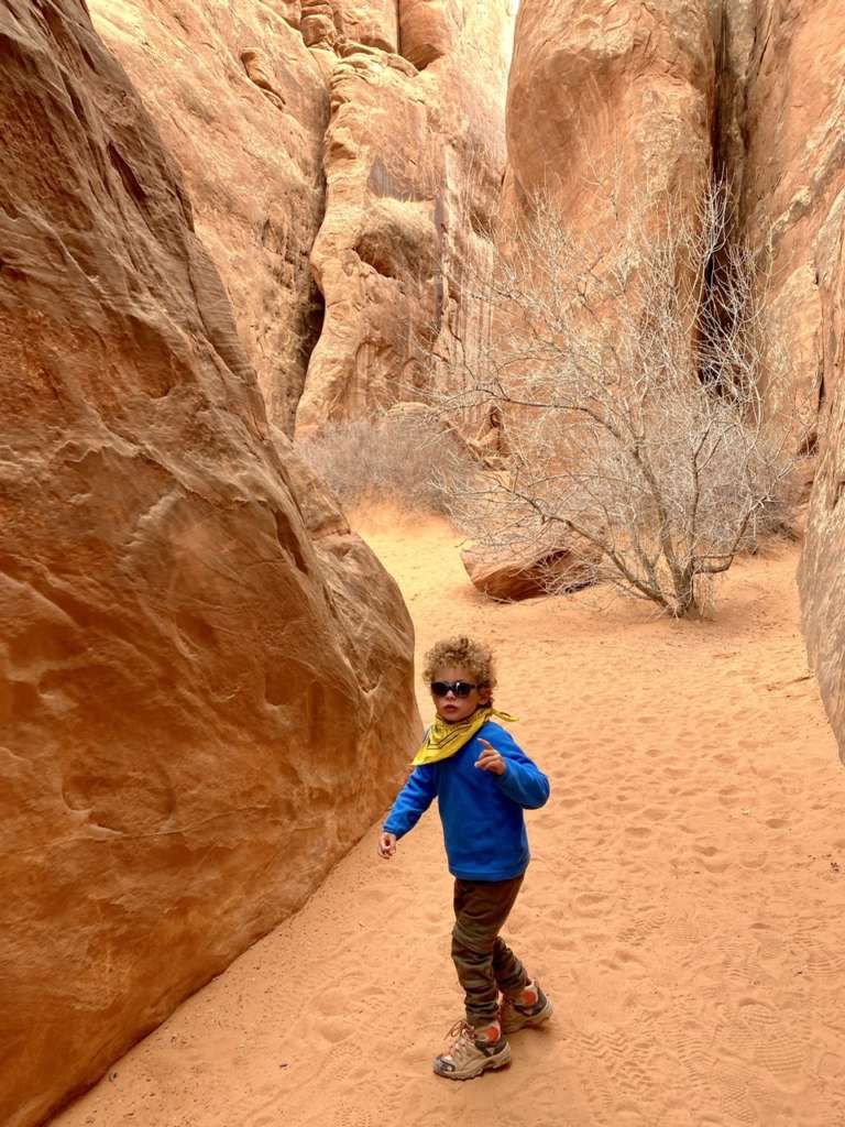 Noah est très excité à l’idée de faire cette balade. Plonger dans un petit canyon étroit rempli de sable, que demander de plus ? On passera plus d’une heure à arpenter ce petit canyon avec lui, à jouer dans le sable et à contempler l’arche sur place. D’ailleurs celle-ci commence à me réconcilier un peu avec les arches. C’est que nous devenons exigeants à arpenter en long et en large la planète depuis plus de 20 ans.