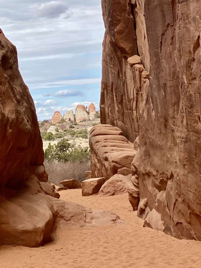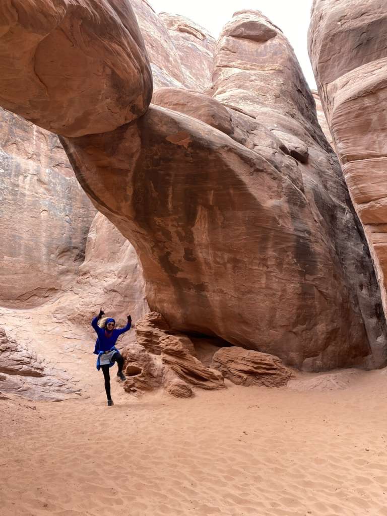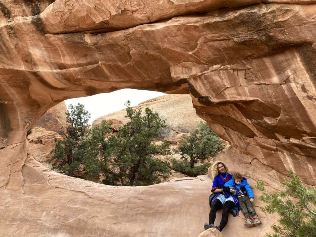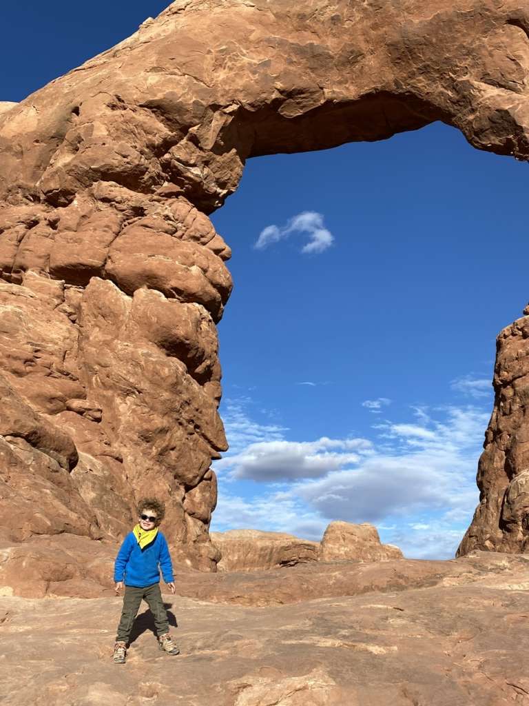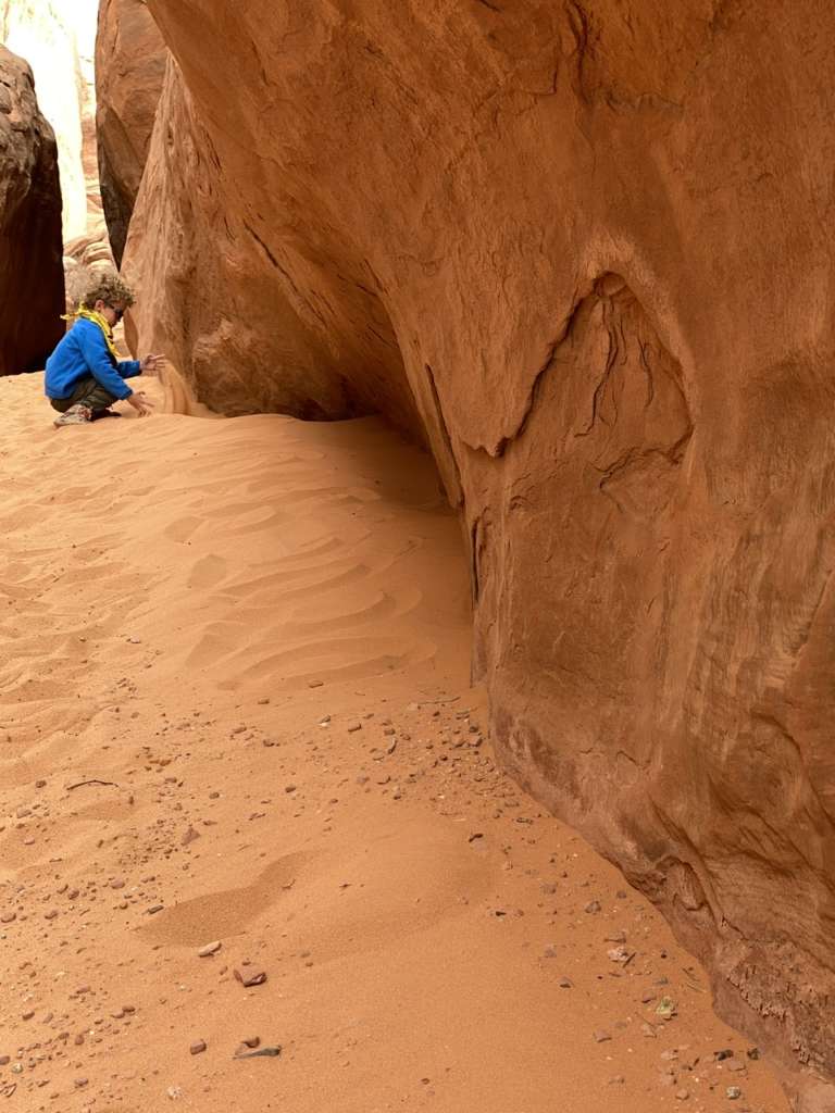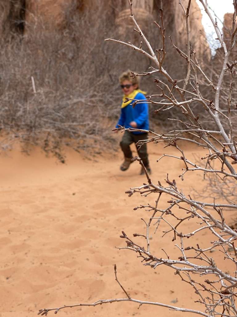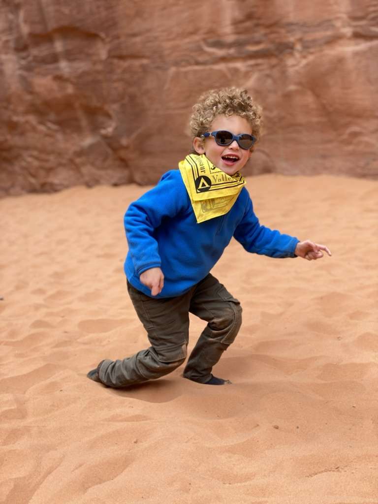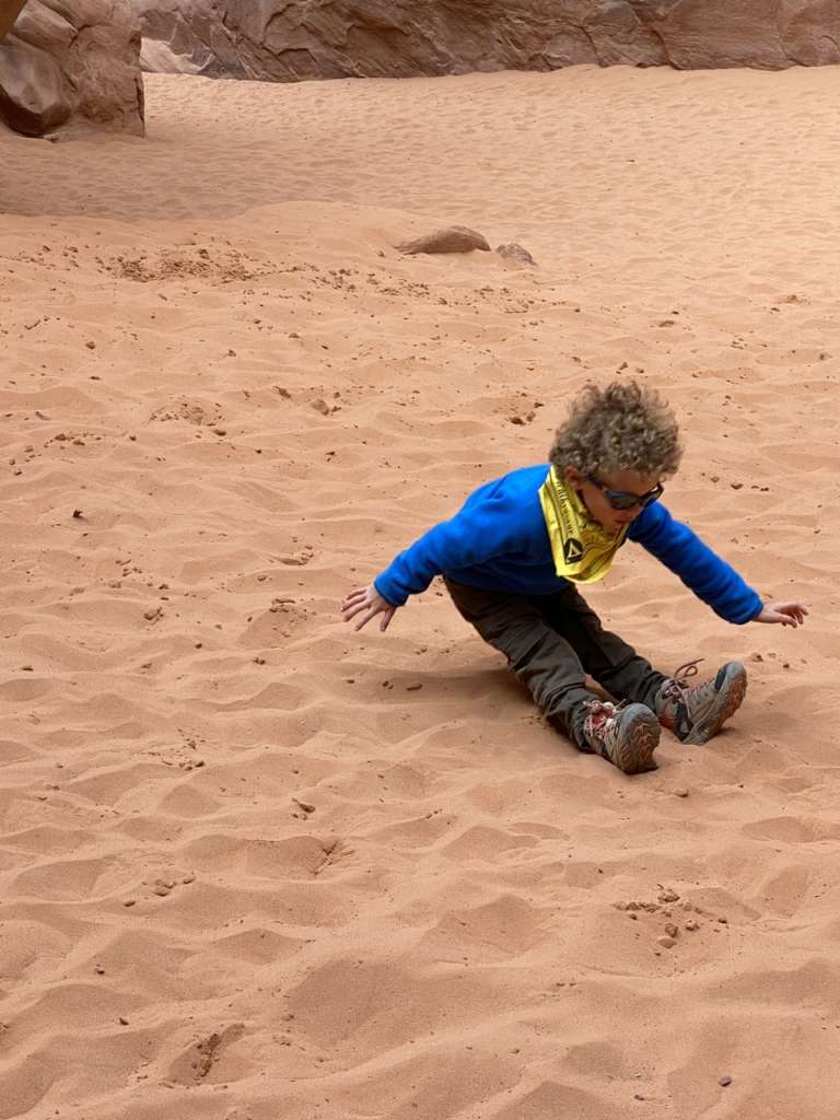 Noah est très excité à l’idée de faire cette balade. Plonger dans un petit canyon étroit rempli de sable, que demander de plus ? On passera plus d’une heure à arpenter ce petit canyon avec lui, à jouer dans le sable et à contempler l’arche sur place. D’ailleurs celle-ci commence à me réconcilier un peu avec les arches. C’est que nous devenons exigeants à arpenter en long et en large la planète depuis plus de 20 ans.