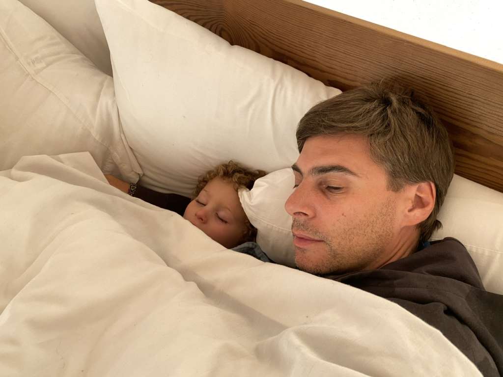 La tente c’est bien, mais le matin au réveil, ça pique. 6h et quelques, il fait moins de zéro degrés dehors et probablement à peine plus à l’intérieur. Heureusement, Noah est moins à son habitude de vouloir dormir à poil au-dessus de la couverture, mais ca ne l’empêche pas ponctuellement de sortir une patte dehors et de te virer la couette apr la même occasion. Pour ne rien arranger, il a un fichu ongle de pied en mode griffe de puma qui nous a labouré les jambes une bonne partie de la nuit. Du coup on passe notre temps à le remettre régulièrement sous la couette. Lui, il reste au chaud, tandis que nous, on se gèle.