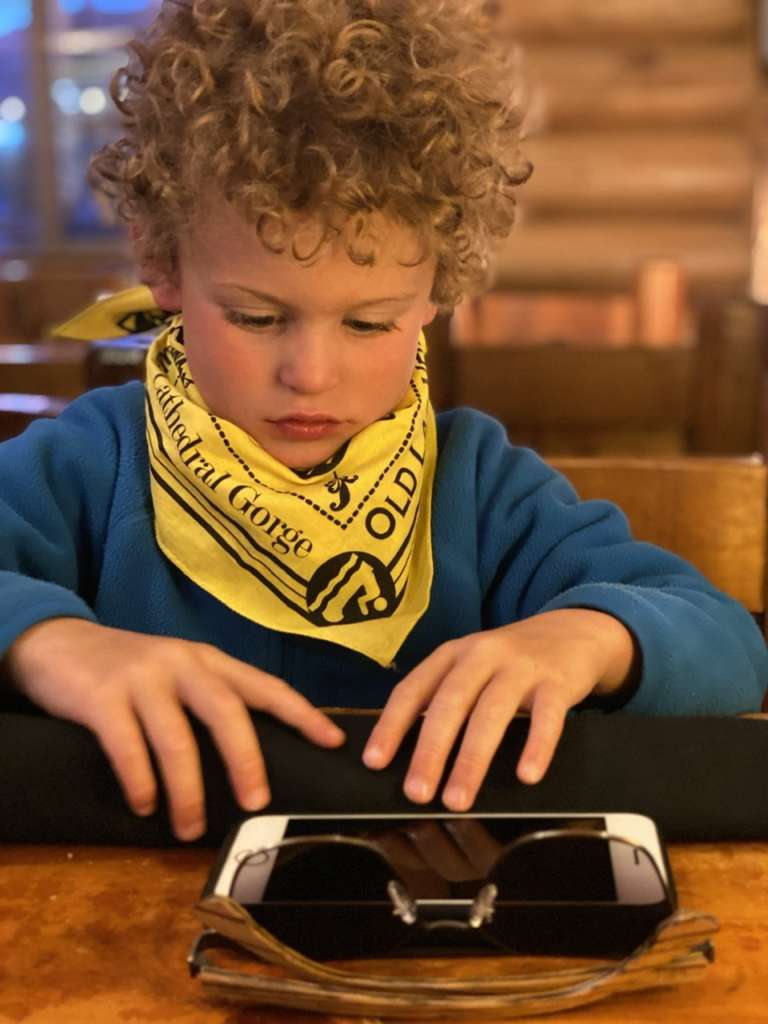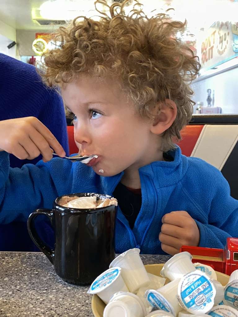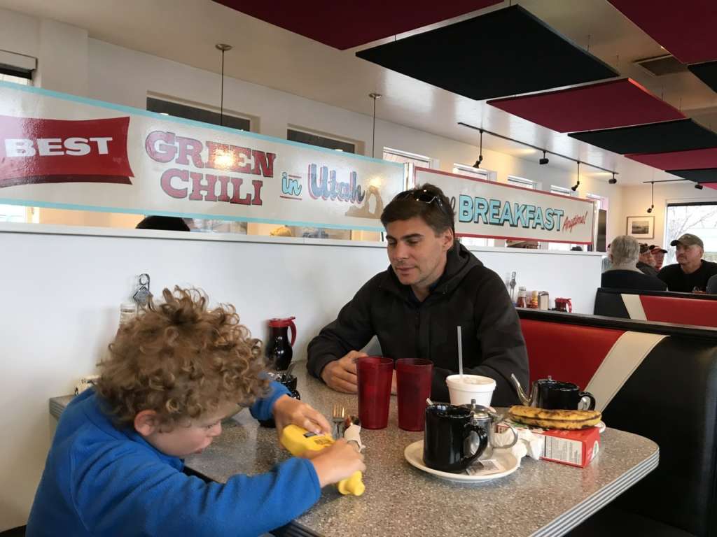 En tout cas, au moins, ca passe l’envie de rester 1h à glander dans la tente. En 20 minutes tout le monde est prêt et on part vers Moab se prendre un petit déjeuner dans un restau typique américain : le Moab Diner. L’occasion pour Noah de se prendre un chocolat chaud.