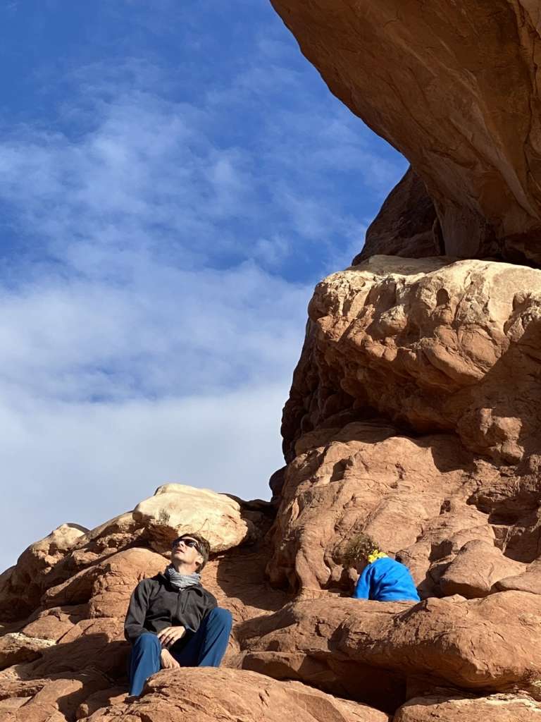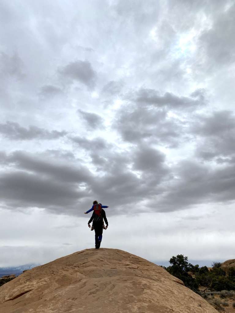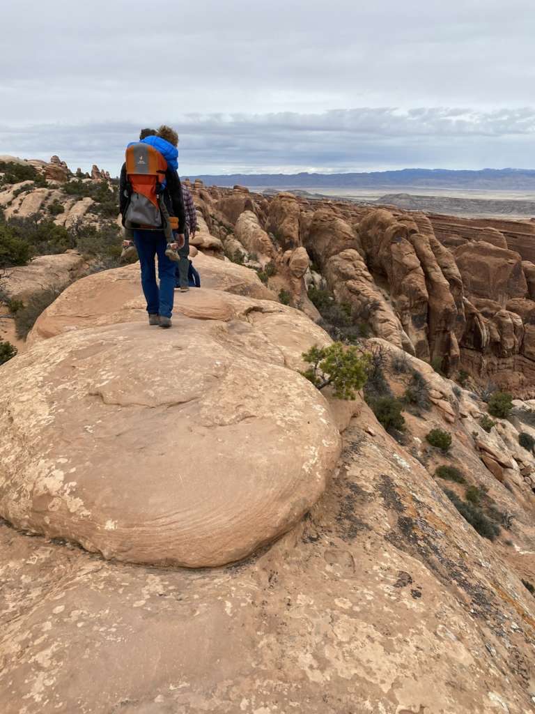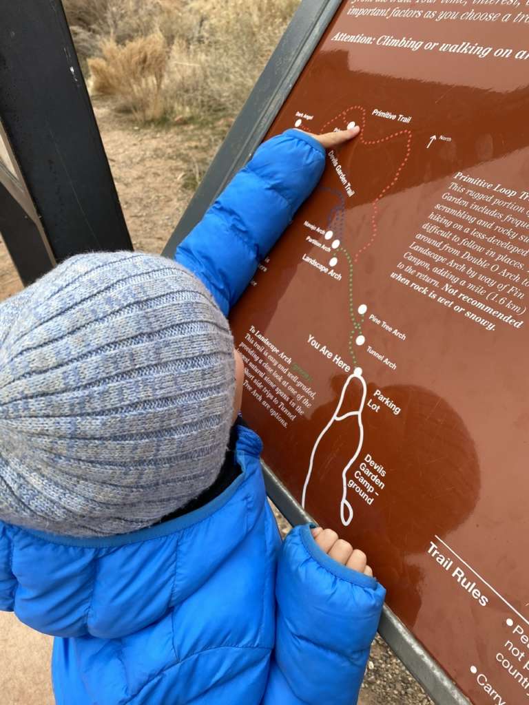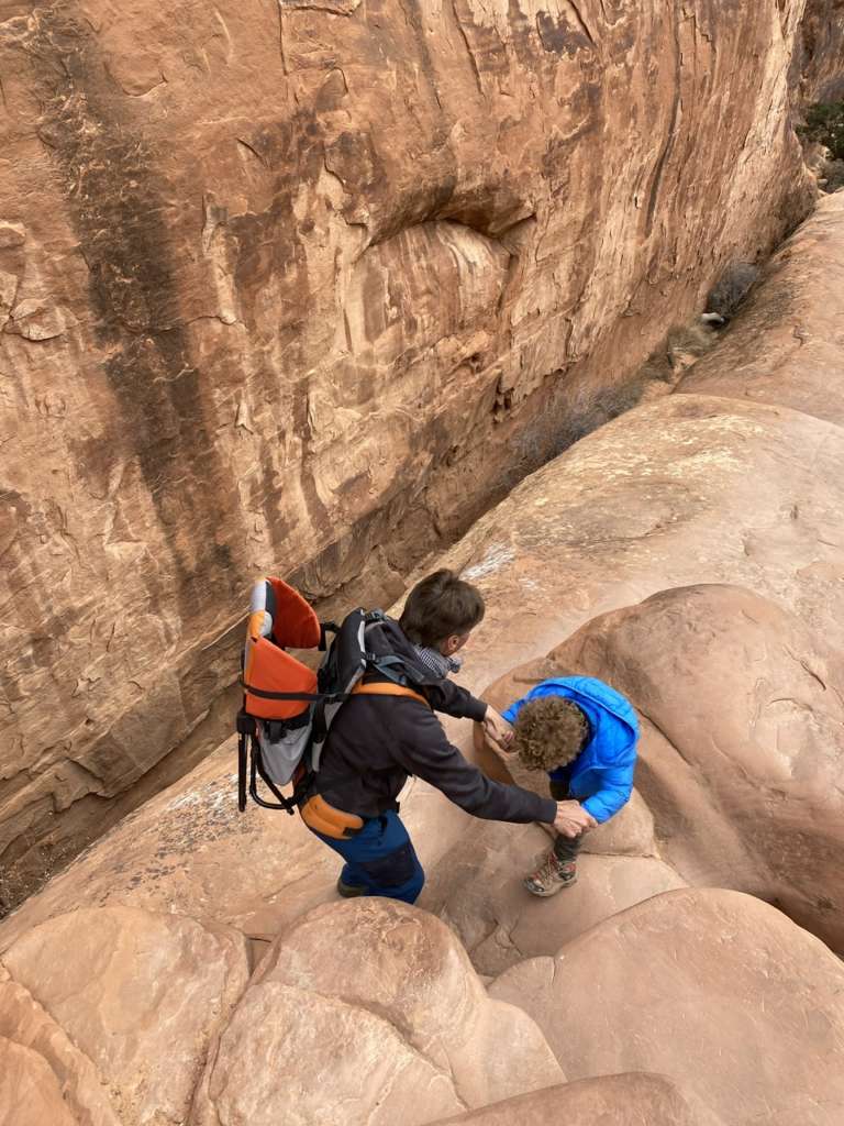 Tandis qu’on tergiverse avec Virginie sur la route à prendre – la faute à un panneau qui prête à confusion – Noah se retrouve coupé dans le peu de rythme qu’on avait réussi à imprimer, et il se met carrément à l’arrêt. En effet, dans le prolongement de l’arche, des randonneurs partent à l’assaut d’une arête rocheuse qu’il faut escalader à 4 pattes par endroit visiblement. Comme un panneau indique le Primitive Trail alors qu’on était persuadé d’avoir vu 100m en amont que c’était le chemin vers le Double O Arch, on ne sait plus bien sur quel chemin on est. On revient donc un peu sur nos pas et on finit par comprendre qu’on était sur le bon chemin depuis le début et que le panneau annonce en fait qu’on peut rejoindre le Primitive Trail par la Double O Arch.