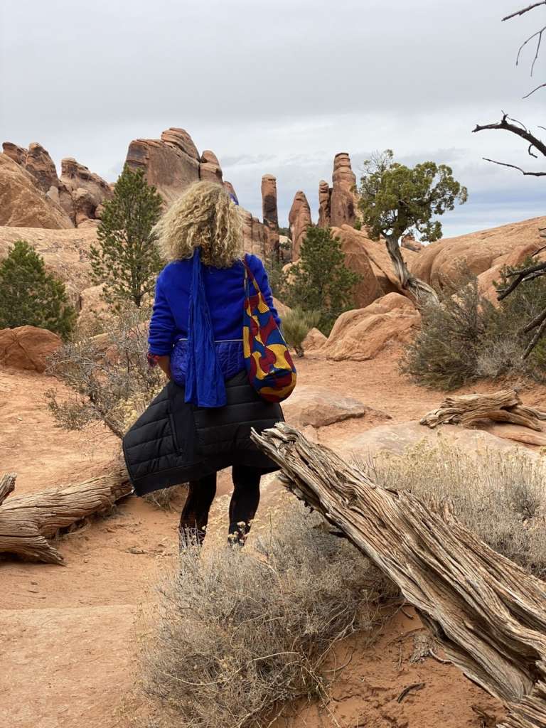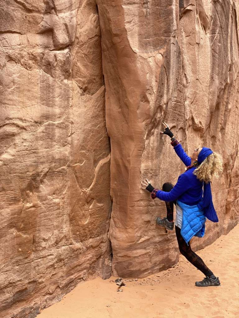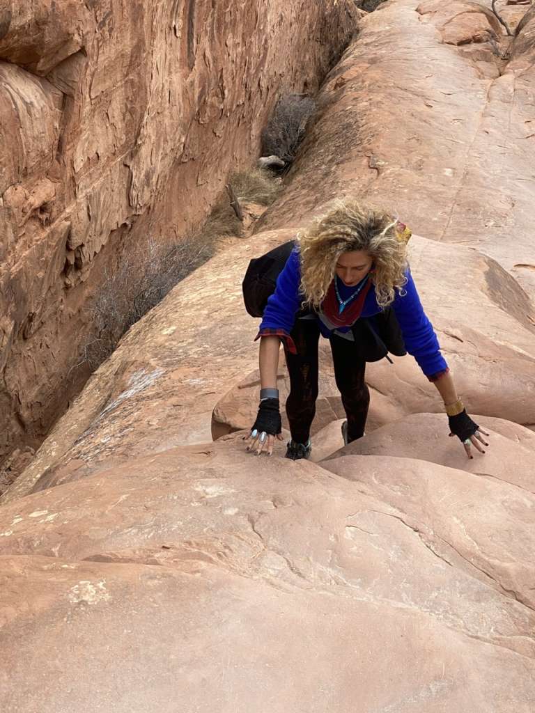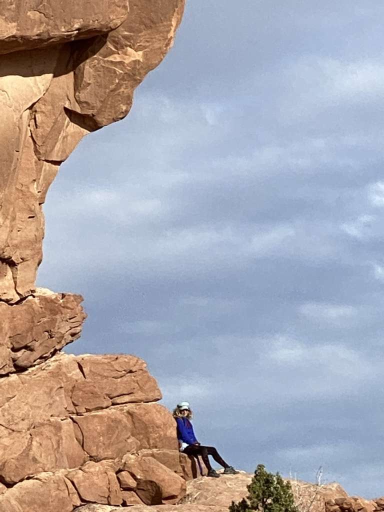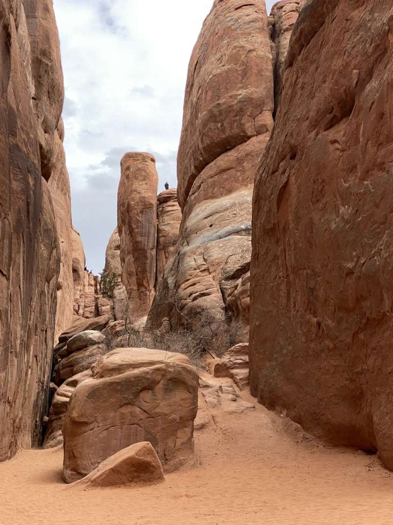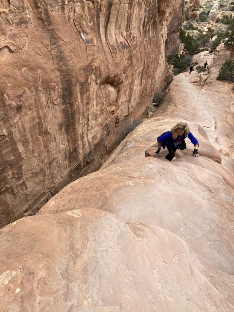 Tandis qu’on tergiverse avec Virginie sur la route à prendre – la faute à un panneau qui prête à confusion – Noah se retrouve coupé dans le peu de rythme qu’on avait réussi à imprimer, et il se met carrément à l’arrêt. En effet, dans le prolongement de l’arche, des randonneurs partent à l’assaut d’une arête rocheuse qu’il faut escalader à 4 pattes par endroit visiblement. Comme un panneau indique le Primitive Trail alors qu’on était persuadé d’avoir vu 100m en amont que c’était le chemin vers le Double O Arch, on ne sait plus bien sur quel chemin on est. On revient donc un peu sur nos pas et on finit par comprendre qu’on était sur le bon chemin depuis le début et que le panneau annonce en fait qu’on peut rejoindre le Primitive Trail par la Double O Arch.