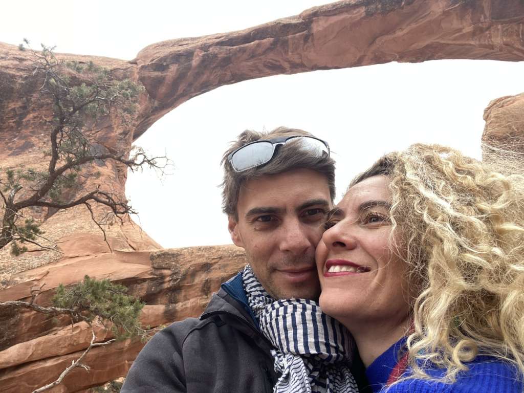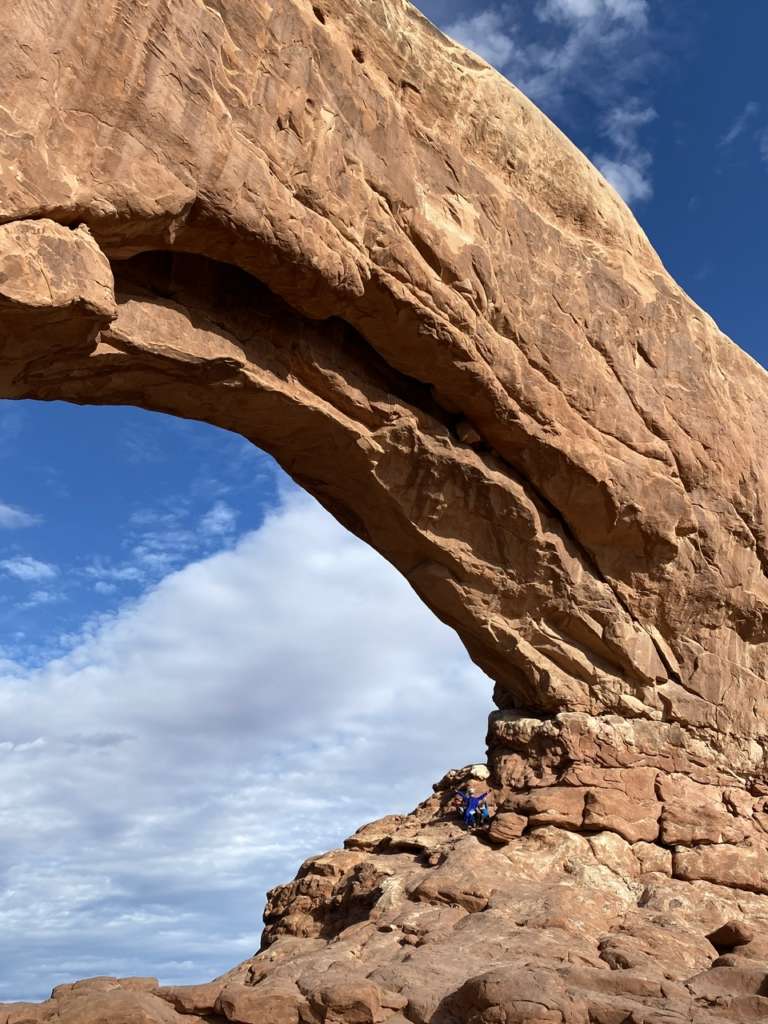 Puis on se dirige vers Turret Arch. On passe d’abord dessous, puis de l’autre côté pour avoir le soleil dans le dos. Bien nous en prend car en montant sur un promontoire un peu plus loin, on découvre que cette arche se retrouve ainsi en enfilade avec la south Window. L’endroit est un peu trop escarpé avec notre agitateur numéro 1 pour faire la photo parfaite de l’enfilade des 2 arches mais ca reste un bon moment.