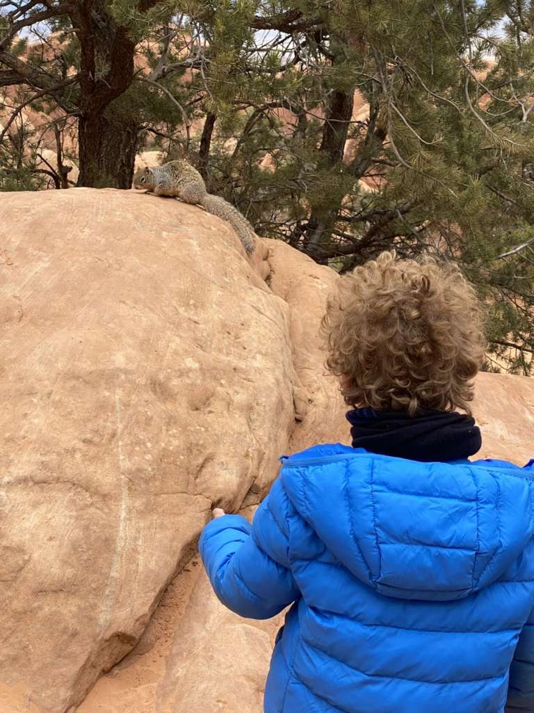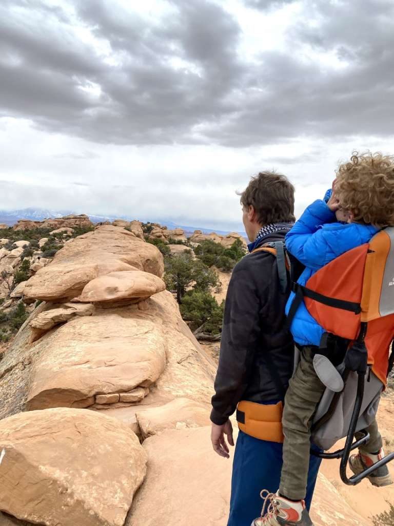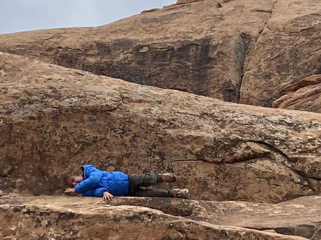 Vous n’avez rien compris ? C’est normal, nous non plus si ce n’est que l’arête rocheuse c’est pour maintenant et que si le Double O arch commence ainsi, effectivement le Primitive trail risque d’être coton. D’autant que maintenant, Noah vient de s’allonger sur le rocher parce qu’il ne veut plus marcher.