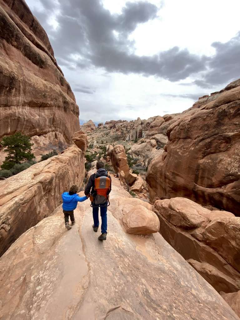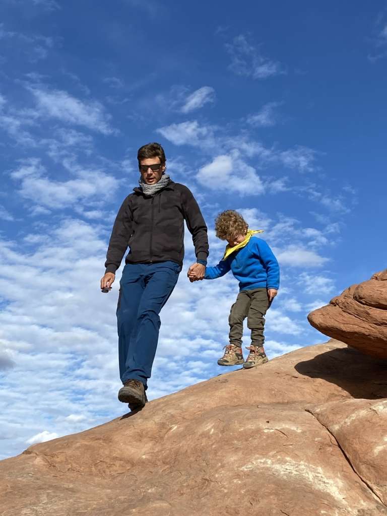 Sur le retour, même combat, notre petit Noah se laisse porter. L’avantage, c’est qu’on rentre plus vite. J’arriverais seulement à le faire marcher sur la dernière arête avant Landscape Arche. L’amuser, toujours l’amuser…