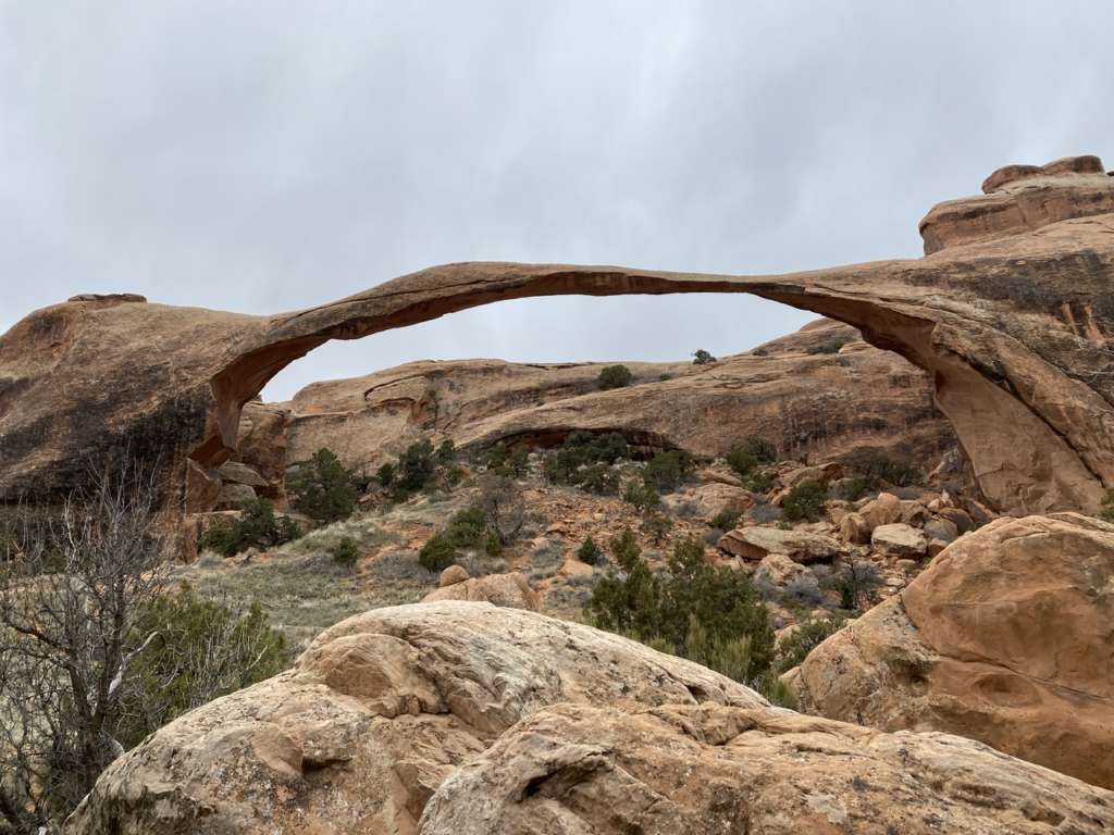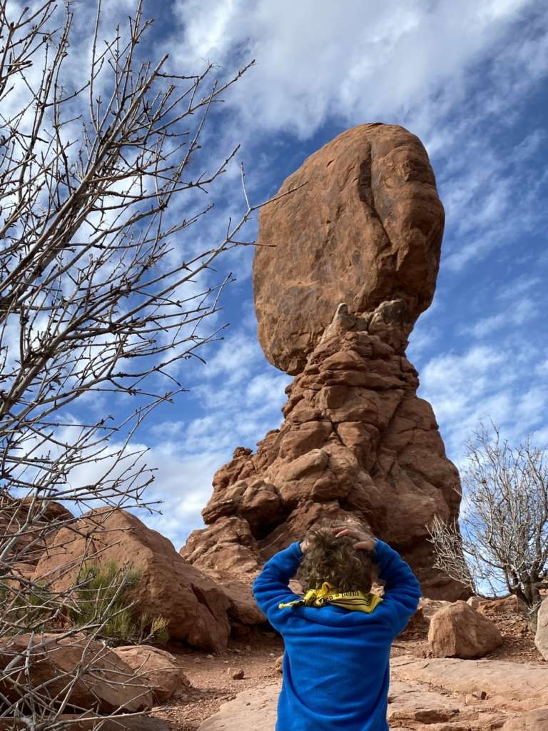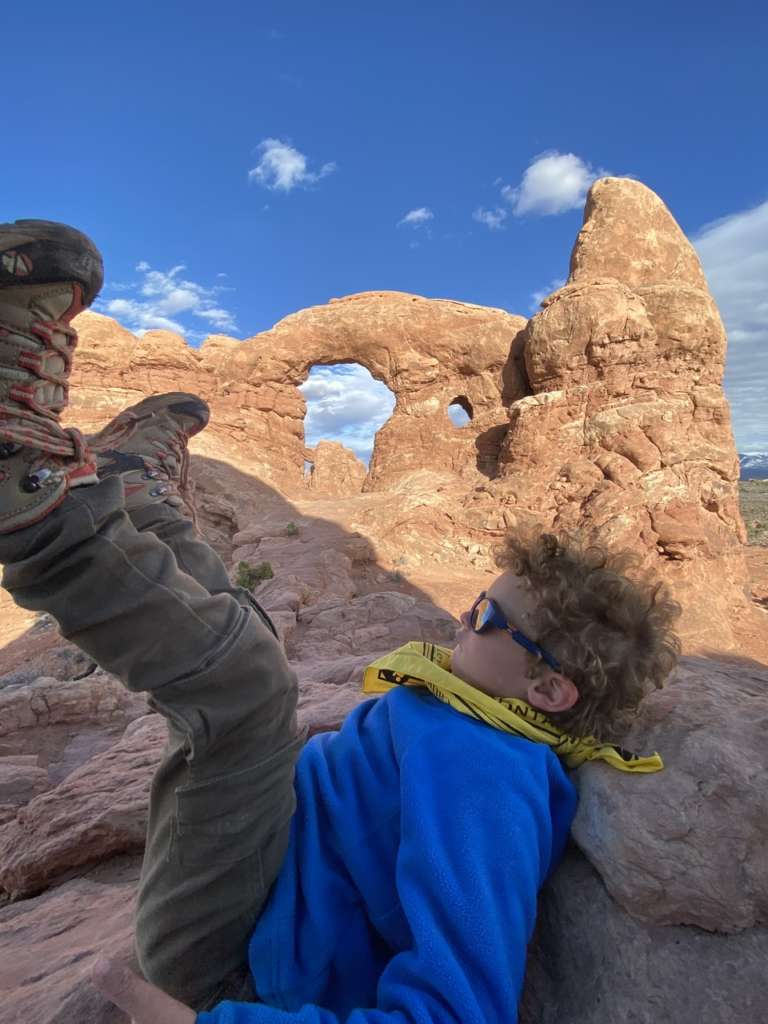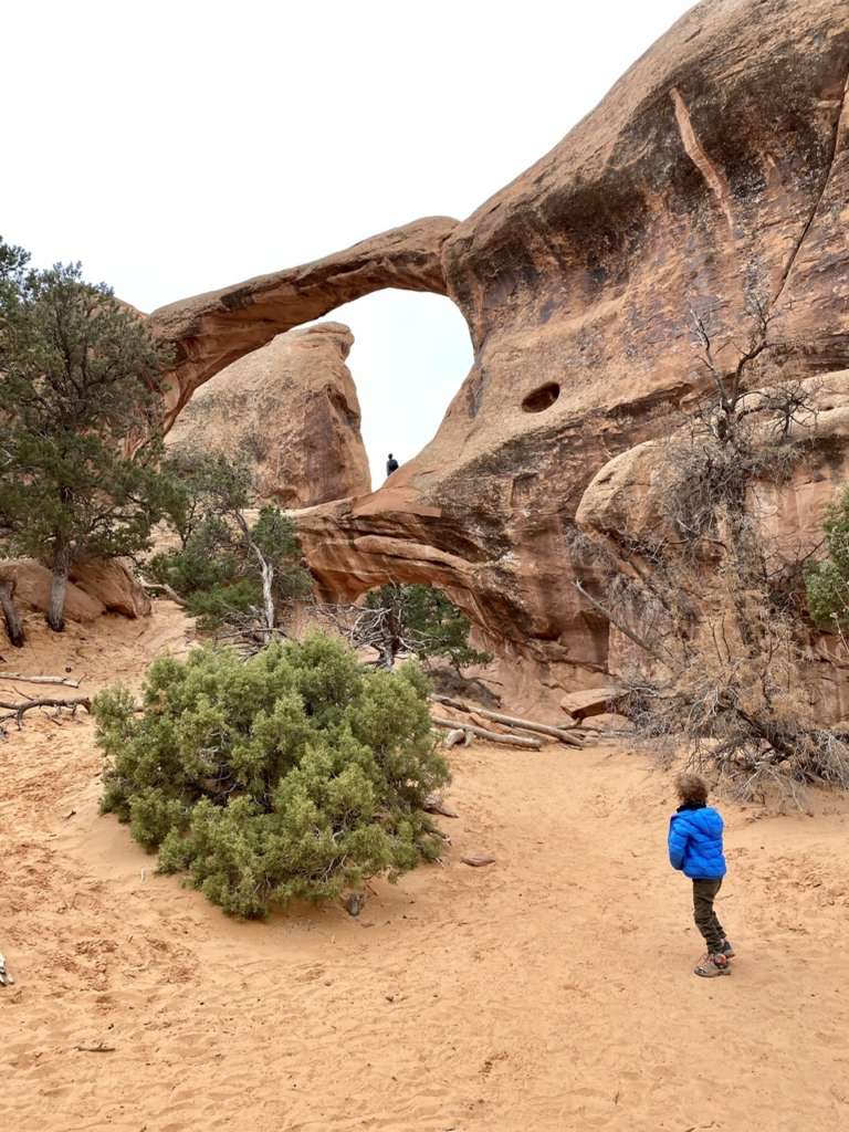 Arrivés à Landscape Arche, première information, Noah est dans un jour « sans ». Soit il s’ennuie un peu (ce qui arrive quand les étendues sont un peu trop vastes), soit il est juste fatigué. Même si le temps n’est pas d’un bleu azur, cette première arche est plus intrigante que belle en tant que tel.