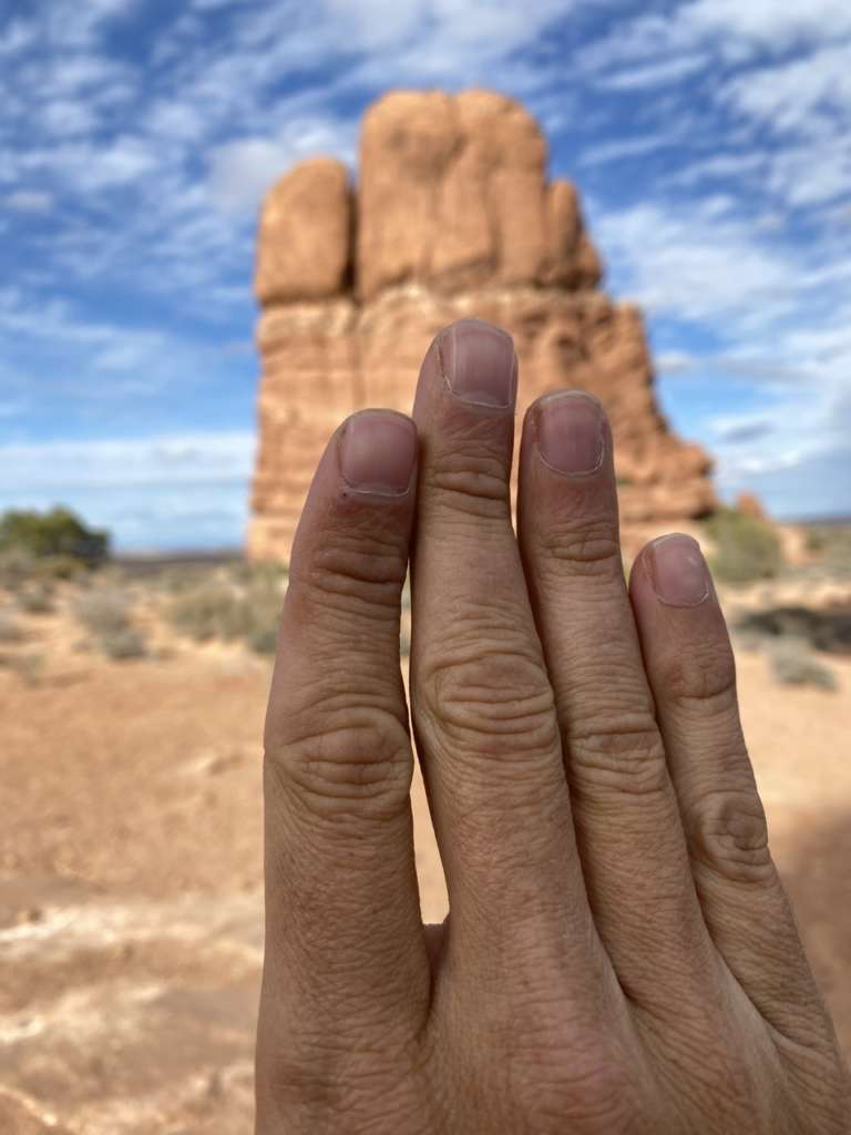 On poursuit donc avec un stop à Balanced Rock . Le plus marrant finalement en faisant le tour de ce rocher en équilibre précaire à 20m au-dessus de nos têtes, c’est le rocher en forme de main tout à côté.