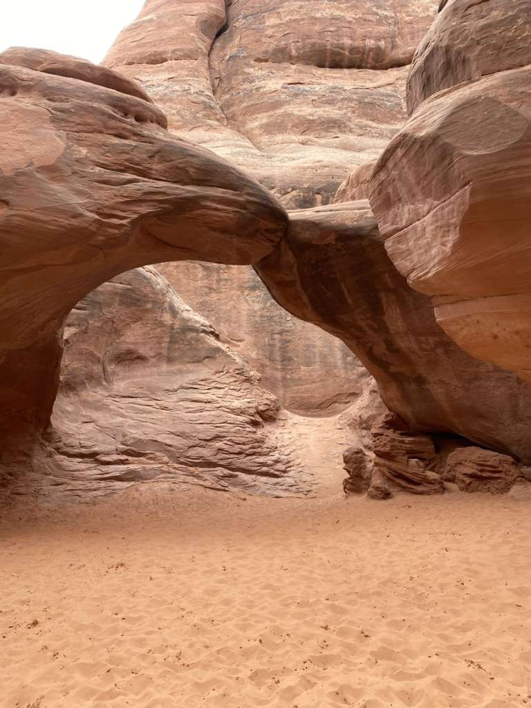 Mis à part ce « pont de roche » et le raidillon du début, cette rando est En fait tout à fait tranquille. D’ailleurs on ne tarde pas à arriver à Double O Arch. Sentiment toujours un peu mitigé me concernant sur la « beauté » des arches. Le ciel est encore couvert alors certes, elles se découpent moins dans le ciel, mais bon, ce n’est pas encore un coup de coeur. En revanche, tu ne peux t’empêcher de demander comment l’eau a réussi à creuser ces arches (car ici c’est bien l’eau et pas le vent). En tout cas, avec VIrginie, on n’a pas encore « le frisson » de certains lieux.