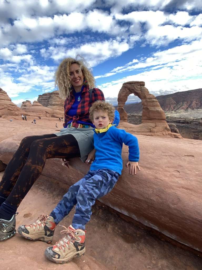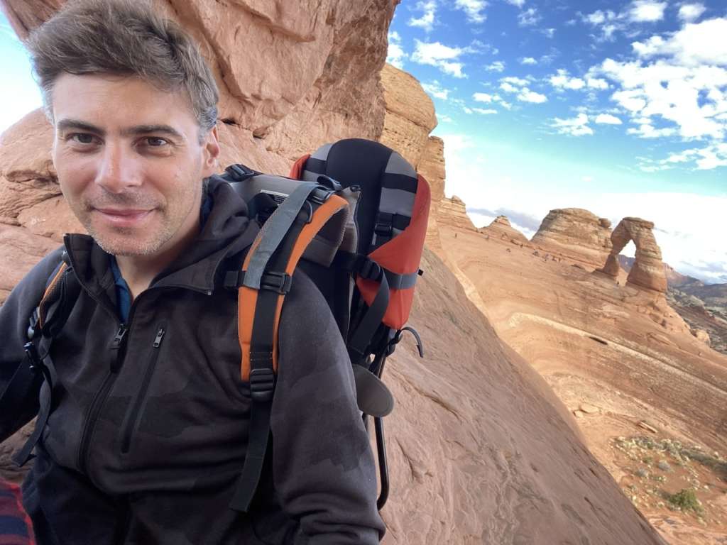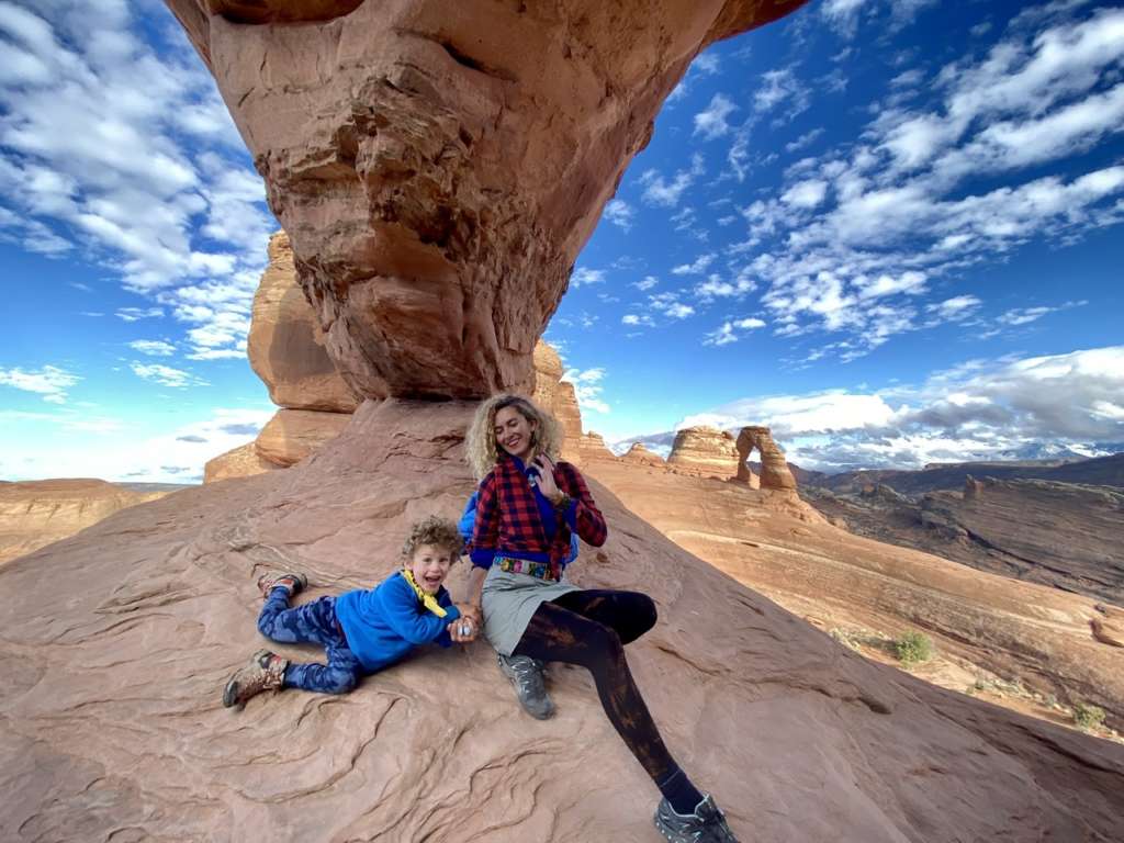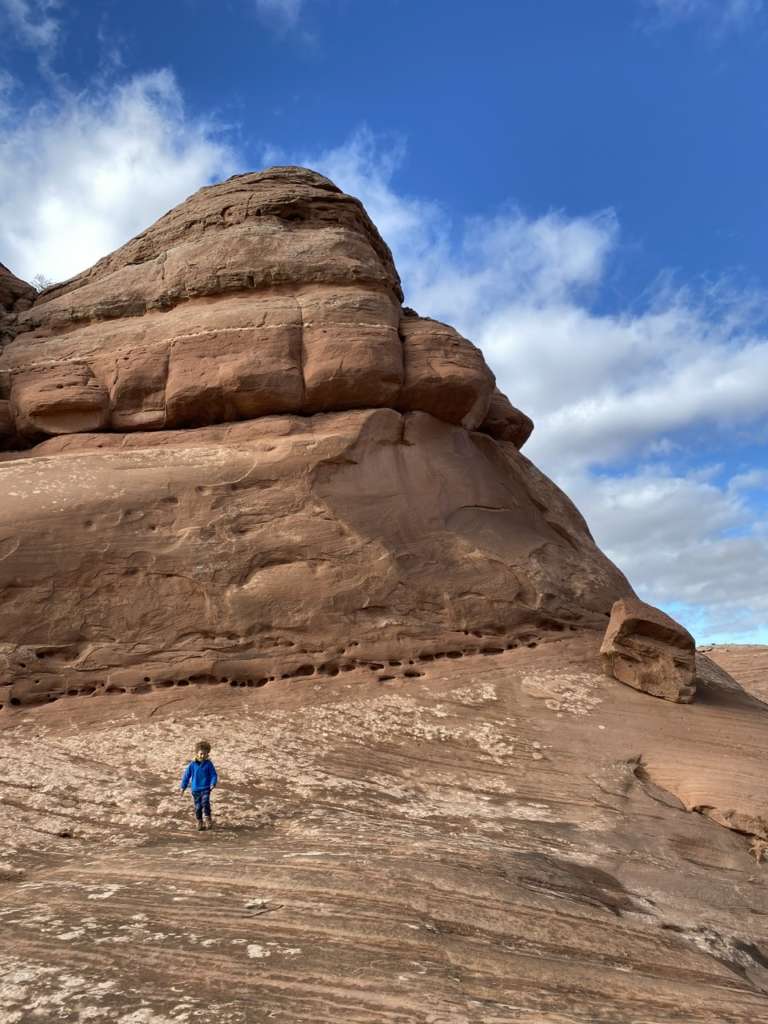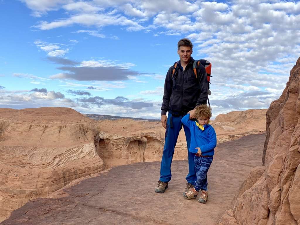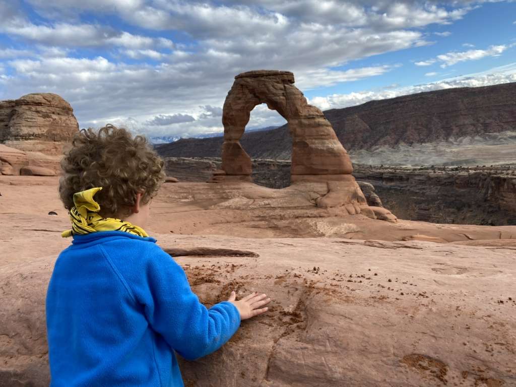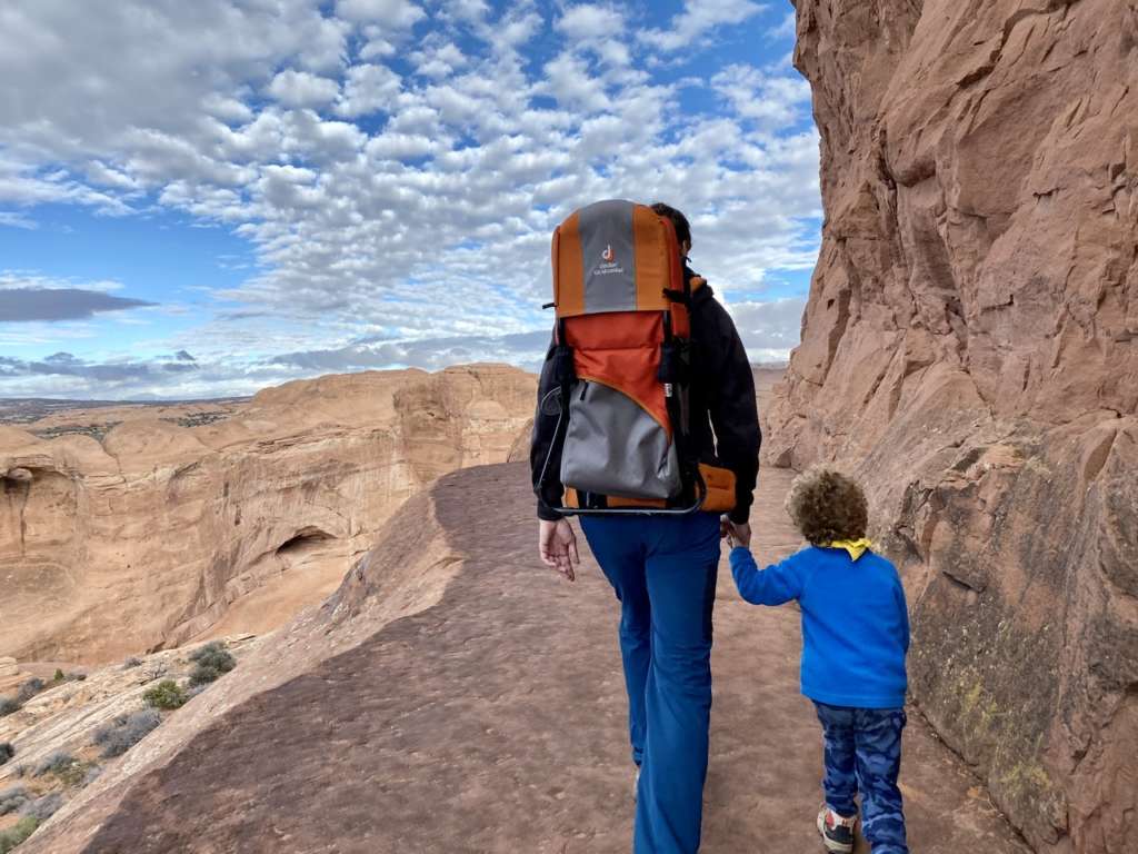 Arrivés devant ‘la vue officielle” de Délicate Arch, c’est super d’ici aussi, même si avoir Noah qui virevolte dans un environnement où tout pas inconsidéré risque de te précipiter dans le vide 200 mètres plus bas n’est pas de tout repos. Quant à aller sous l’arche comme le font quelques guignols, je suis sur que c’est finalement assez safe, mais marcher en équilibre précaire sur un sol à 30 degrés qui semble vouloir t’avaler dans le gouffre de l’enfer avec Noah qui voudra bien sûr venir aussi, très peu pour nous. On se contente donc d’être sages et de rester du côté le plus raisonnable.