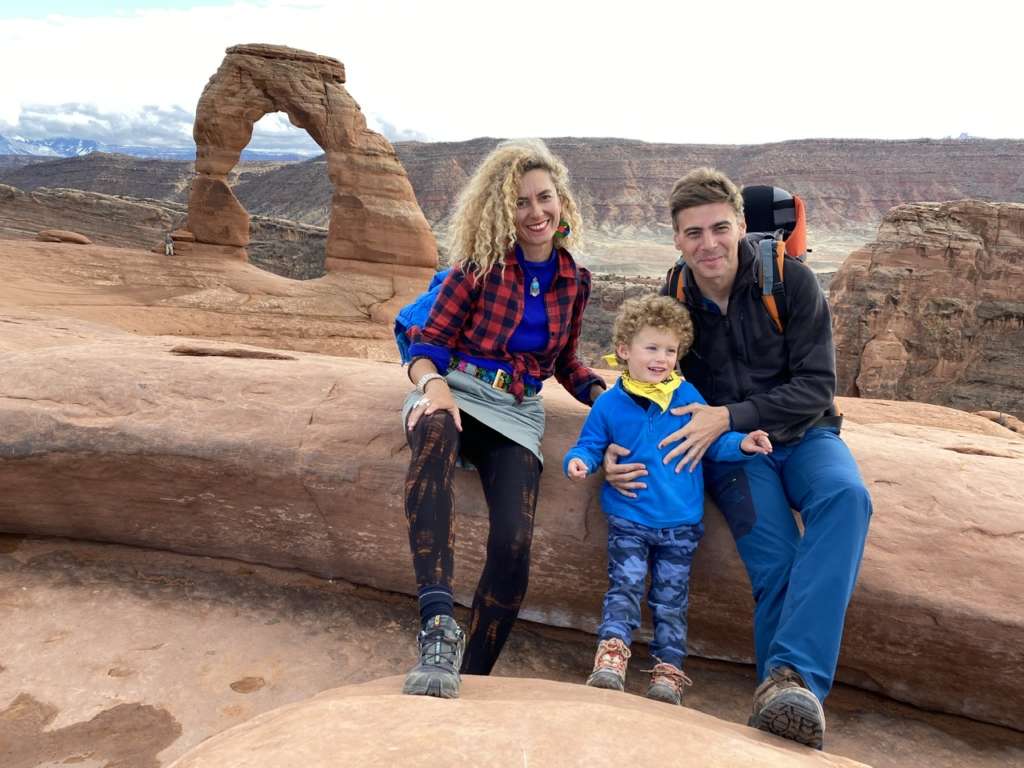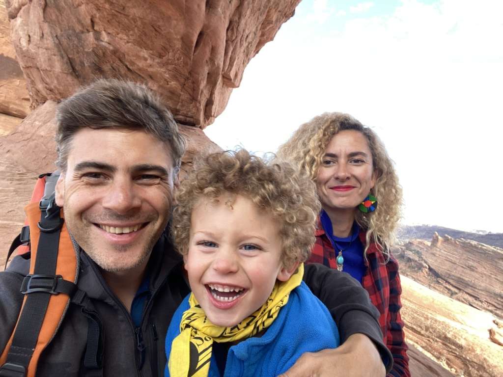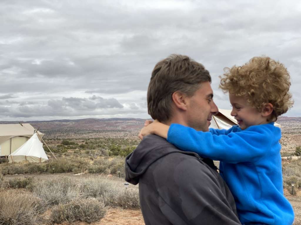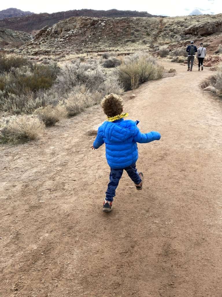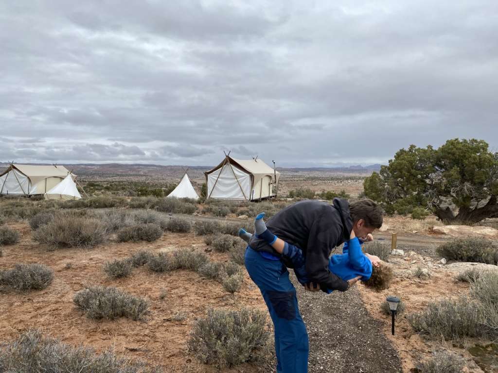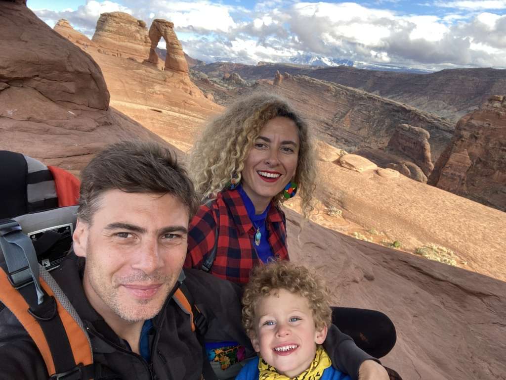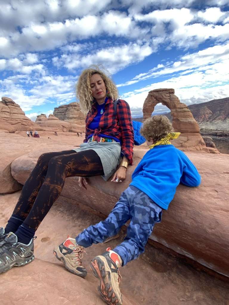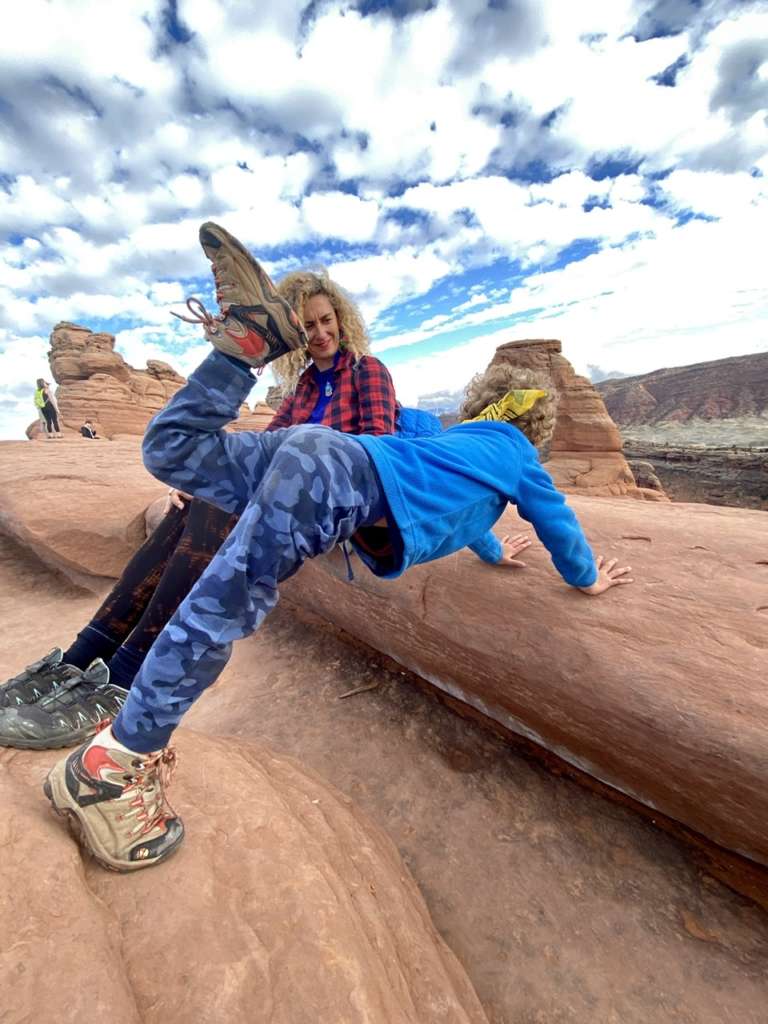 Arrivés devant ‘la vue officielle” de Délicate Arch, c’est super d’ici aussi, même si avoir Noah qui virevolte dans un environnement où tout pas inconsidéré risque de te précipiter dans le vide 200 mètres plus bas n’est pas de tout repos. Quant à aller sous l’arche comme le font quelques guignols, je suis sur que c’est finalement assez safe, mais marcher en équilibre précaire sur un sol à 30 degrés qui semble vouloir t’avaler dans le gouffre de l’enfer avec Noah qui voudra bien sûr venir aussi, très peu pour nous. On se contente donc d’être sages et de rester du côté le plus raisonnable.