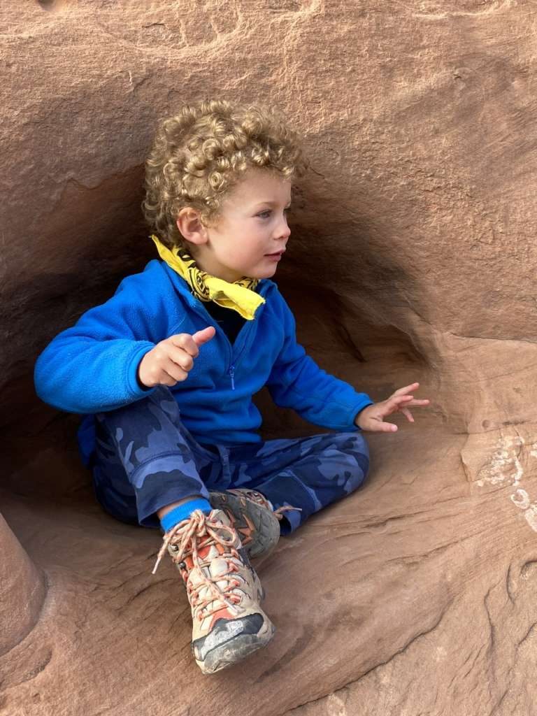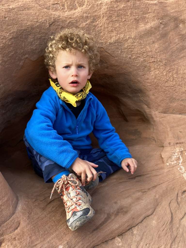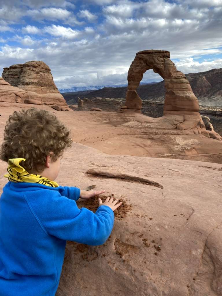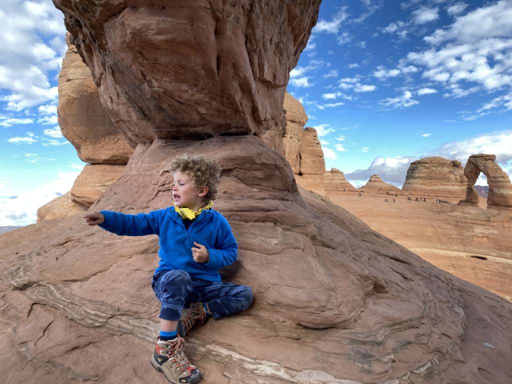 Alors que vous l’aurez compris Noah ne cessait de gesticuler, heureusement au bout d’un moment, il se pose et se met à récupérer de ci de la du sable pour nous faire des gâteaux. Ca pourrait être un défi Top Chef tient. Denis Brognard pourrait nous dire « Aujourd’hui, vous allez nous cuisiner un gateau en équilibre sur Delicate Arch par grand vent». On jouira ainsi de presque 20 minutes de contemplation sans avoir à le surveiller en permanence. C’est beau d’ici, mais On préfère notre super spot en amont.