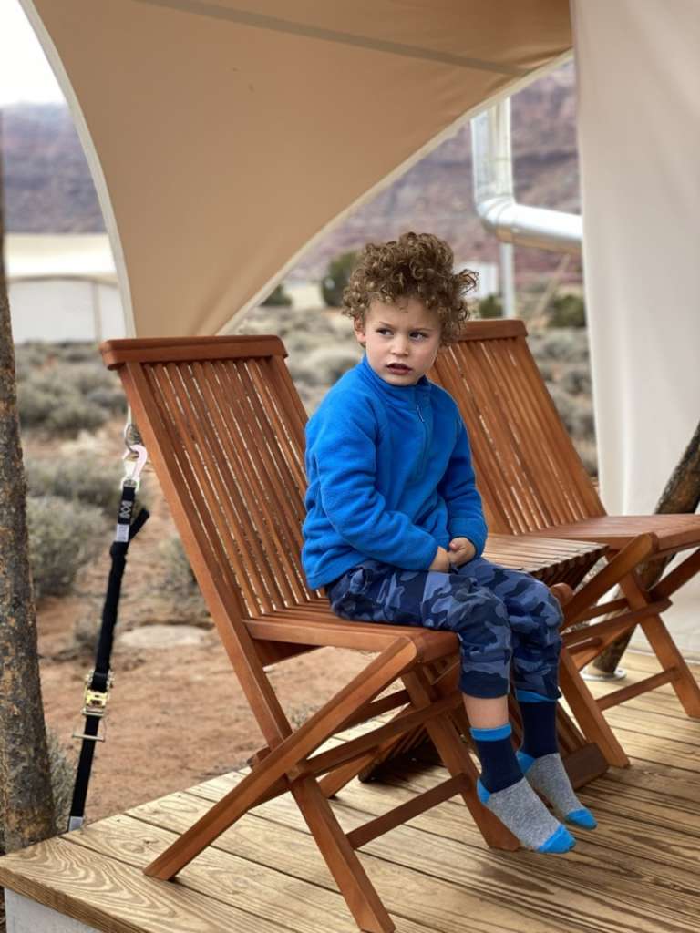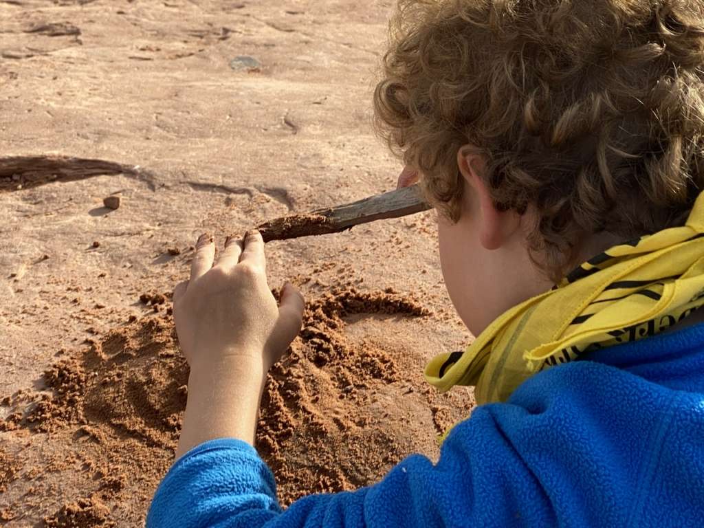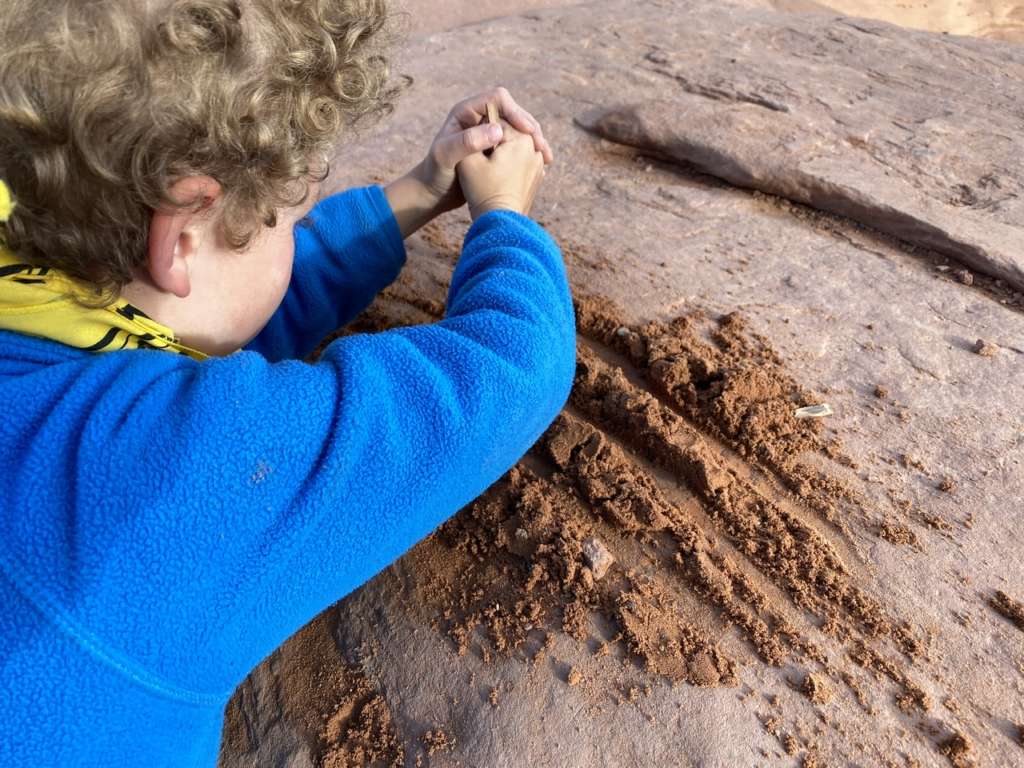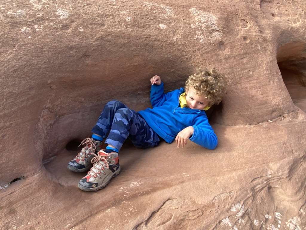 Alors que vous l’aurez compris Noah ne cessait de gesticuler, heureusement au bout d’un moment, il se pose et se met à récupérer de ci de la du sable pour nous faire des gâteaux. Ca pourrait être un défi Top Chef tient. Denis Brognard pourrait nous dire « Aujourd’hui, vous allez nous cuisiner un gateau en équilibre sur Delicate Arch par grand vent». On jouira ainsi de presque 20 minutes de contemplation sans avoir à le surveiller en permanence. C’est beau d’ici, mais On préfère notre super spot en amont.