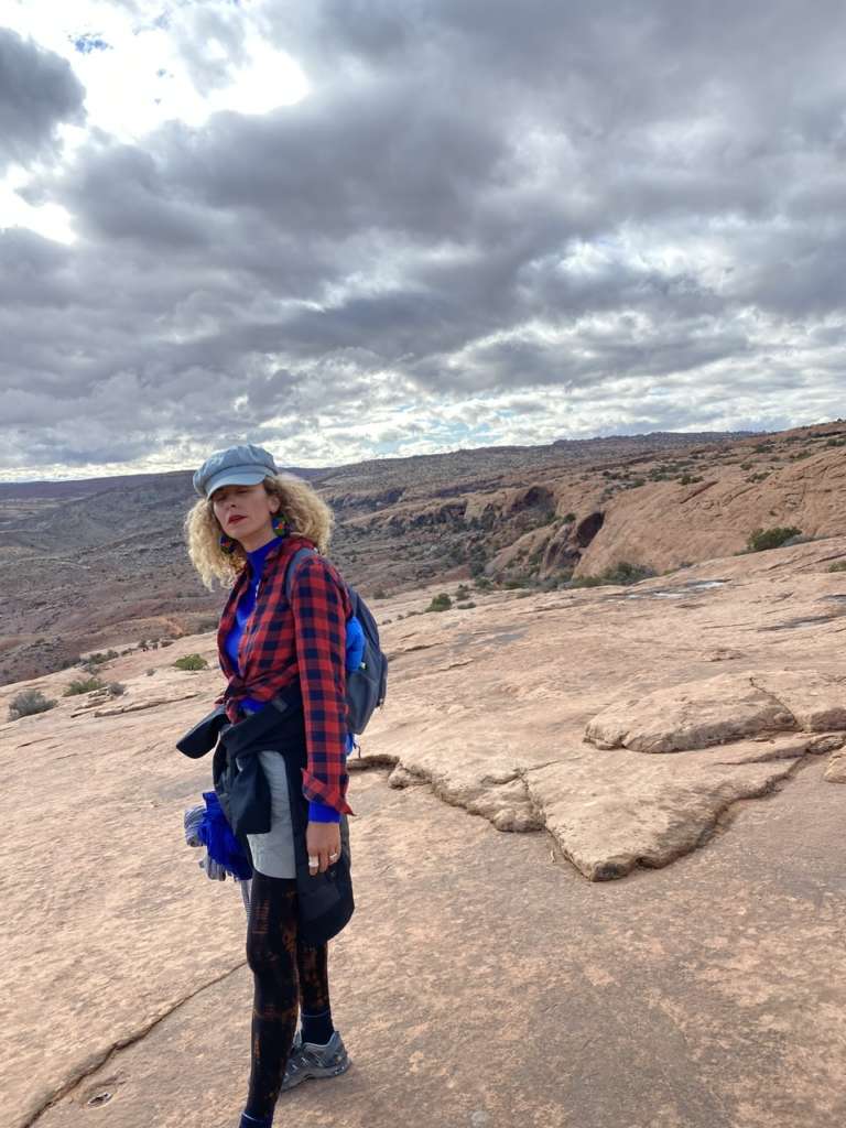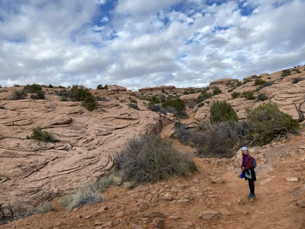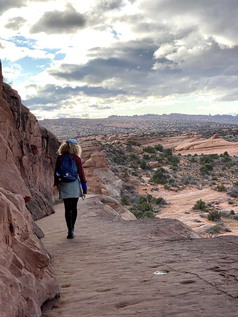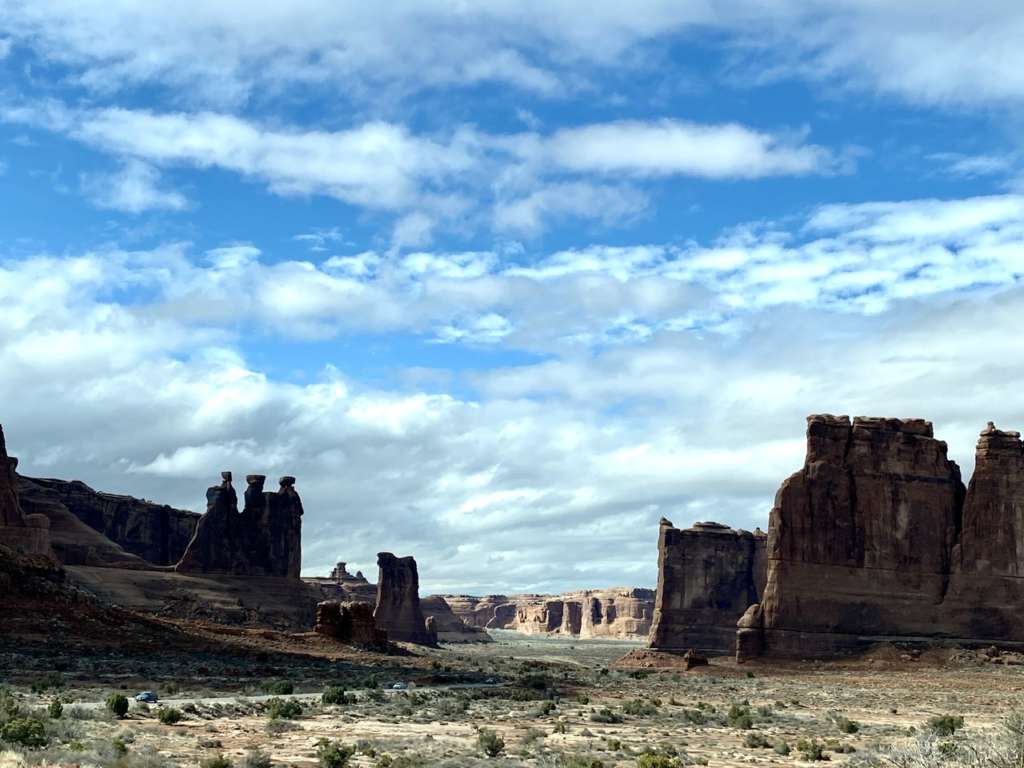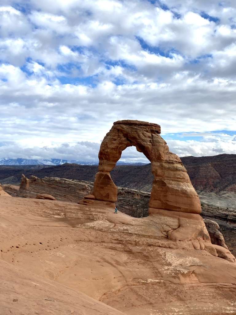 Ca y est, on est en ordre de marche, difficile de savoir qui du soleil ou des nuages va gagner, mais nous voilà quand même partis pour le parc des Arches direction la rando de Délicate Arches. Le « clou du spectacle » paraît-il du parc à faire en fin d’après-midi pour bénéficier de la meilleure luminosité.