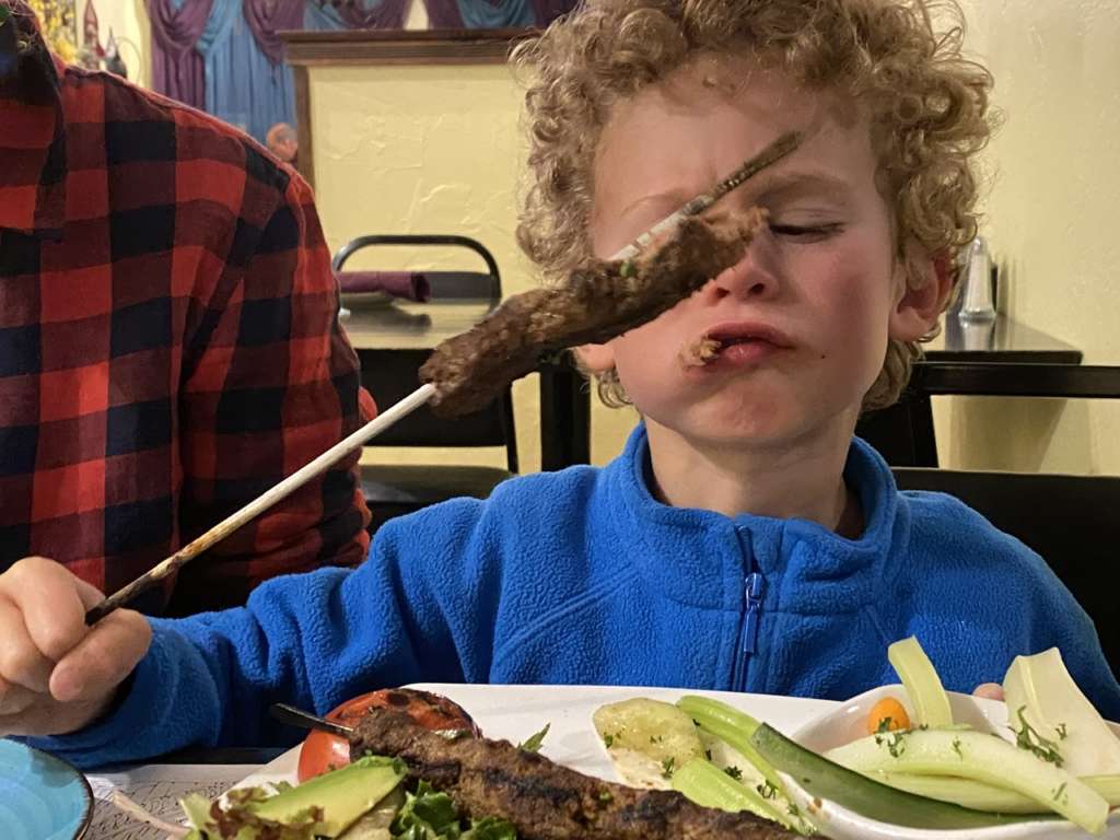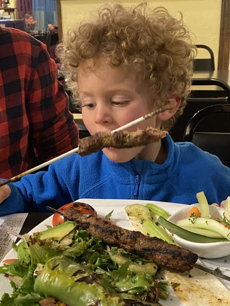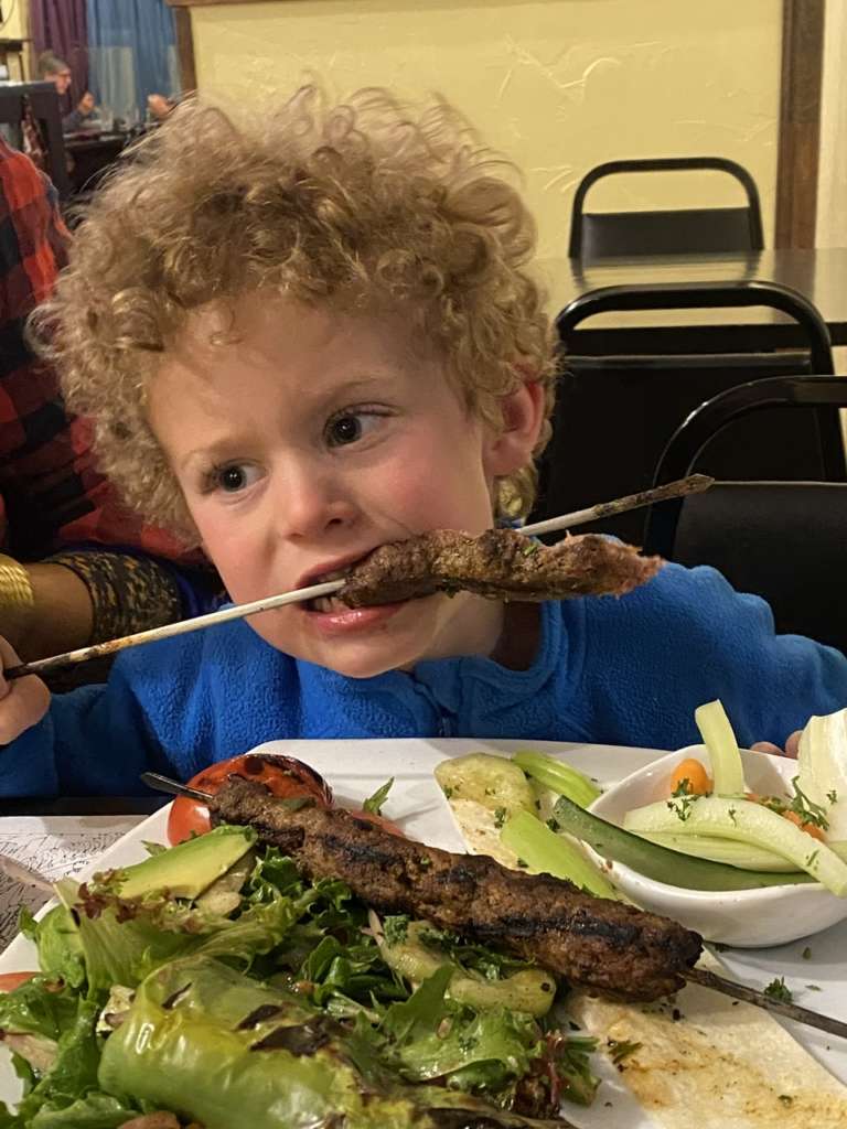 Pour le féliciter d’avoir aussi bien marché, on retourne à sa demande dîner à l’indien (il avait adoré les brochettes). Dernière nuit sous la tente. On fait le feu, on se met sous la couette. Il est chaud comme une petite caille. Pas de train ce soir, mais tout le monde s’endort paisiblement.