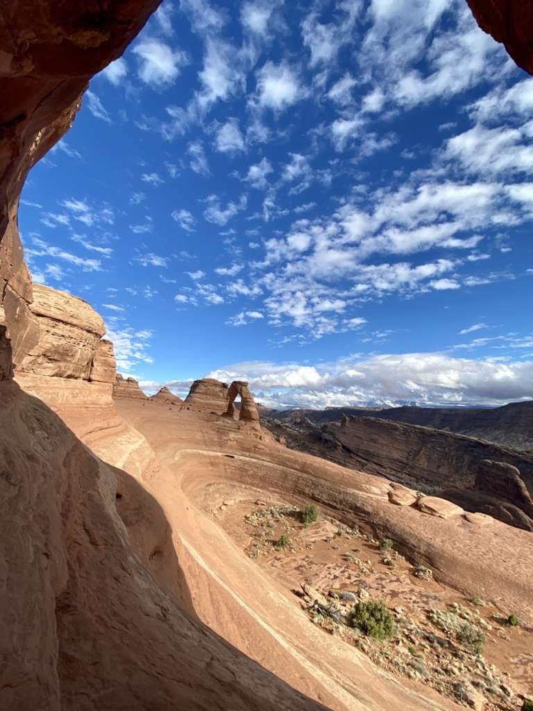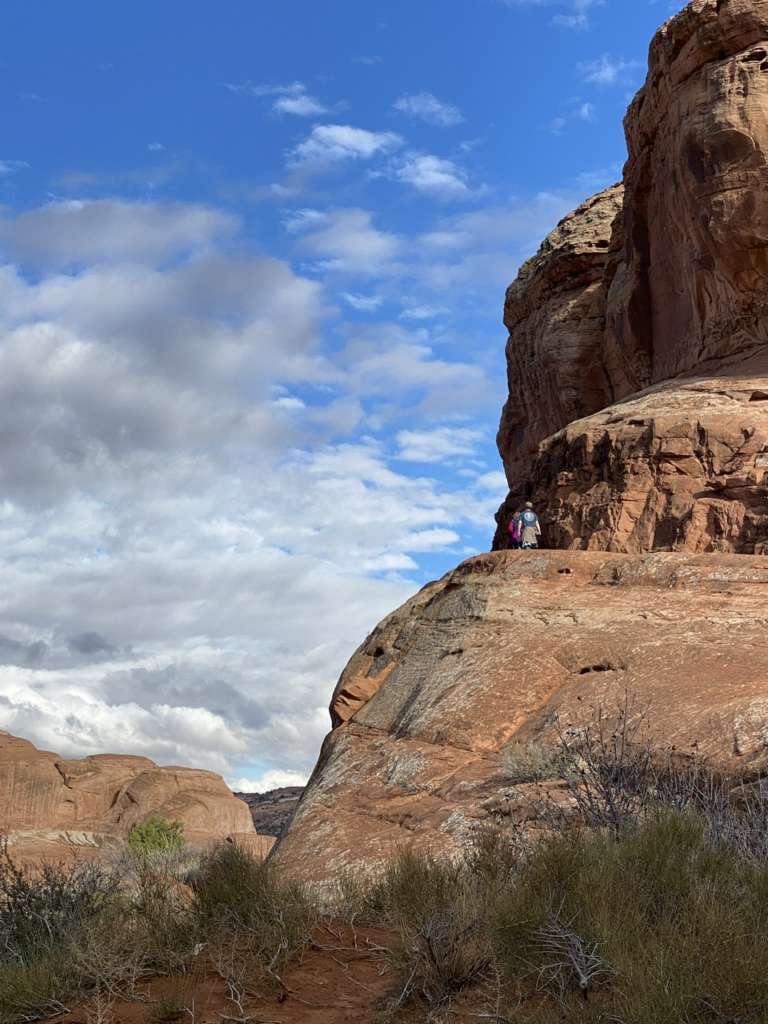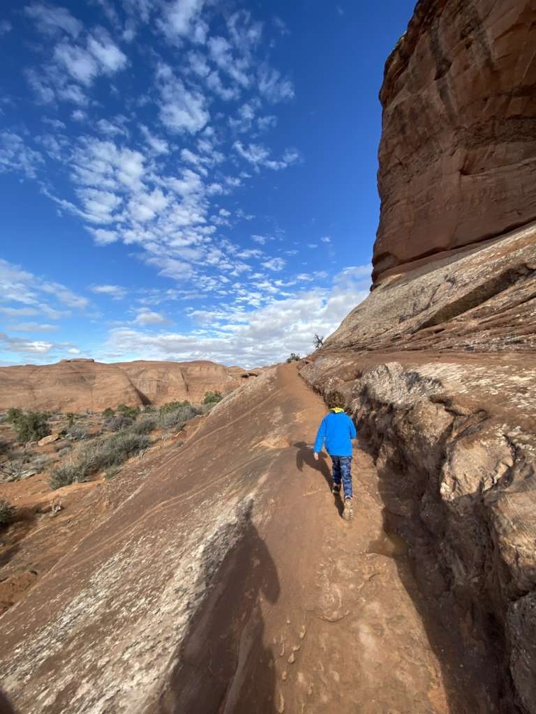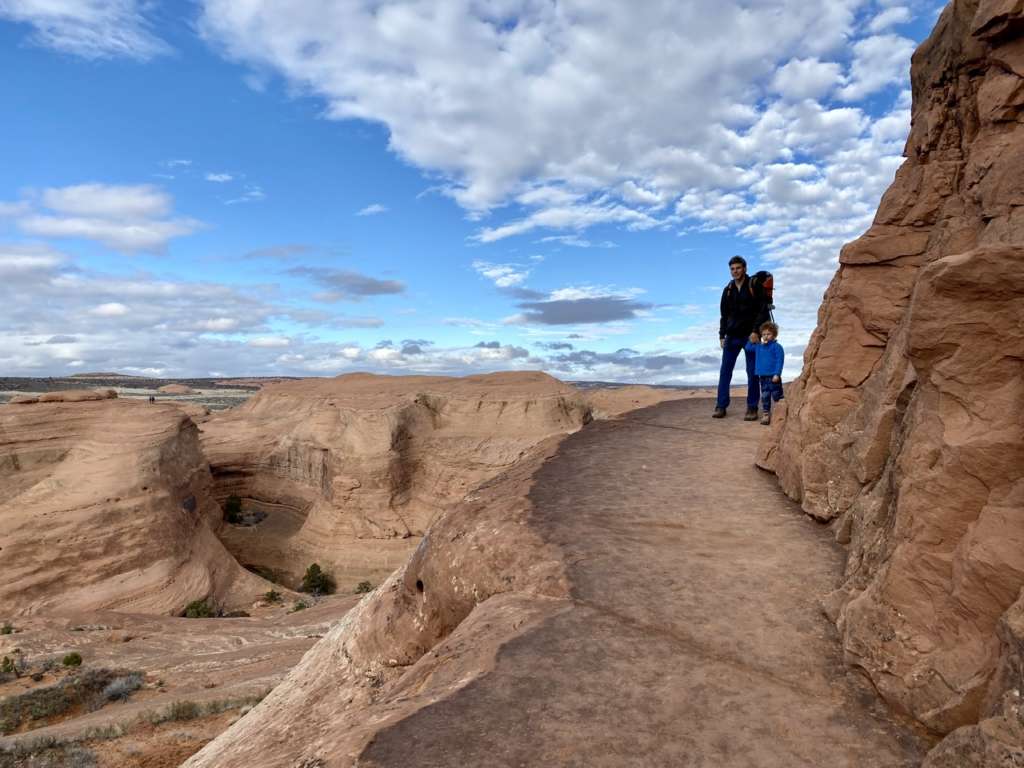 On redescend ensuite et on retrouve le chemin du commun des mortels Vers Delicate Arch. Si vous avez le vertige comme moi… pas de bol. Après, c’est vraiment très beau et il y en a pour 150 mètres maximum. Noah me tient gentiment la main pour me faire passer le vertige.