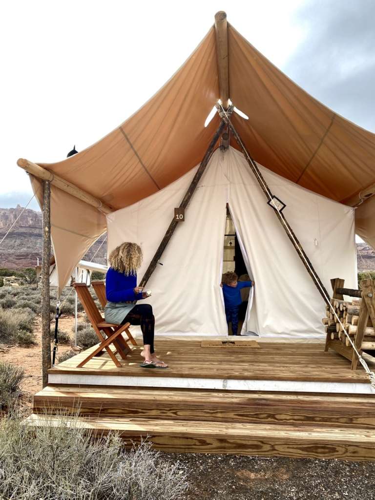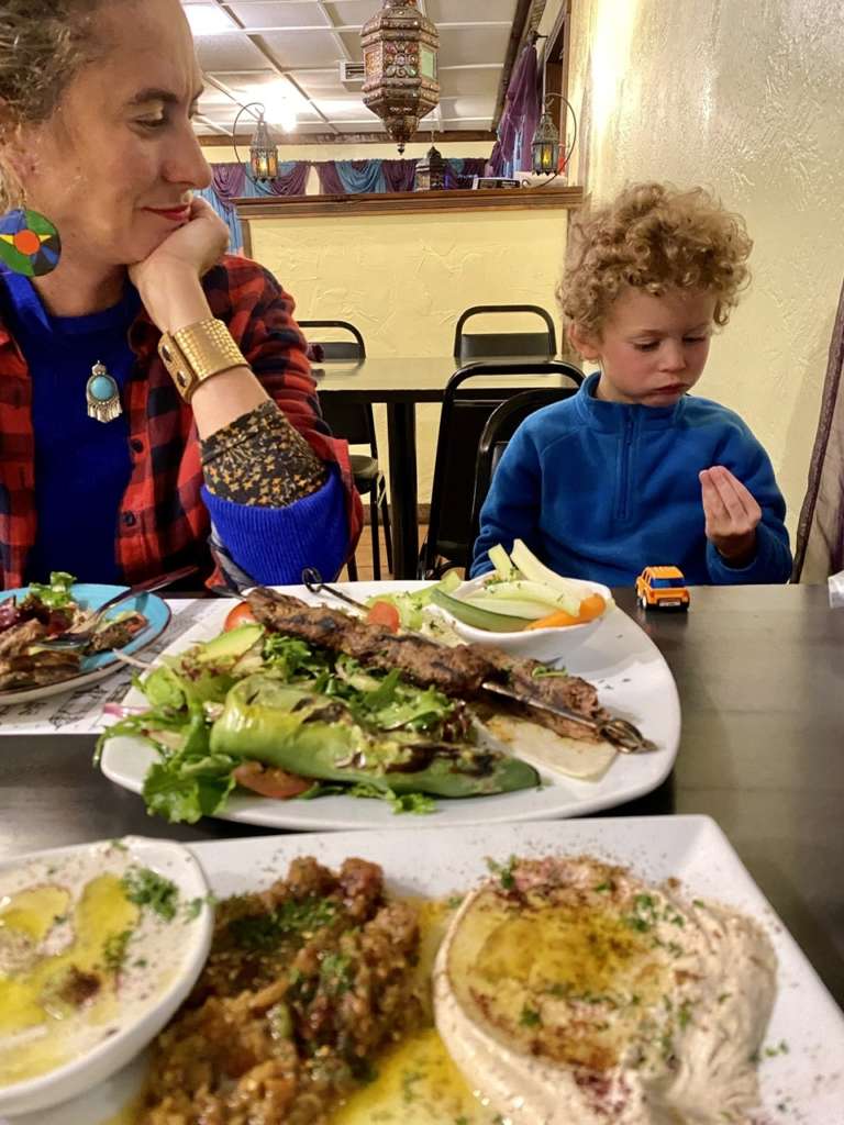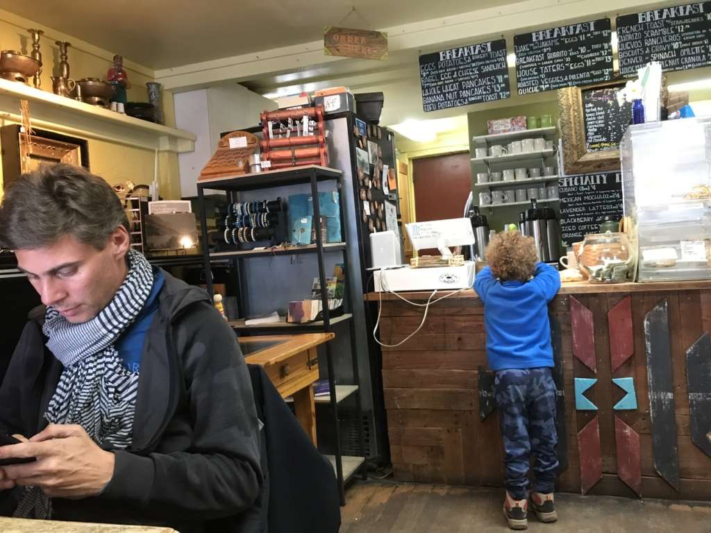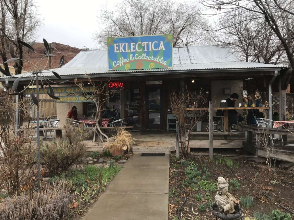 De toute façon on est debout et la pluie a rendu l’air dans la tente encore plus froid que la veille – ce que nous ne croyions pas possible –. Aussi, malgré le peu de perspectives de rando du matin, on se lève et on part petit déjeuner à Moab. On était parti pour aller au même endroit qu’hier matin car Noah avait adoré le petit dej, mais en passant, Virginie repère un petit café : Eclektica. On décide d’y aller et c’est super. C’est tout petit, plutôt bon, déco super chouette, et ca tombe bien car toutLea déco est à vendre. Autre « bonne » nouvelle, il y a enfin de l’internet. Dans les tentes, nada, dans les parcs, nada et dans les autres restaus, bizarrement, nada aussi, donc on en profite pour se reconnecter un peu au monde.