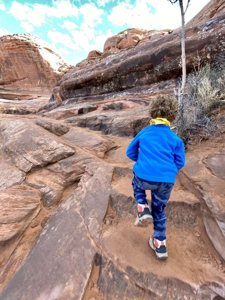 Le début de la rando offre un vaste panorama, sans cesse en montée. Après ¾ d’heure de montée ininterrompue, je suis crevé et je dépose Noah sur un plateau qui au début me semblait être le point haut de la rando et qui en fait ne l’est visiblement pas. Il part se dégourdir les pattes en crapahutant dans les rochers ce qui prouve qu’il n’était absolument pas fatigué. Virginie a une théorie intéressante sur le sujet. Les vastes paysages l’ennuie et c’est pour cela qu’il dit qu’il est fatigué. Si c’était une forêt ce serait une autre histoire. Oui mais s’il y avait une forêt, on serait pas dans un parc désertique !