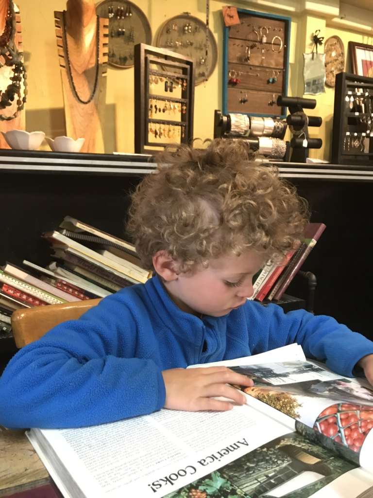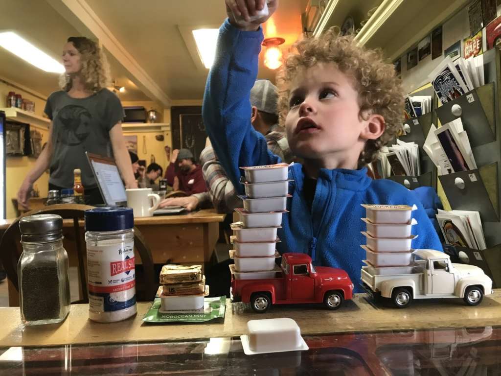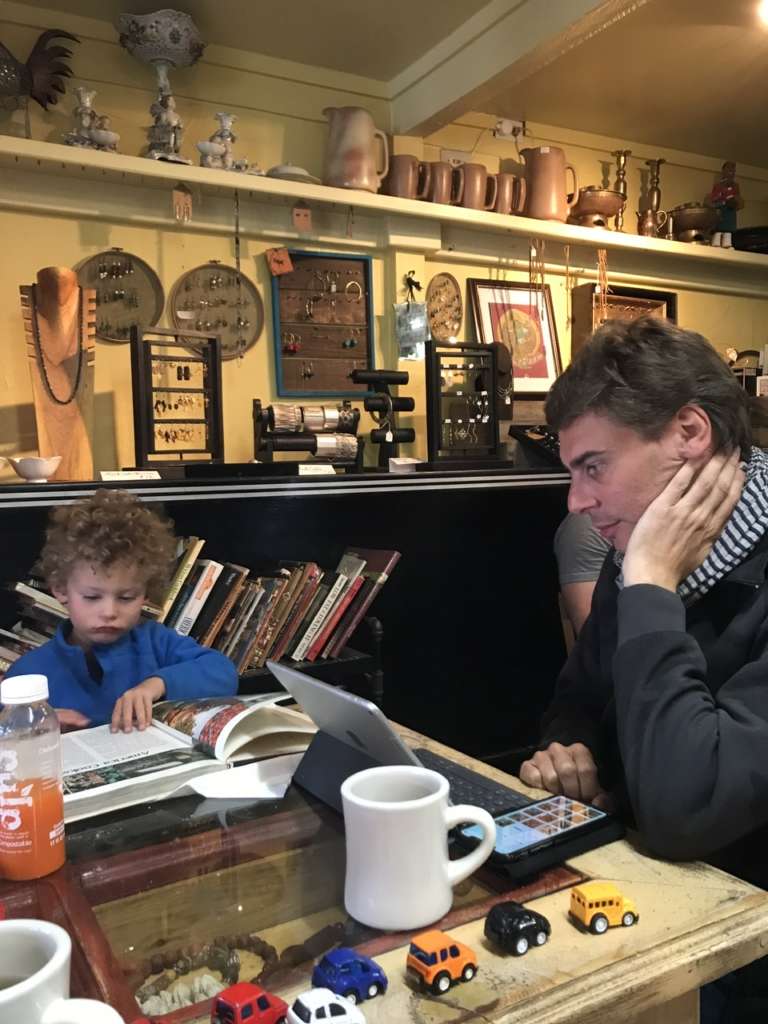 En petit déjeunant, chacun vaque à ses occupations. Noah joue aux voitures, Virginie achète la moitié de la boutique et vous envoie des petits mots, moi je charge les photos pour le blog et me met sur les billets en retard.