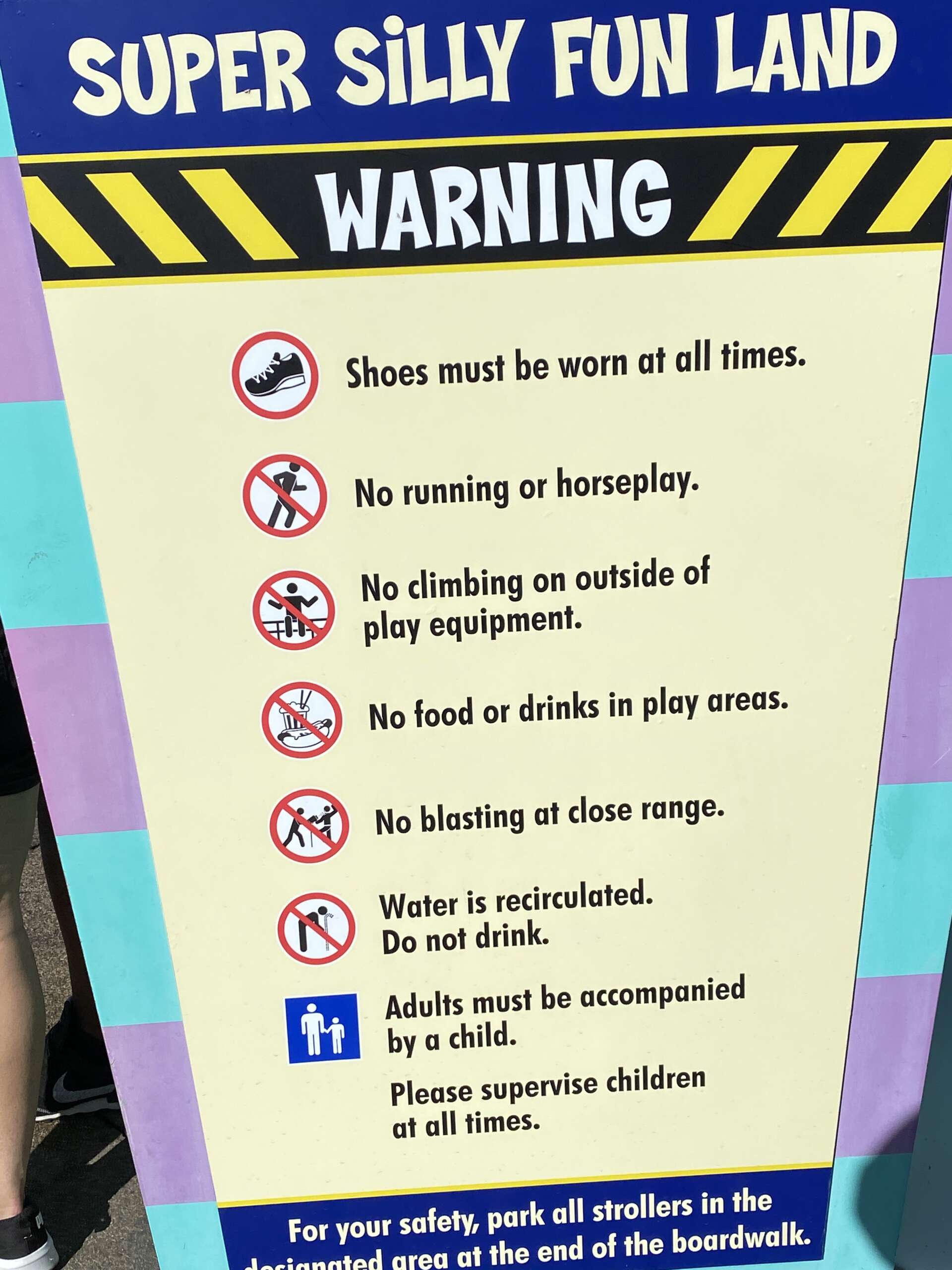 En sortant de là, on tient parole, et on va a Super Silly Fun land. Mais qu’est ce-donc ? Un espace de jeux d’eau réservé aux enfants. Vous voyez là, sur l’affiche d’entrée . Il est indiqué qu’un adulte doit obligatoirement être accompagné d’un enfant !!