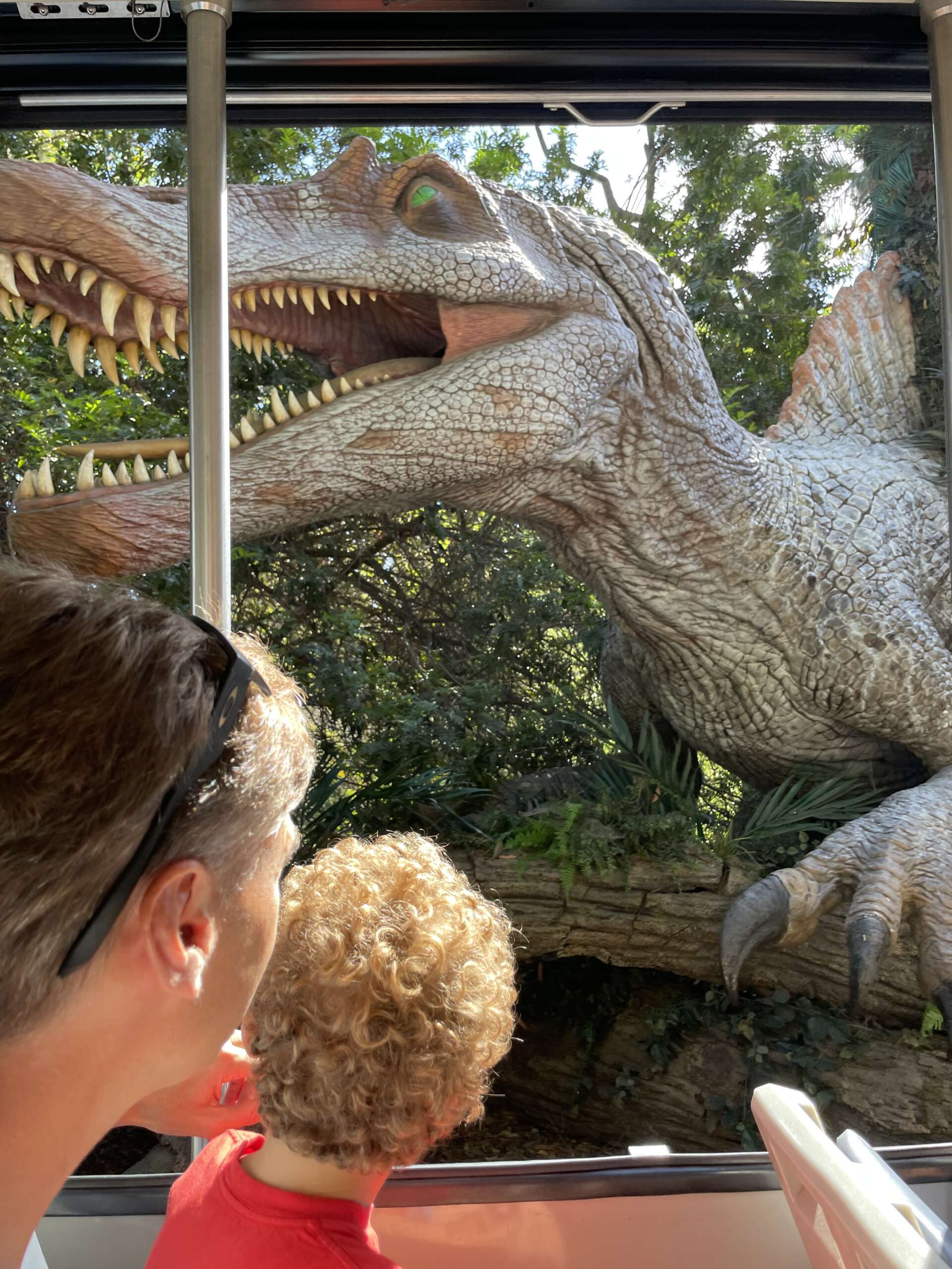 La barre de sécurité commence à se refermer sur nos genoux et déjà Noah a l’air un peu moins enjoué. J’essaye d’être positif et pendant les 2-3 premières minutes j’y arrive car on se met à déambuler doucement dans la jungle et un aquarium qui certes a une créature gigantesque qui vient d’engloutir sous nos yeux un grand requin blanc pour son petit déjeuner, mais les bruits autour de nous sont bucoliques.
