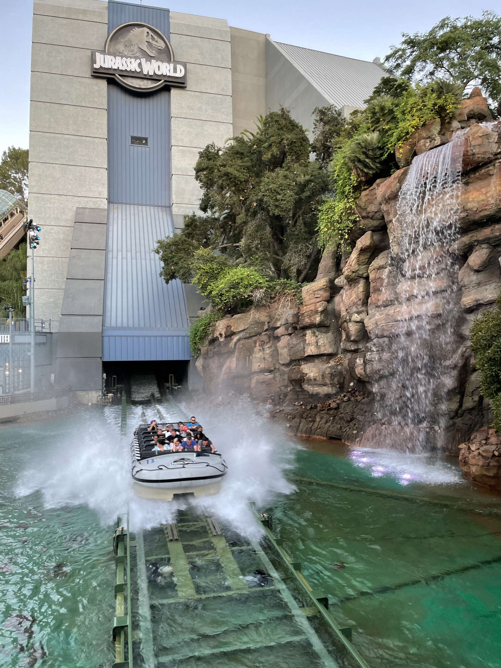 Il est presque 19h et il nous reste potentiellement une attraction, celle de Jurassik Park. Anouk nous a dit que c’était absolument génial et à faire ce qui a motivé Virginie au début. Moi je ne voyais pas bien comment ça pourrait leur plaire à tous les deux vu que c’est quand même un gros splash à la fin et que je doutais qu’avec le thème de Jurrasik park ils aient fait un truc gentil et bucolique.
