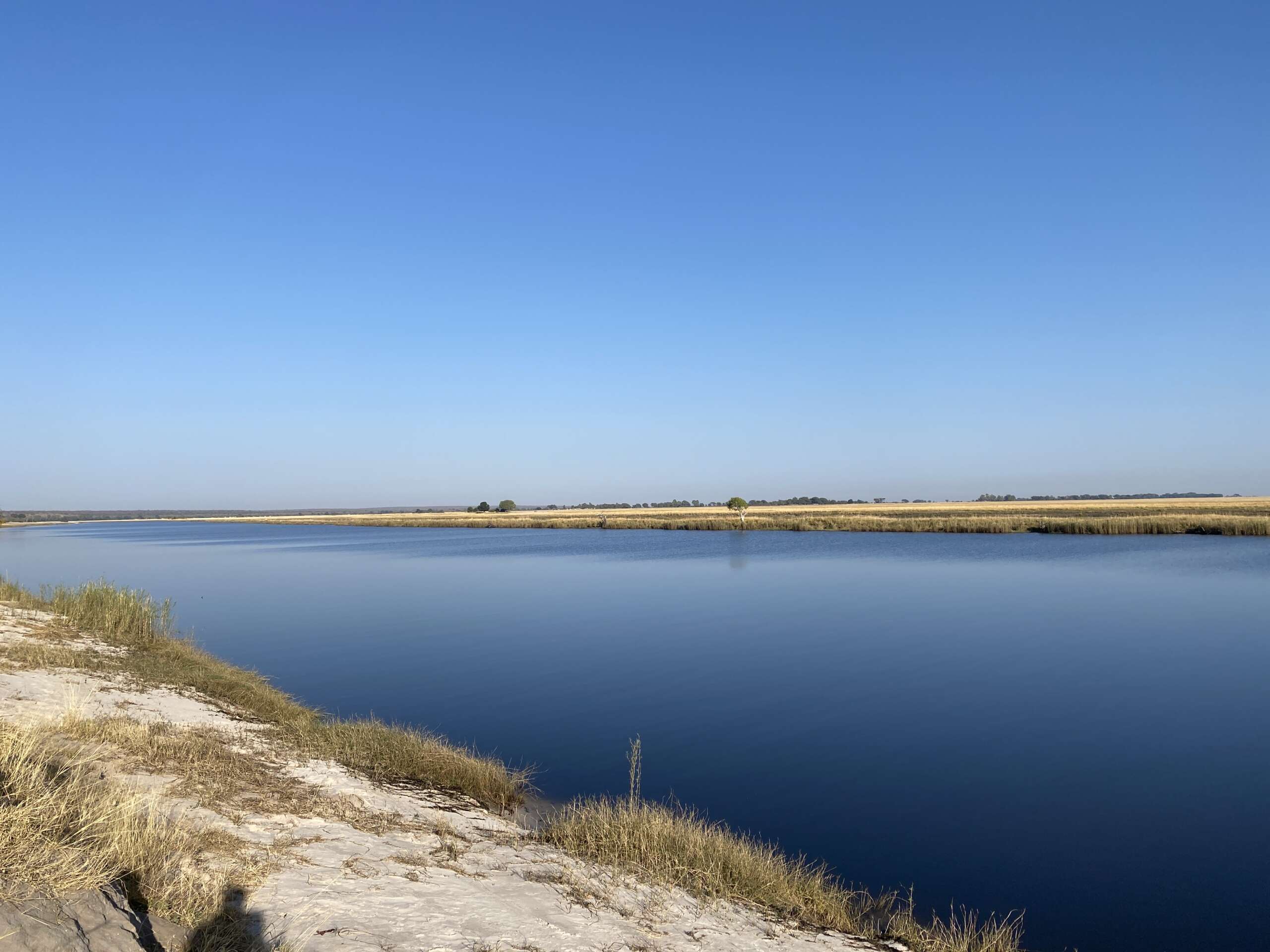 A cet endroit le Chobe fait au moins 150 mètres de large. Les éléphants viennent sur l’ile régulièrement pour leur herbe tendre. Ils ont en effet besoin de varier leur nourriture entre les racines des arbres très nutritives mais qui abîment fortement leurs molaires, et l’herbe tendre de rivière peu nutritive, mais qui les apaisent.