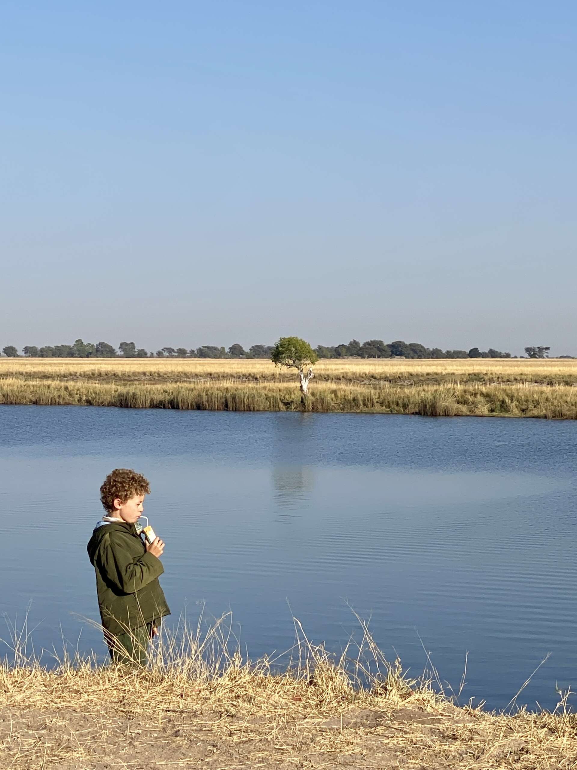 Pendant ce temps on remonte tranquillement le long des berges. L’occasion de voir de près des crocodiles, et des Améthyste Kingfisher. Noah embraye et lui demande quel est son animal préféré (Noah lui, change 2 à 3 fois par jour l’ordre de ses 8 animaux préférés). Sans hésitation, Quentin répond le Bush Baby.