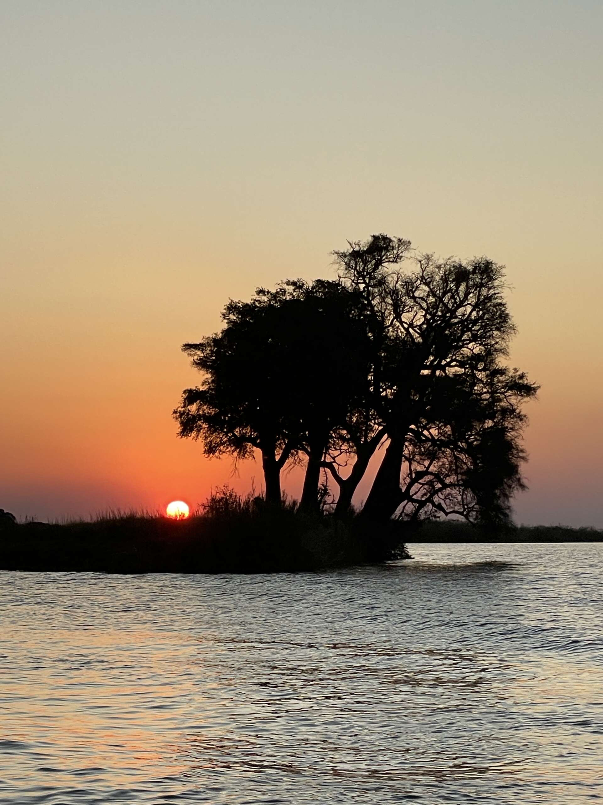 Alors qu’on arrive sur une des portions la plus large de la rivière Chobe, une dizaine d’éléphants – dont des tous petits – s’arrêtent sur la berge avec l’intention de traverser le fleuve. La matriarche en tête balançant de la tête observant le moment le plus propice pour traverser.