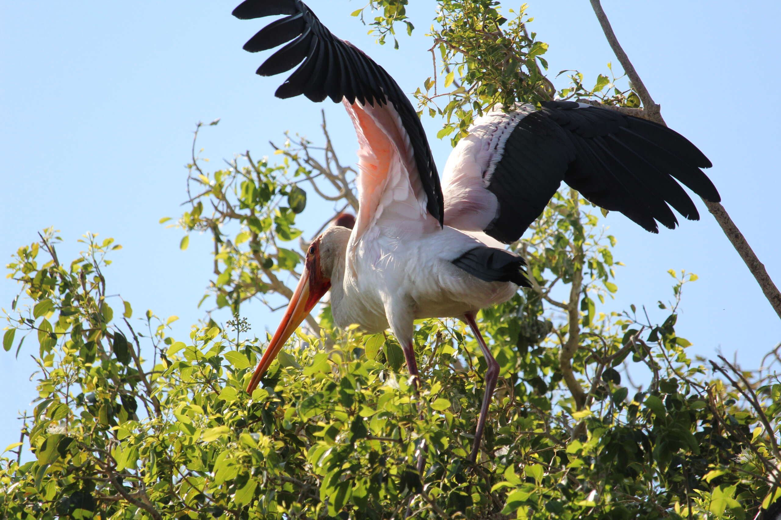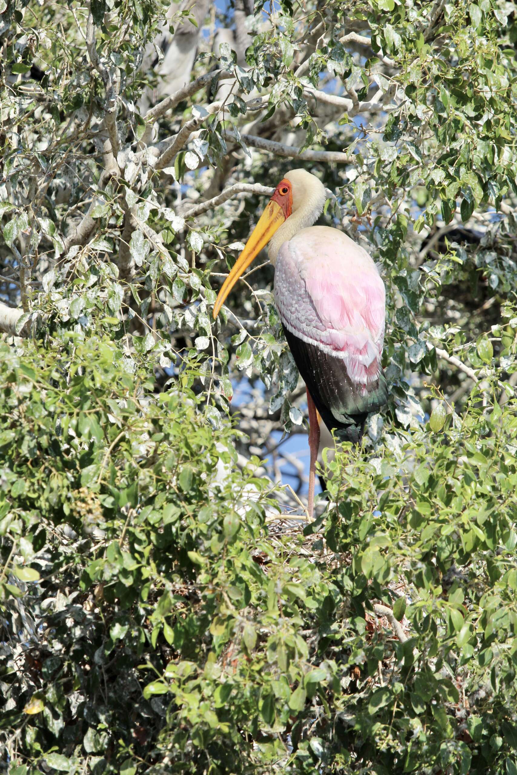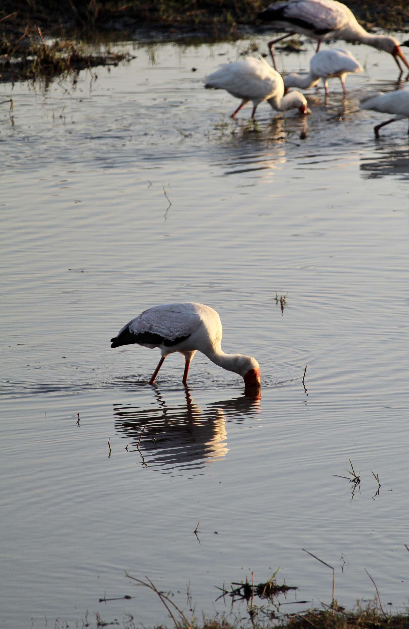 D’abord des oiseaux – ca c’est classique car ils viennent enlever les parasites ou nettoyer les dents. Puis une spatule, puis un autre oiseau type oyster catcher (mais c’est pas ça) qui passe au ras de l’eau laissant juste sur des dizaines de mètres une fine découpe dans l’eau avec son bec comme si c’était dessiné au stylo plume, et enfin, un troupeau d’éléphant qui traverse derrière les hippos.