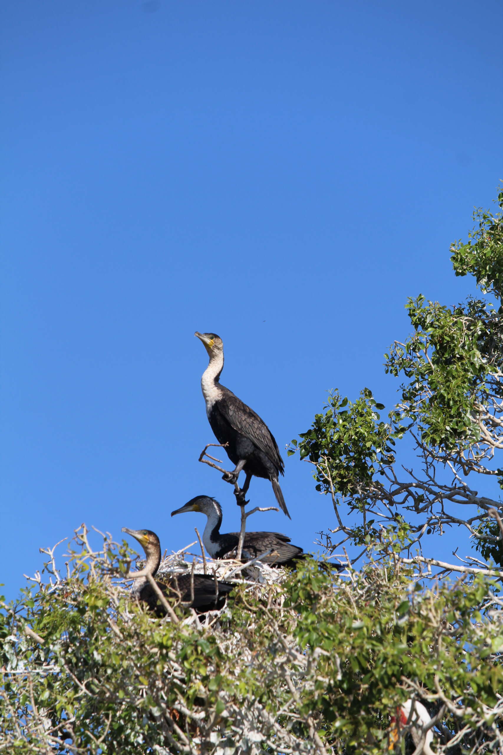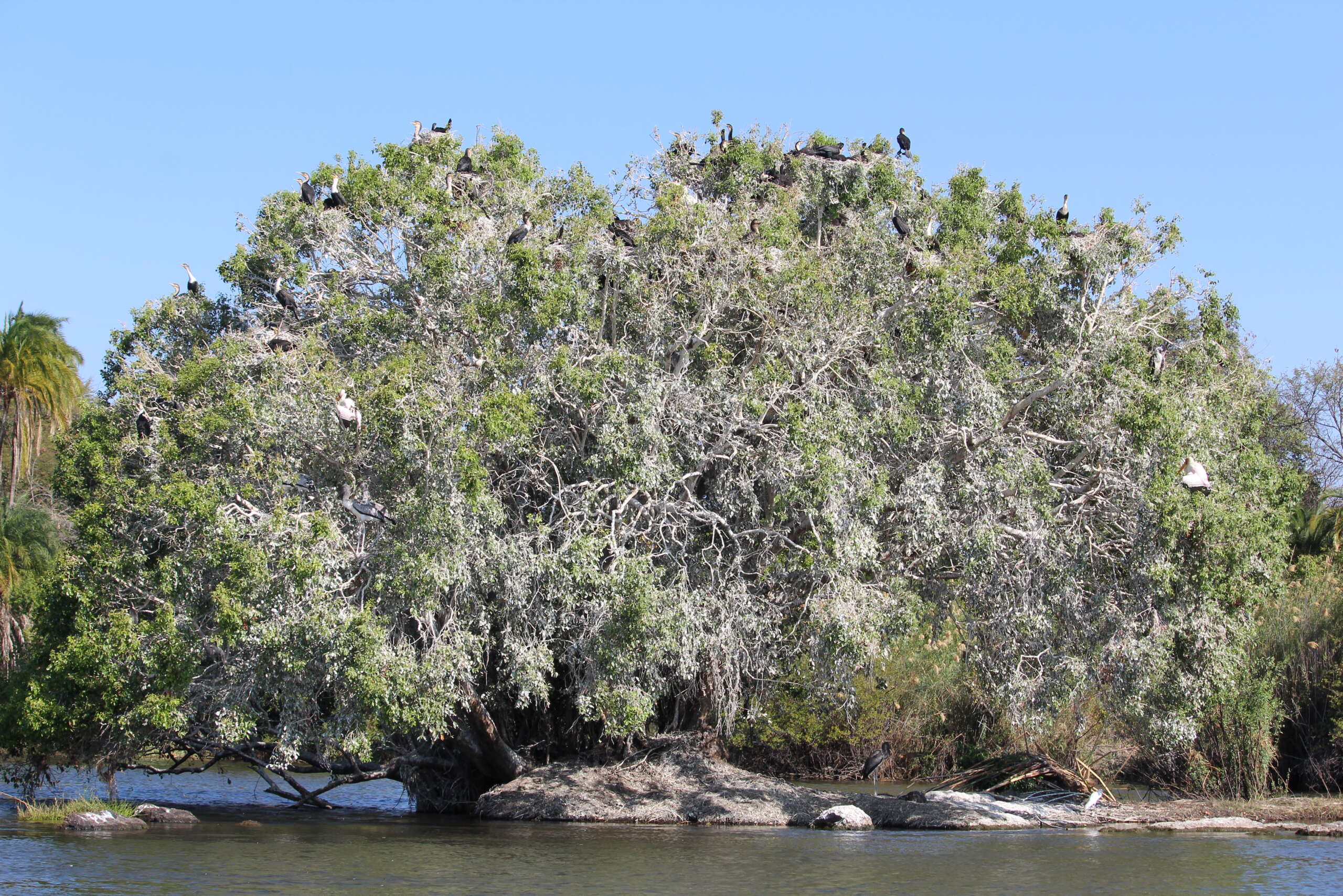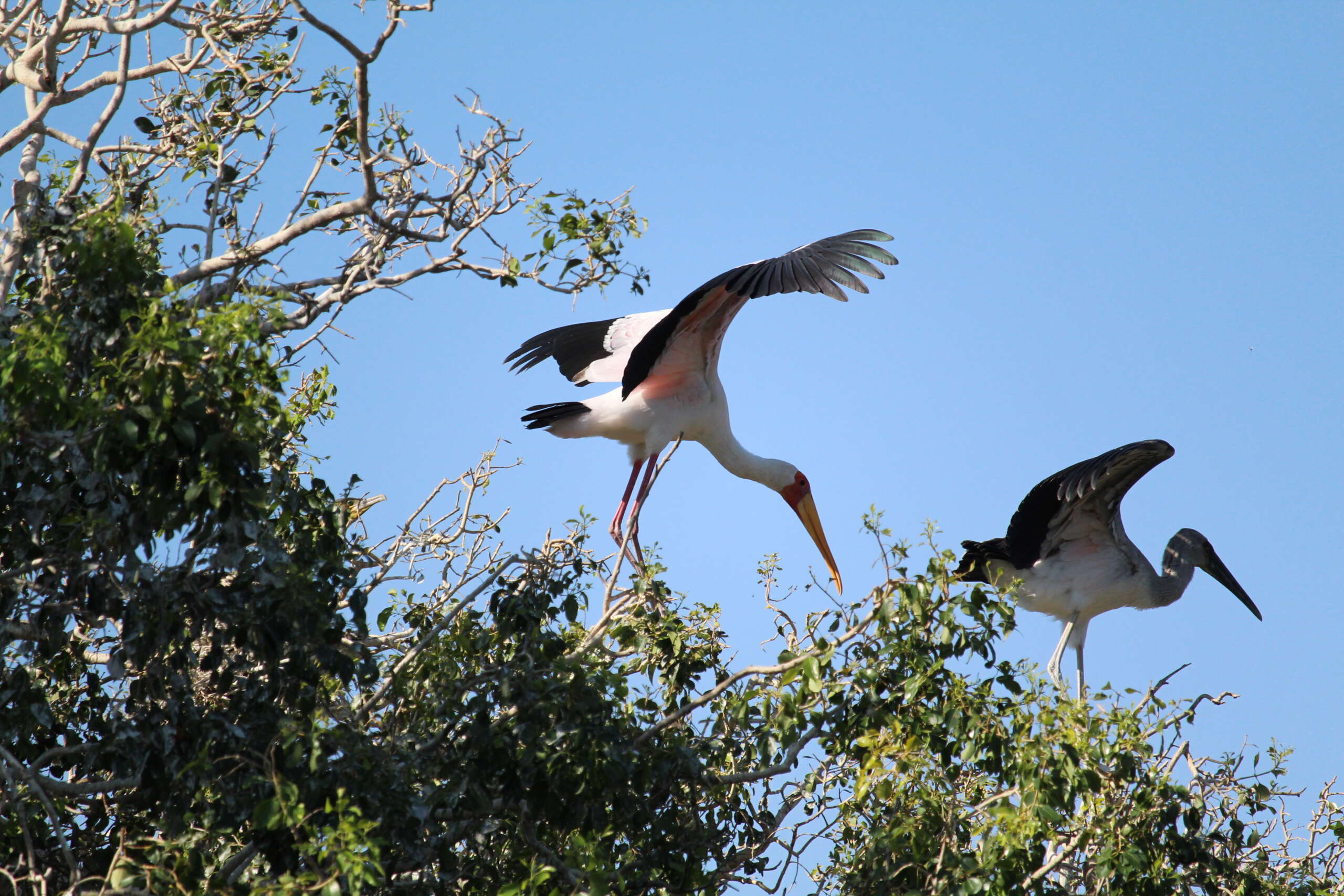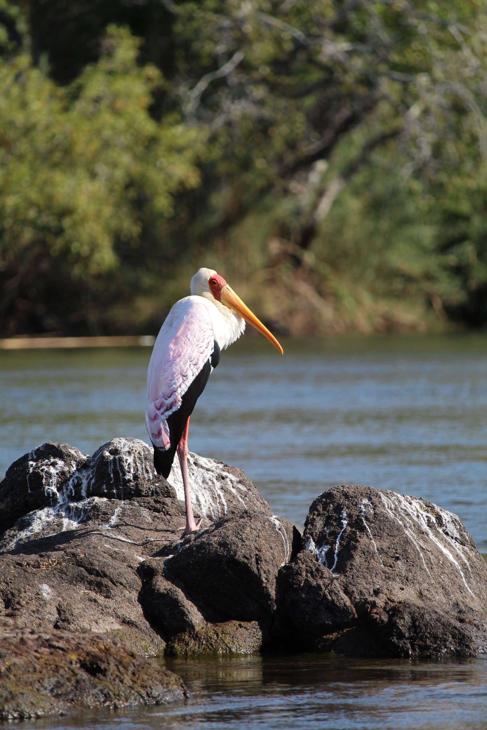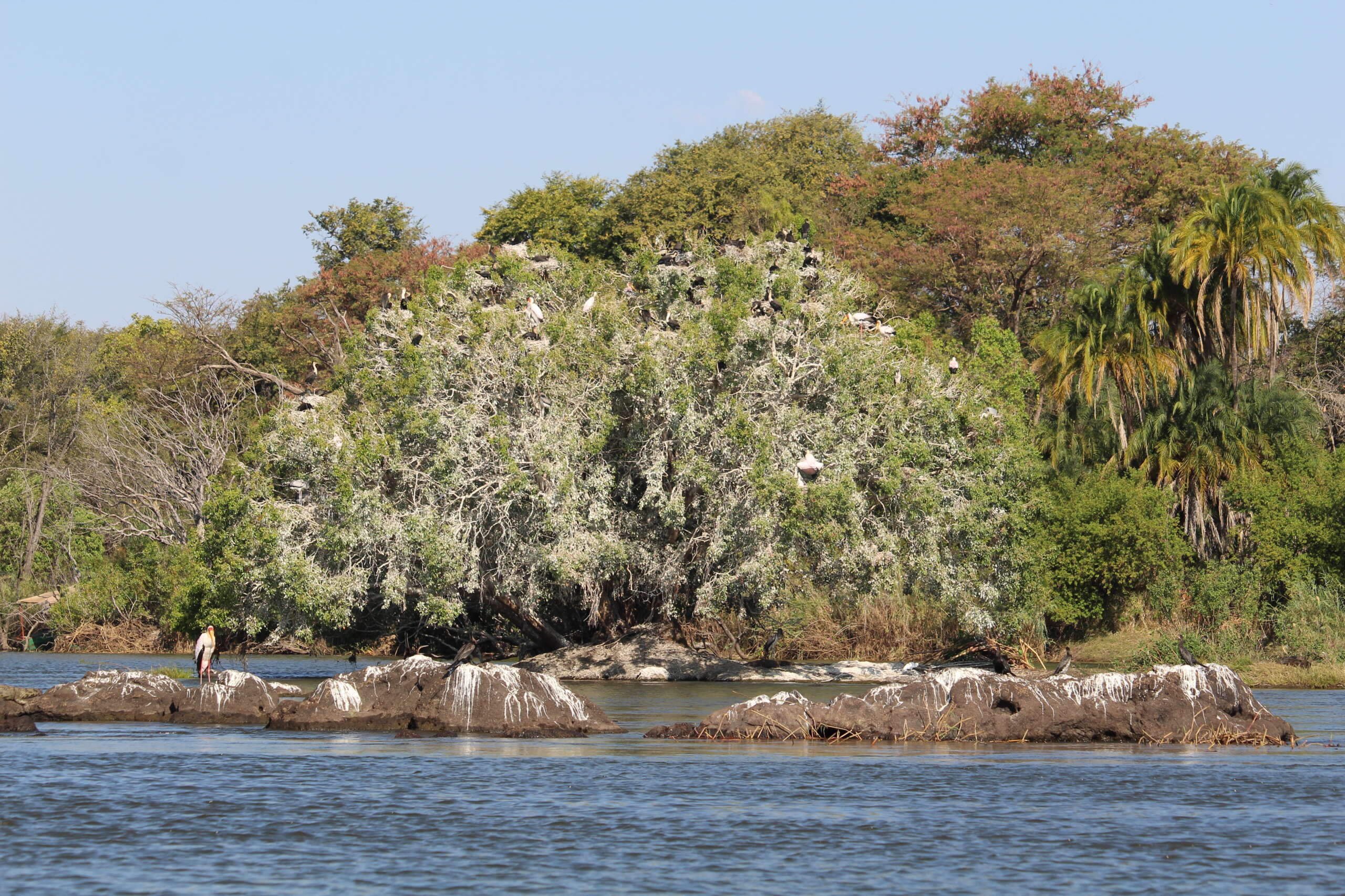Dès le début au lieu de partir comme tout le monde vers le parc il nous fait partir en sens inverse dans la direction des chutes Victoria et c’est super car avec le petit bateau on passe une première barre de rochers et on s’approche de 2 grands arbres littéralement recouverts d’oiseaux avec au pied les crocodiles qui attendent qu’un petit tombe du nid.