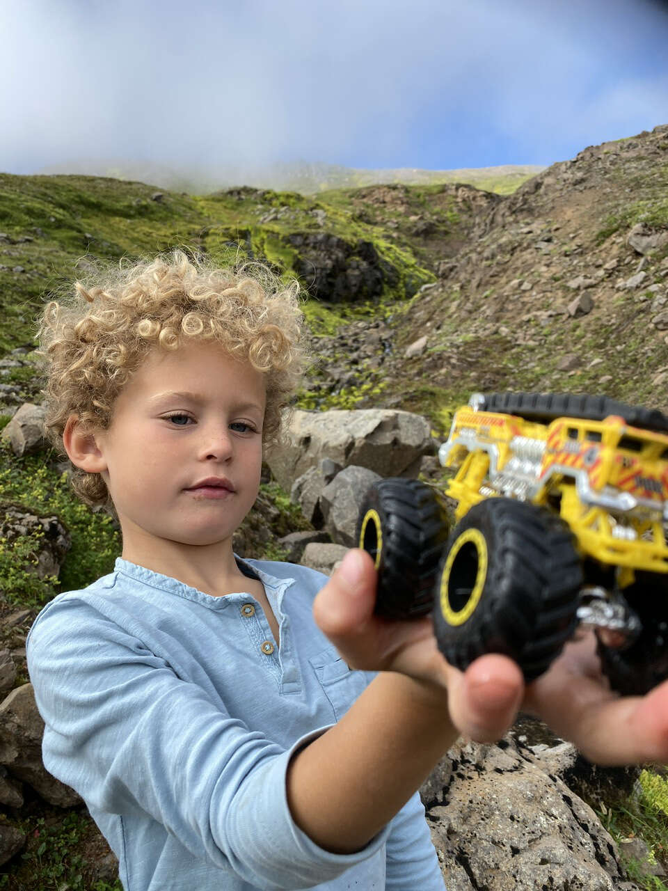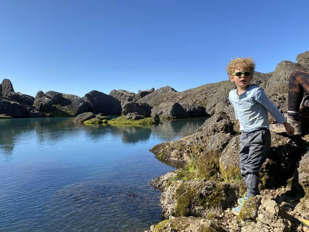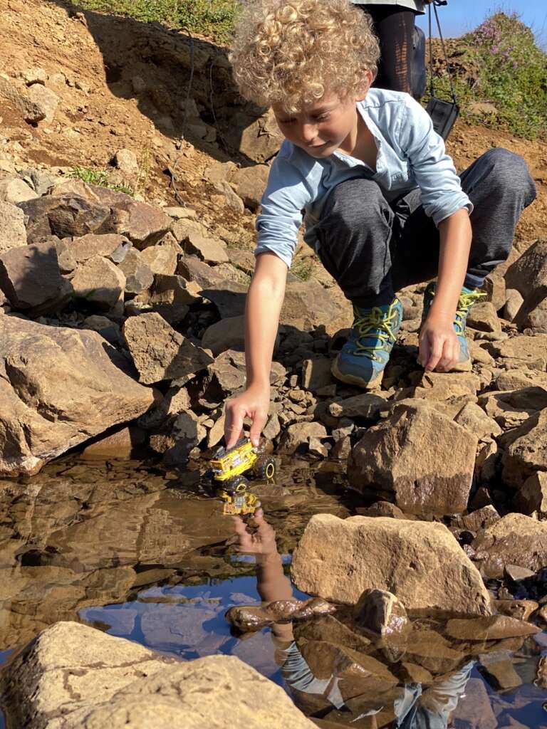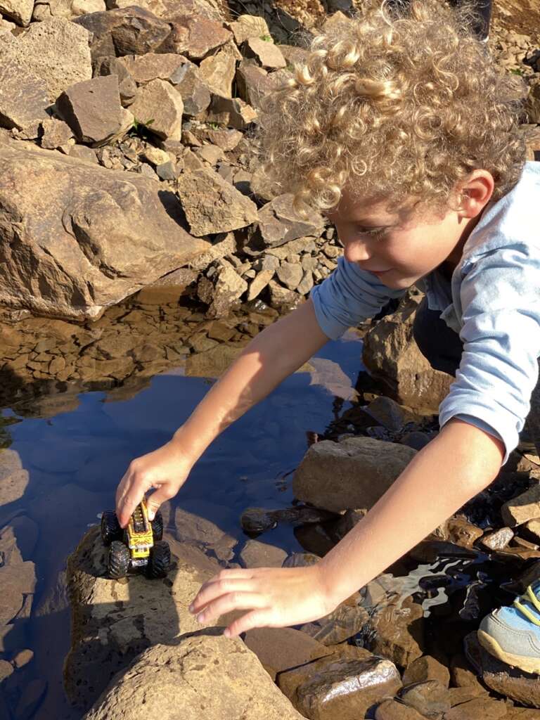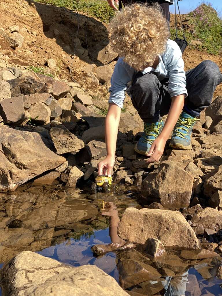 On crapahute dans les rochers en en faisant le tour, puis on trouve un moyen de descendre jusqu’au lac et Noah poursuit ses aventures avec son 4×4. Tout d’un coup on entend un plouf. Il y a un jeune qui n’a pas pu résister à l’idée de plonger dans l’eau. Il a tenu 5 secondes et remonte frigorifié. Bonjour le choc thermique, mais bravo ! Noah préfère se mettre à faire des ricochets.