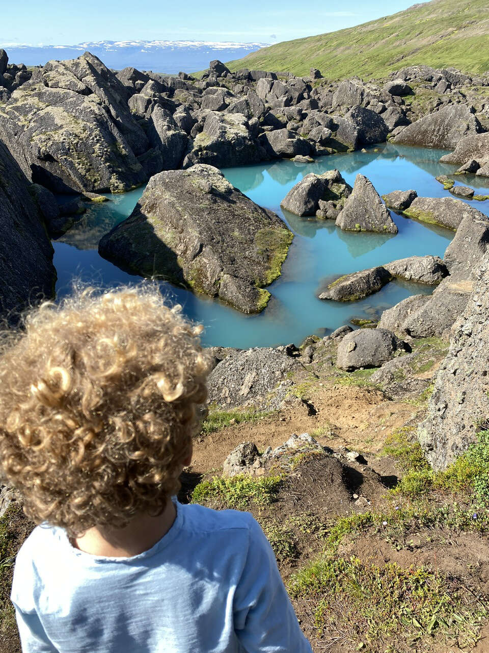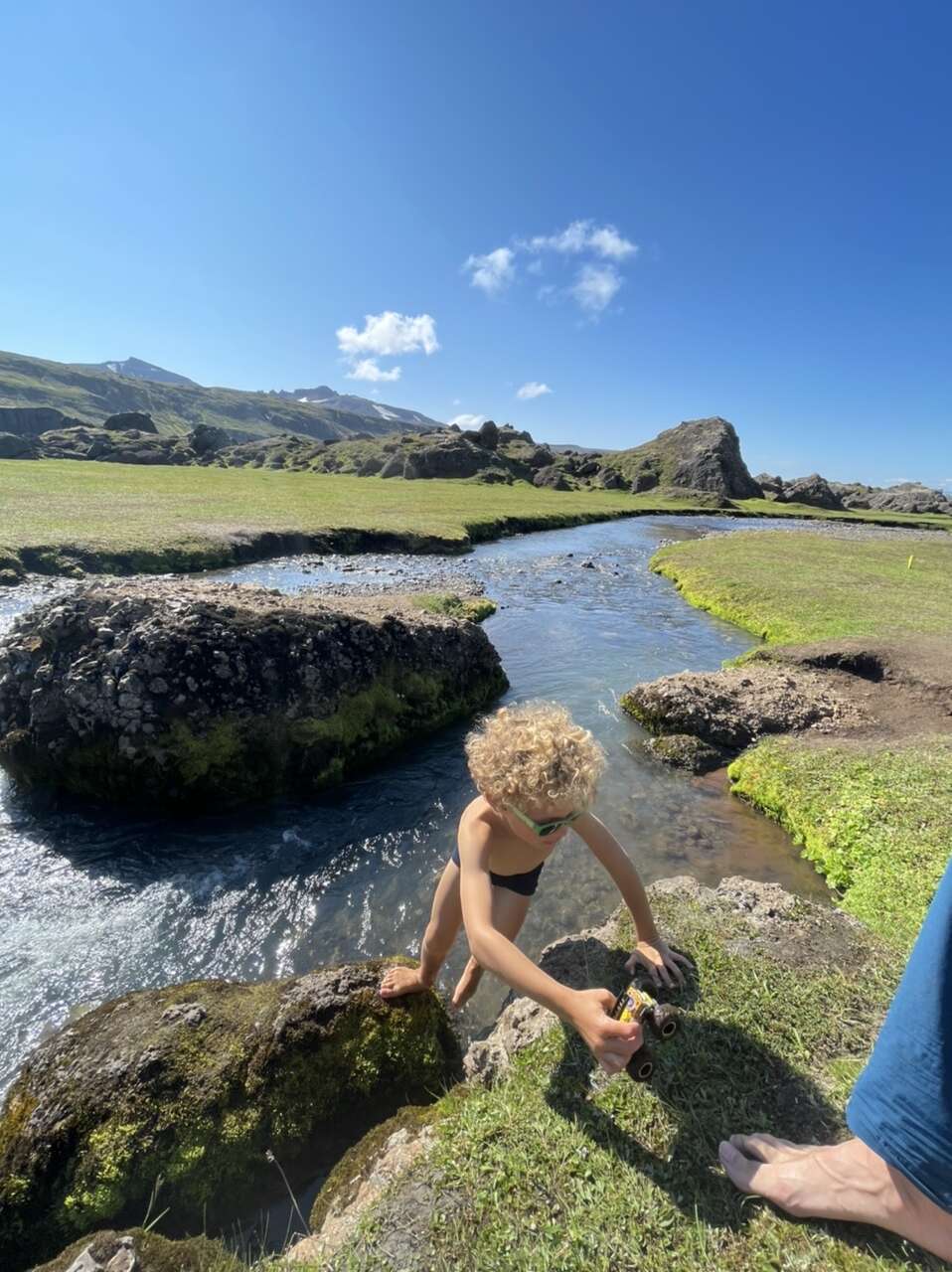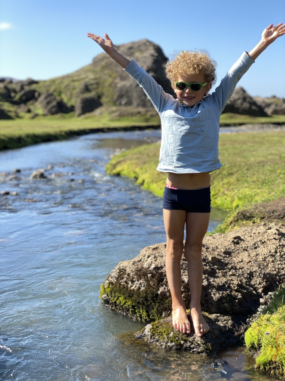On crapahute dans les rochers en en faisant le tour, puis on trouve un moyen de descendre jusqu’au lac et Noah poursuit ses aventures avec son 4×4. Tout d’un coup on entend un plouf. Il y a un jeune qui n’a pas pu résister à l’idée de plonger dans l’eau. Il a tenu 5 secondes et remonte frigorifié. Bonjour le choc thermique, mais bravo ! Noah préfère se mettre à faire des ricochets.