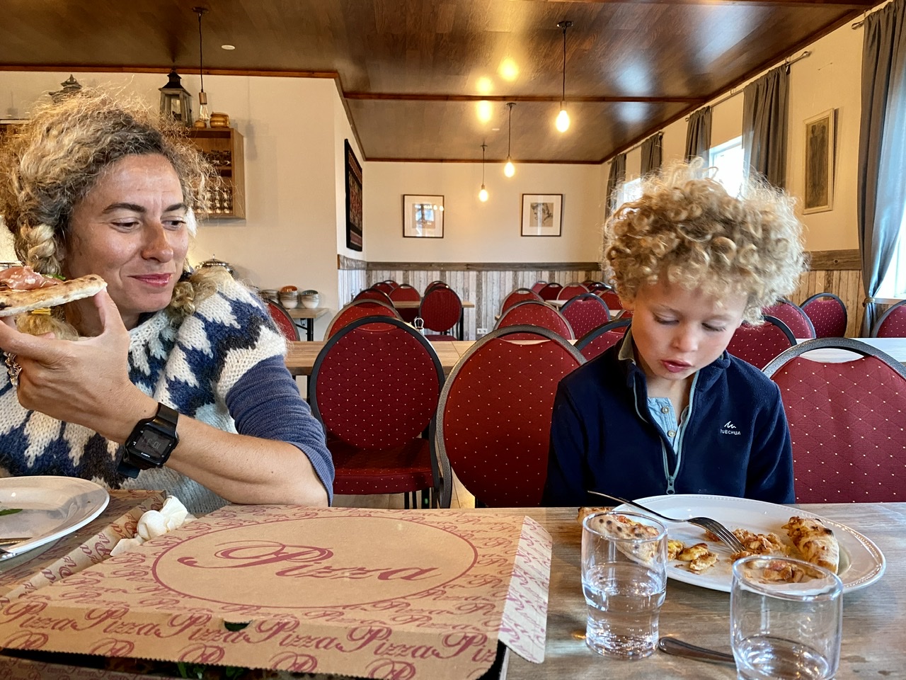 De retour dans notre chambre, comme Noah a bien marché, on le laisse voir la fin du dessin animé « les mondes de Ralph ». Sauf que quand celui-ci est enfin terminé, et qu’on se dirige vers le restau de l’hôtel, celui-ci s’avère en fait fermé pour la soirée. Le manager nous explique qu’il avait donné une journée off à son staff. On va donc sur sa proposition se chercher des pizzas en ville (enfin pour être plus précis dans le micro-village) et on revient les manger dans son restau.