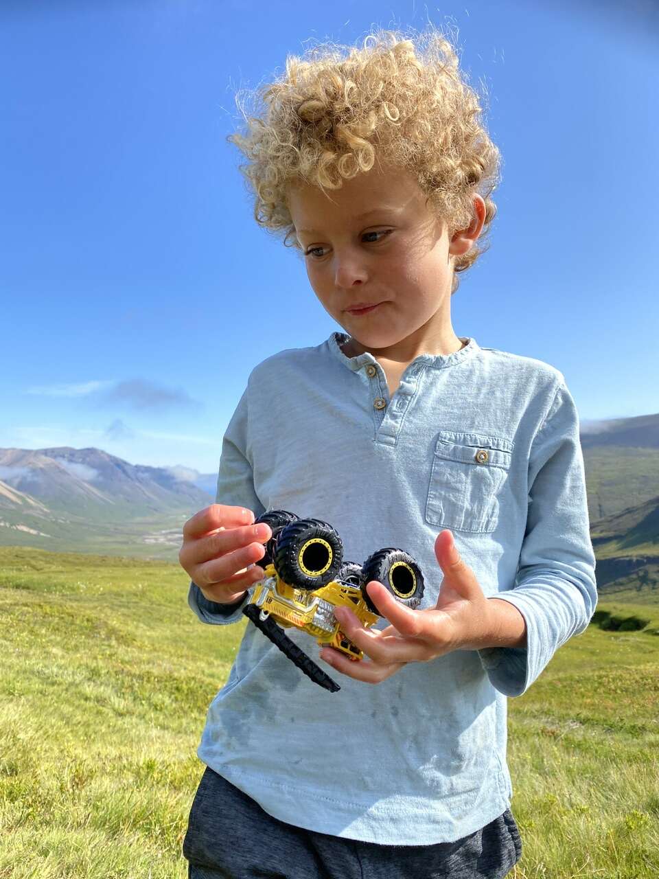 Noah a pris le petit 4×4 que Virginie lui a trouvé hier au Netto de la station-service et a accepté de marcher avec la promesse que ce serait le paradis des 4×4 ici. En effet, on traverse rapidement de nombreuses rivières et Noah se régale à faire traverser son 4×4. Du coup ça ralentit un peu le rythme vu qu’il avance courbé en deux. Comment il fait pour ne pas avoir mal au dos reste un mystère.