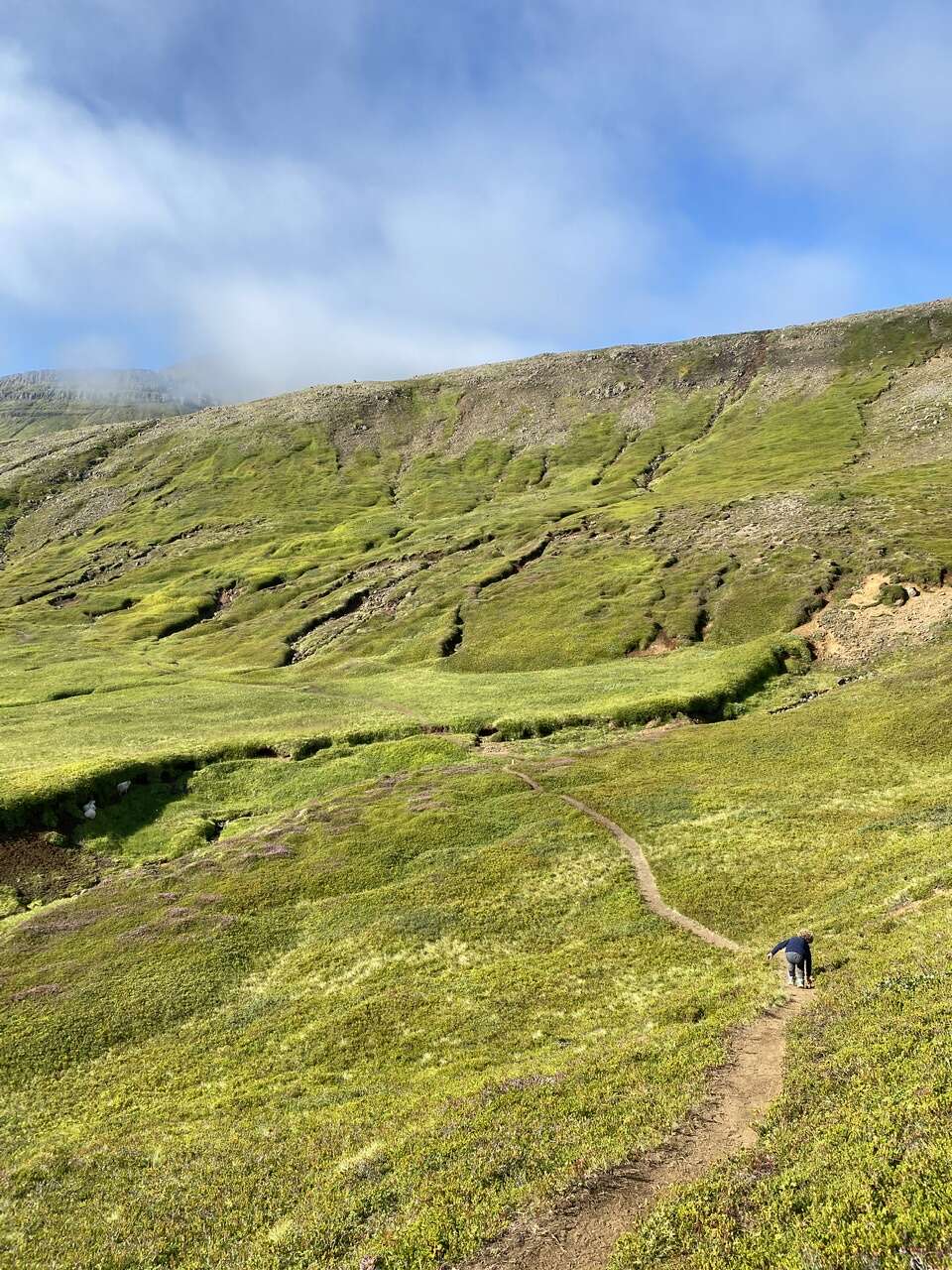 Le plus long, mais le plus facile, se fait via Vatnsskard. Il fait 7,5 km aller, donc comme vous êtes bons en maths, bing on en prenait pour 15km.